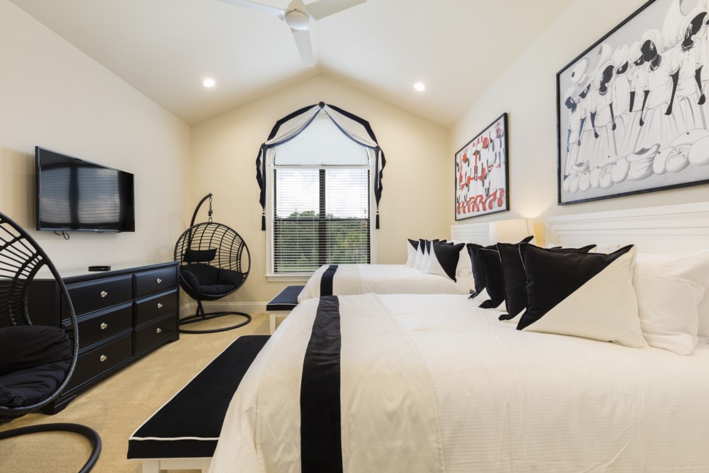A bedroom with 2x Queen sized beds, en suite (shower), 2x hanging chairs