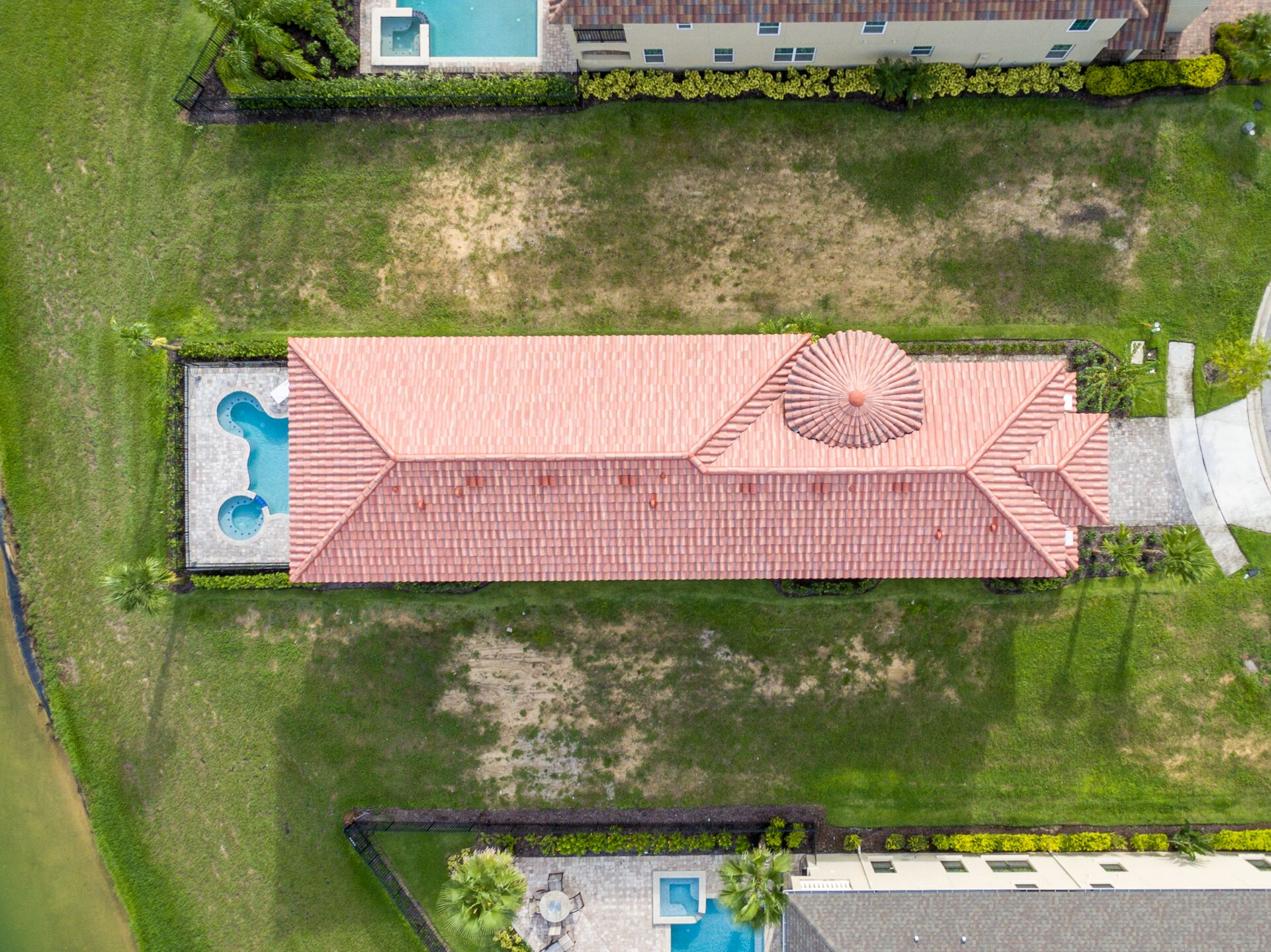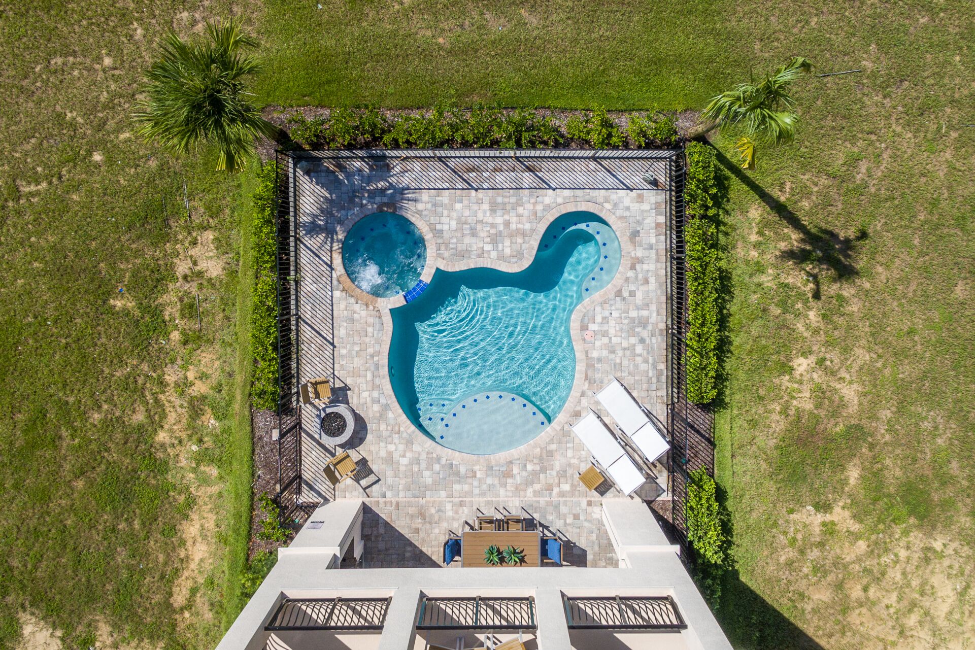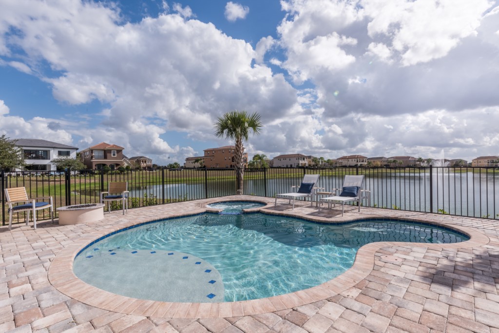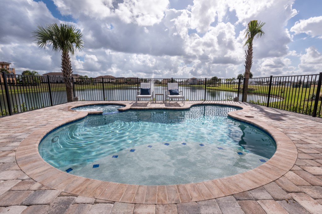 Extended south facing pool with spillover spa overlooking beautiful retention pond and fountain