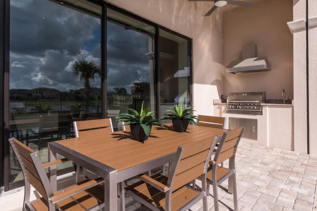 Covered lanai with a six seat patio table, three sun lounges, two seat fire pit area, gas bbq grill