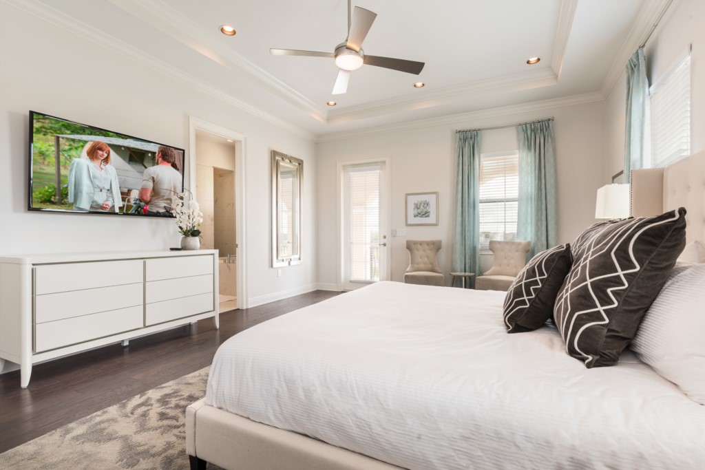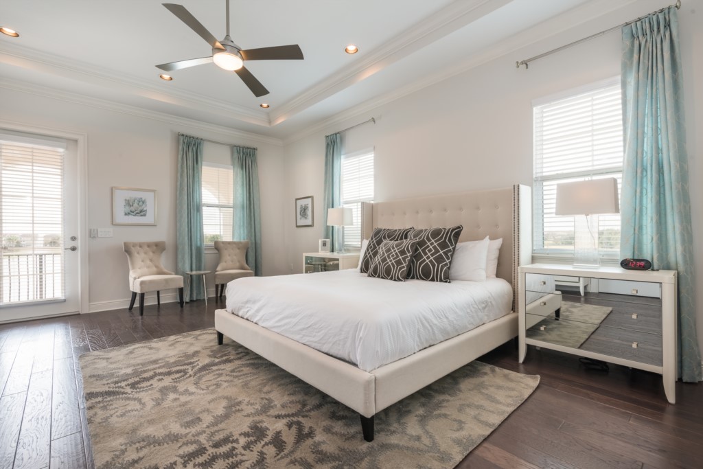 King sized master with en suite (shower inclusive of large rainfall shower head, tub, twin vanities) and balcony access over the pool and beautiful retention pond