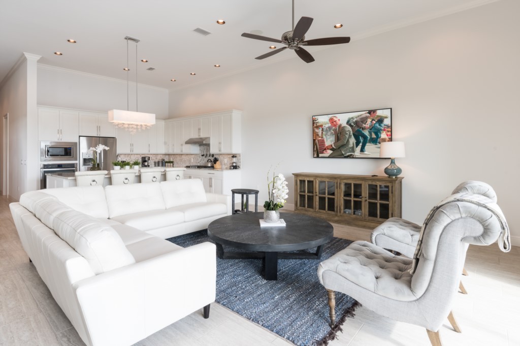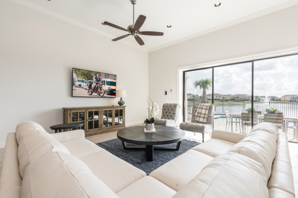 Spacious comfortable seating area with sectional sofa and 2 oversized accent chairs overlooking the pool deck through large sliding glass doors and beautiful retention pond with fountain