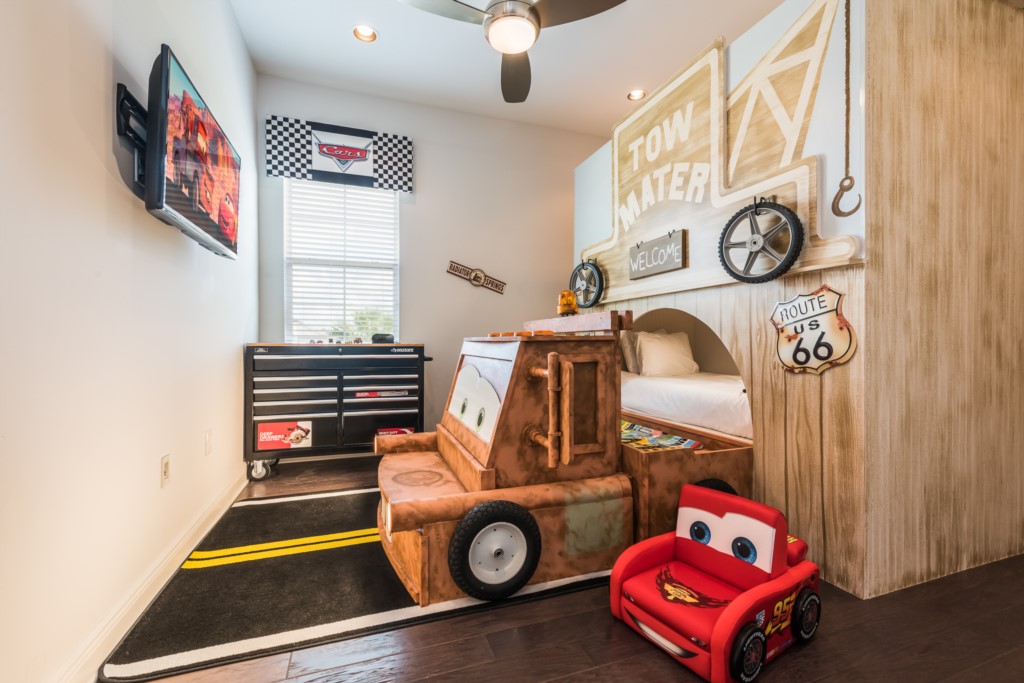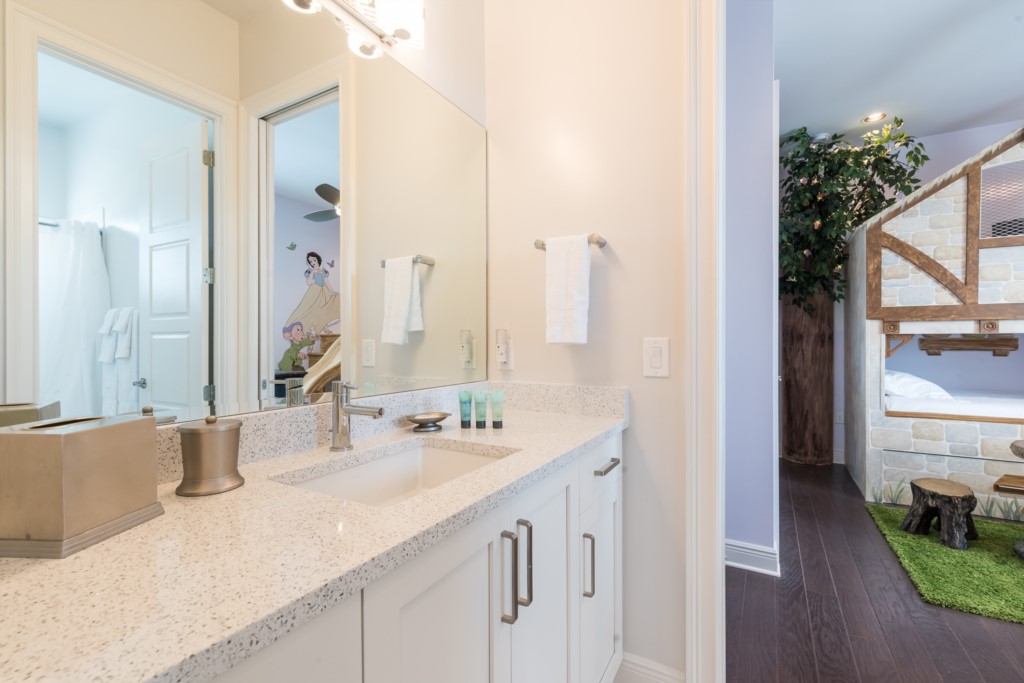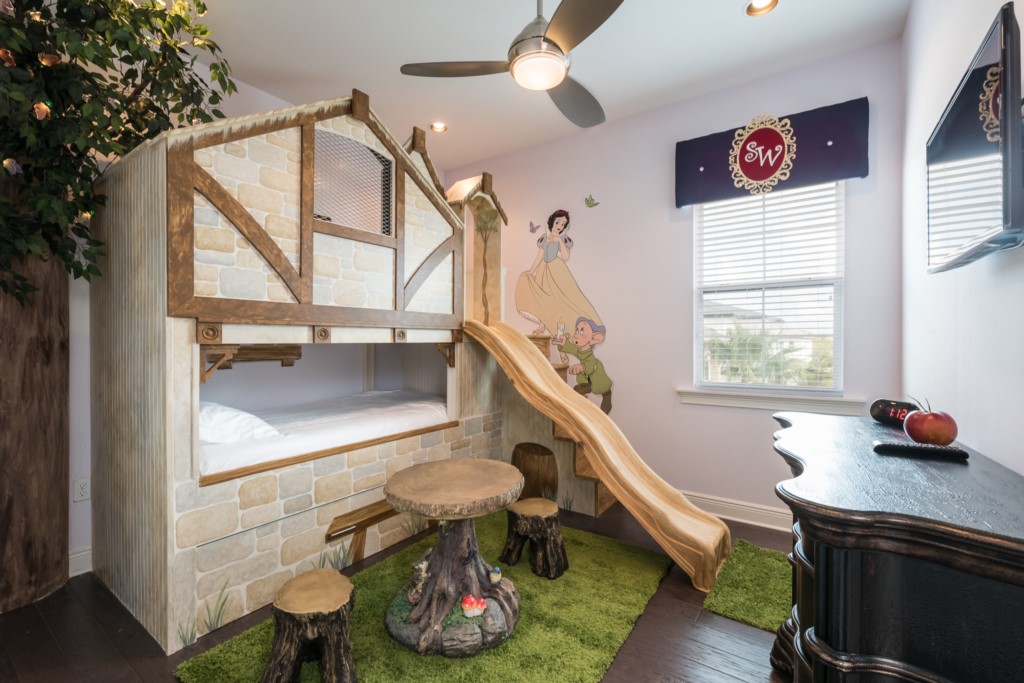 A “Snow White” themed bedroom with bunk beds (Twin/Twin bed) with an additional trundle shares Jack n Jill bathroom with a "Cars” themed bedroom with bunk beds (Twin/Twin)