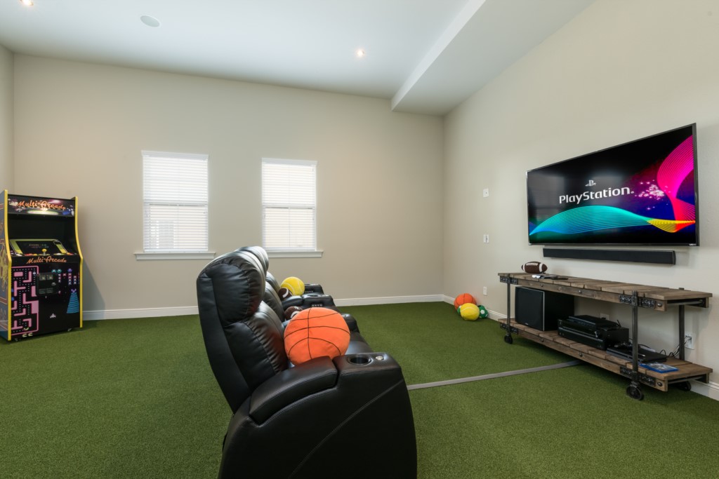 Games room including arcade machine and PS4 gaming console oversized TV and reclining theater seats.