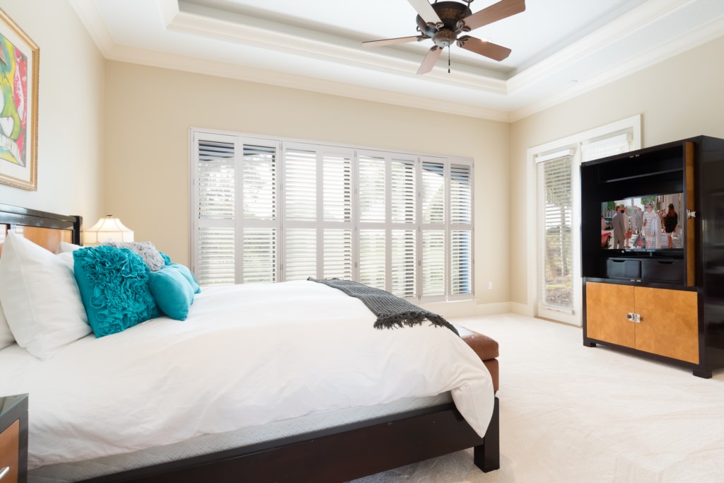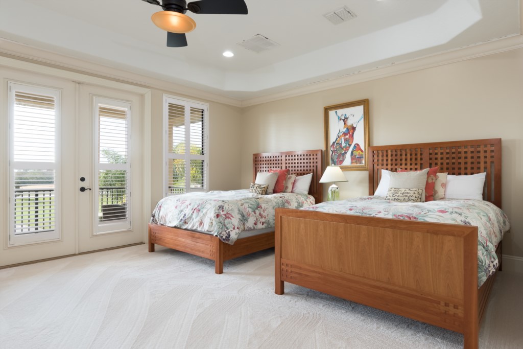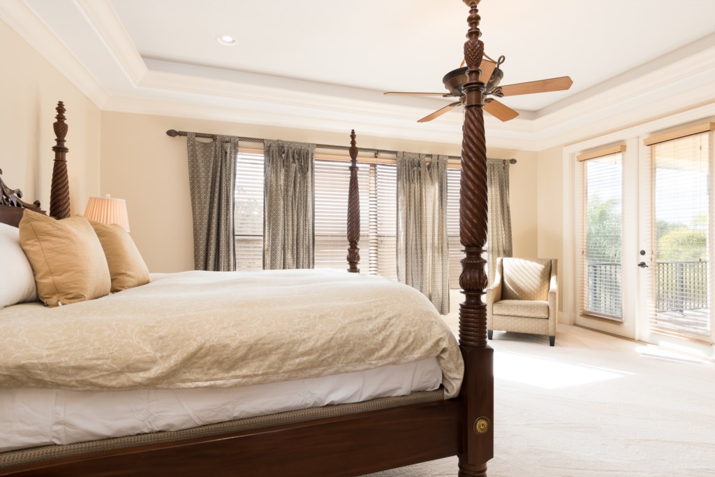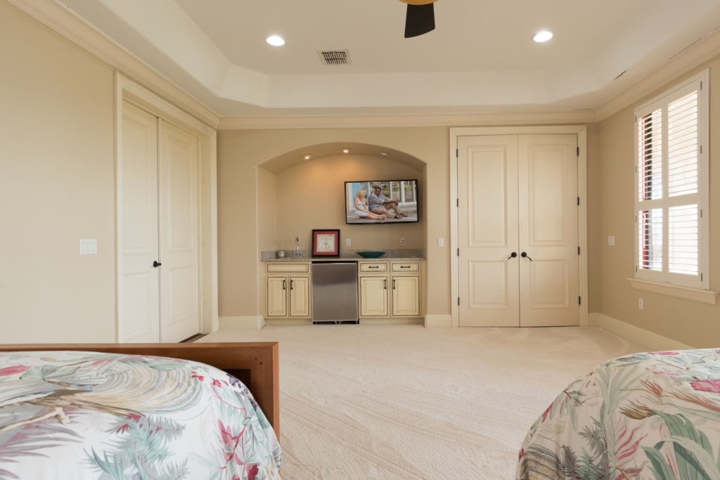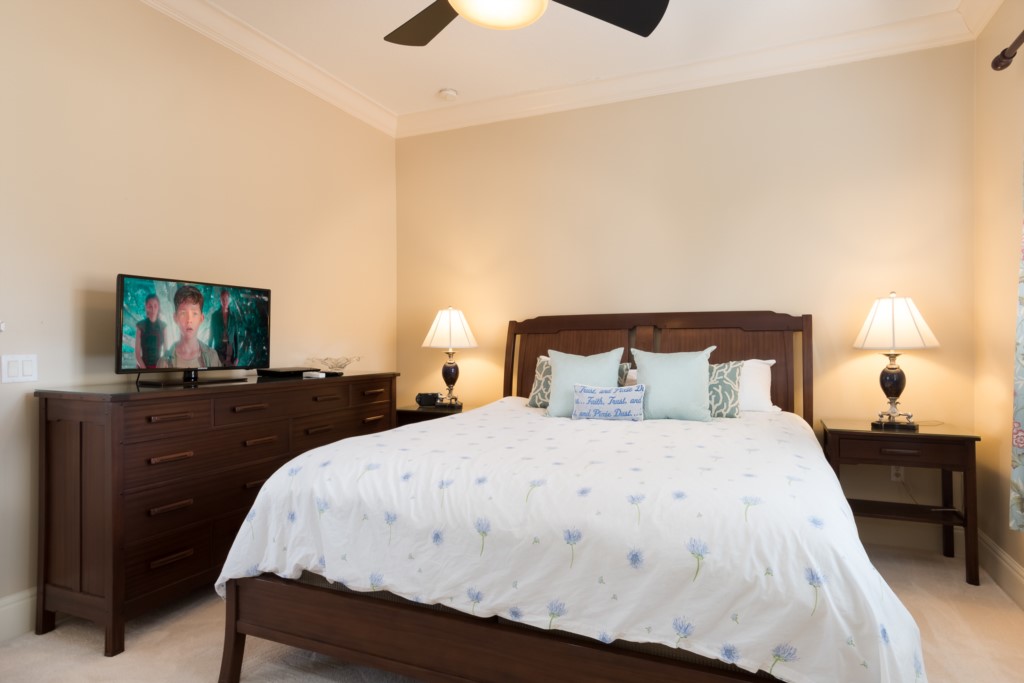 King sized Master (located downstairs) with en suite (shower, tub, twin vanities) and patio access