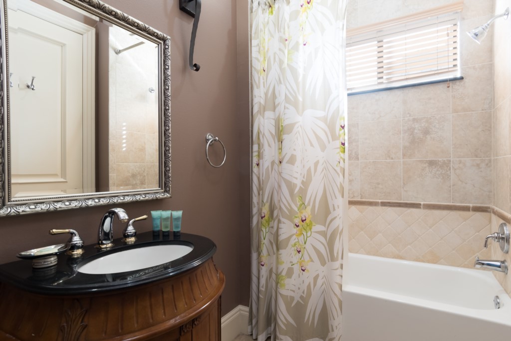 King sized bedroom (located downstairs) with shared family bathroom (shower/bath combo)