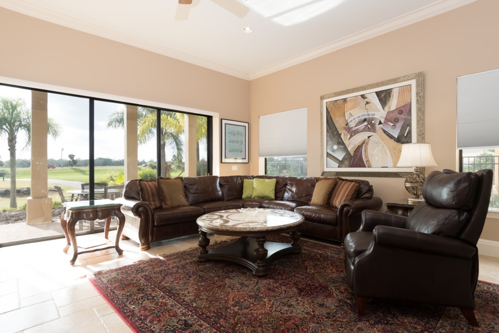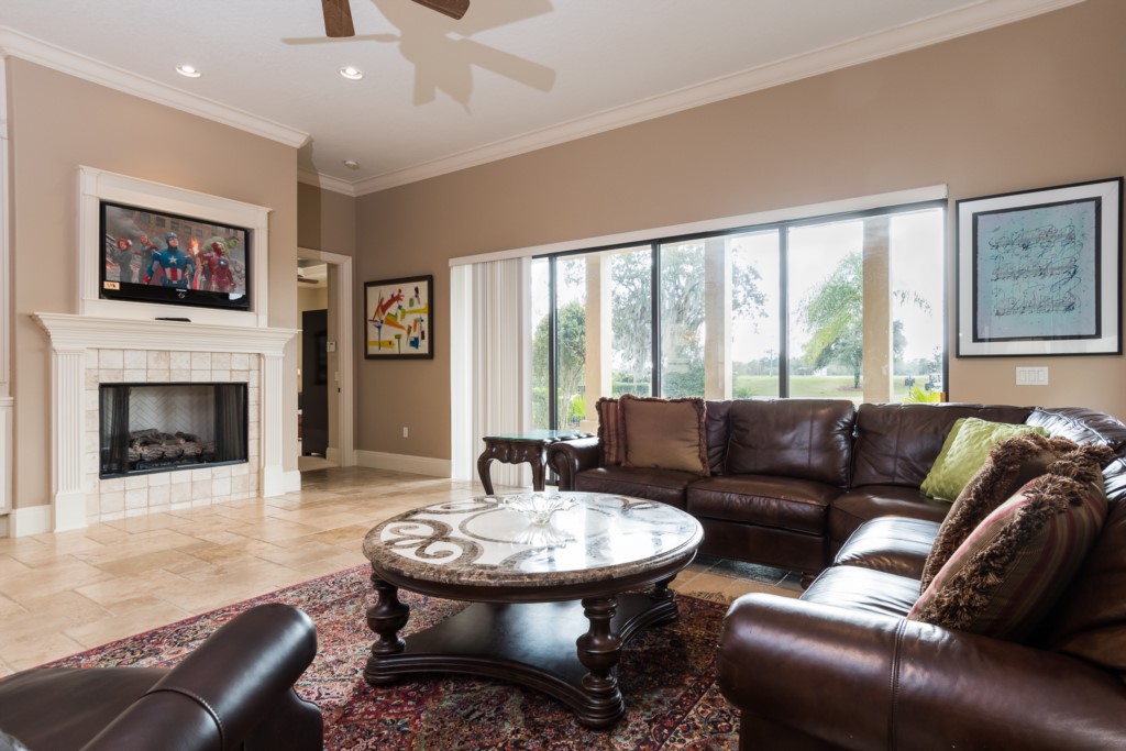 Spacious comfortable seating area with a leather sofa and accent chair overlooking the private pool deck through sliding glass doors, also has a feature fireplace