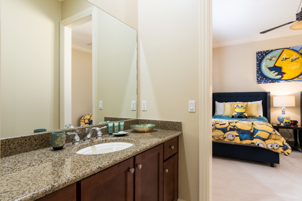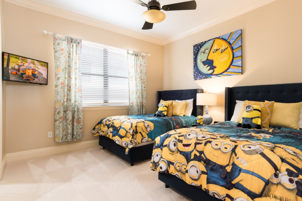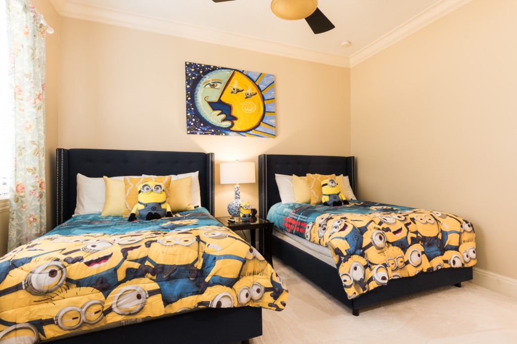 'Minions' themed bedroom (located upstairs) with 2x Full sized beds and an en suite (Jack/Jill style-shower/bath combo, 2x separate vanities) connecting to a King sized bedroom