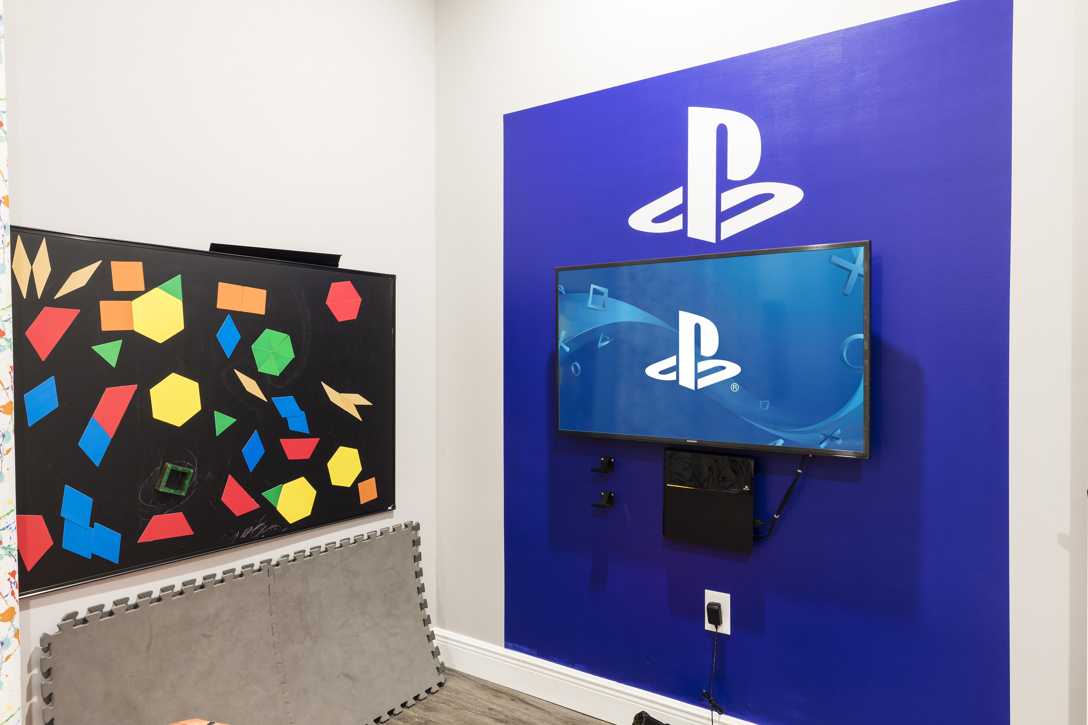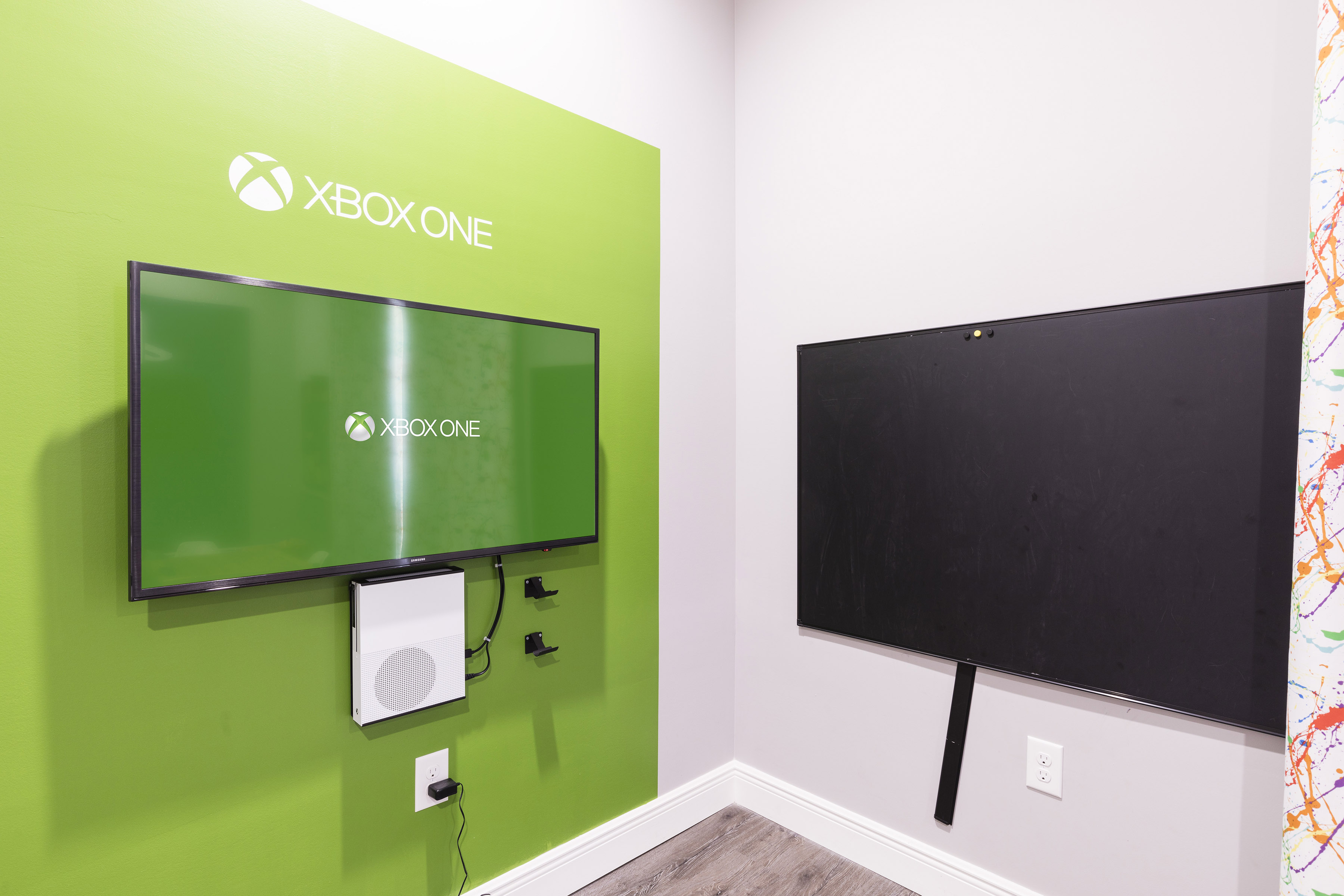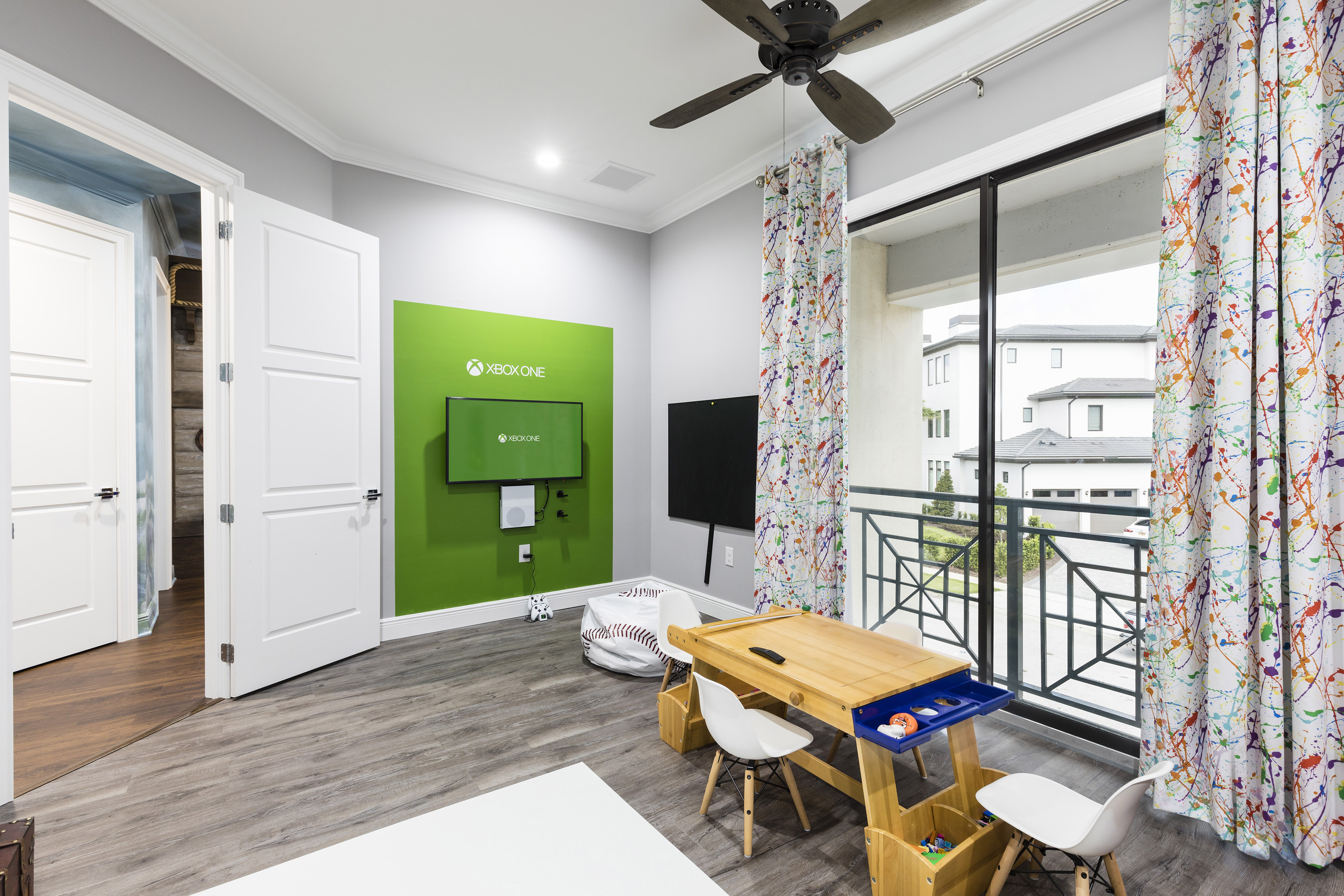 Play room has 2x large flat screen TVs with a Playstation and X-Box video game console, 2x bean bag chairs, and an arts/crafts kid's table