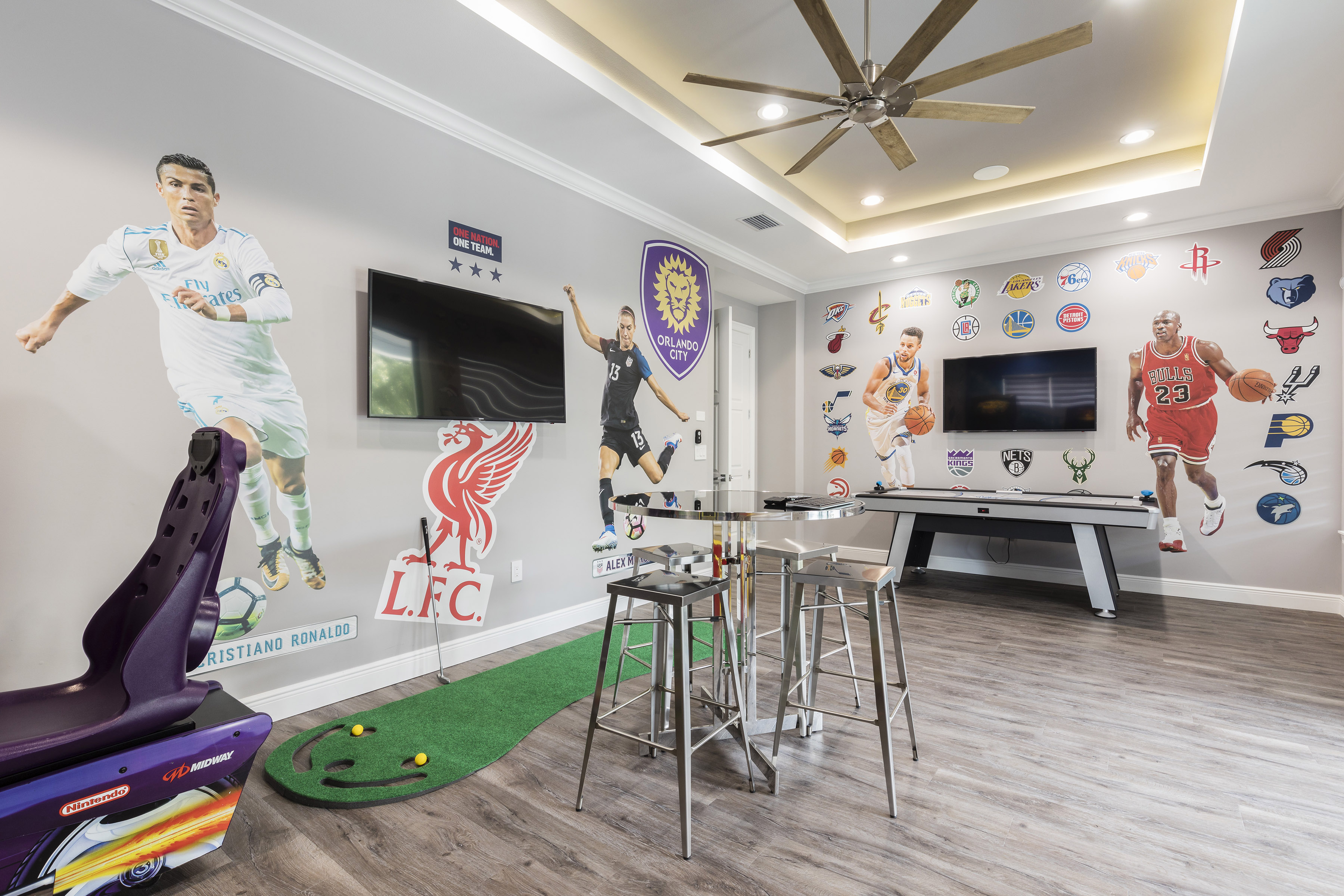 Games room has skeball, multi-arcade video game, air hockey table, 2x large flat screen TVs, balcony access, 4 seat high top table, 2x bean bag chairs, putting green, car racing video game