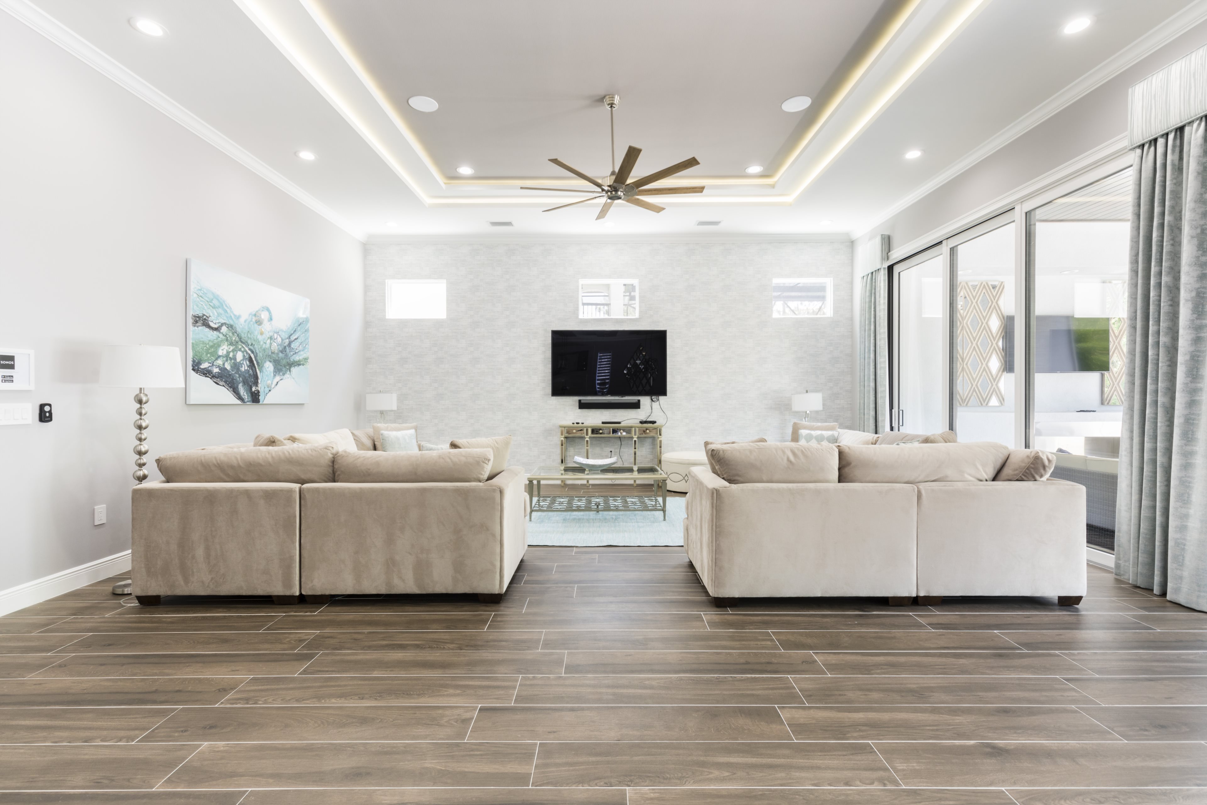 Spacious comfortable seating area with 2x sectionals overlooking the private pool deck through sliding glass doors