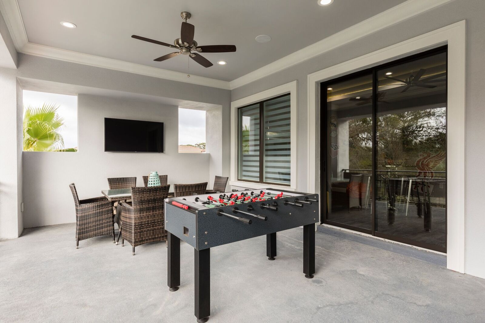Upper floor balcony has a foosball table, large flat screen TV, 6 seat patio table