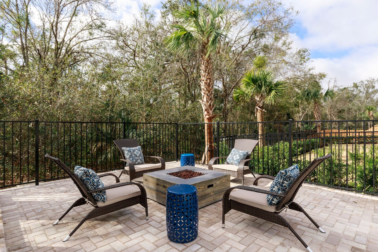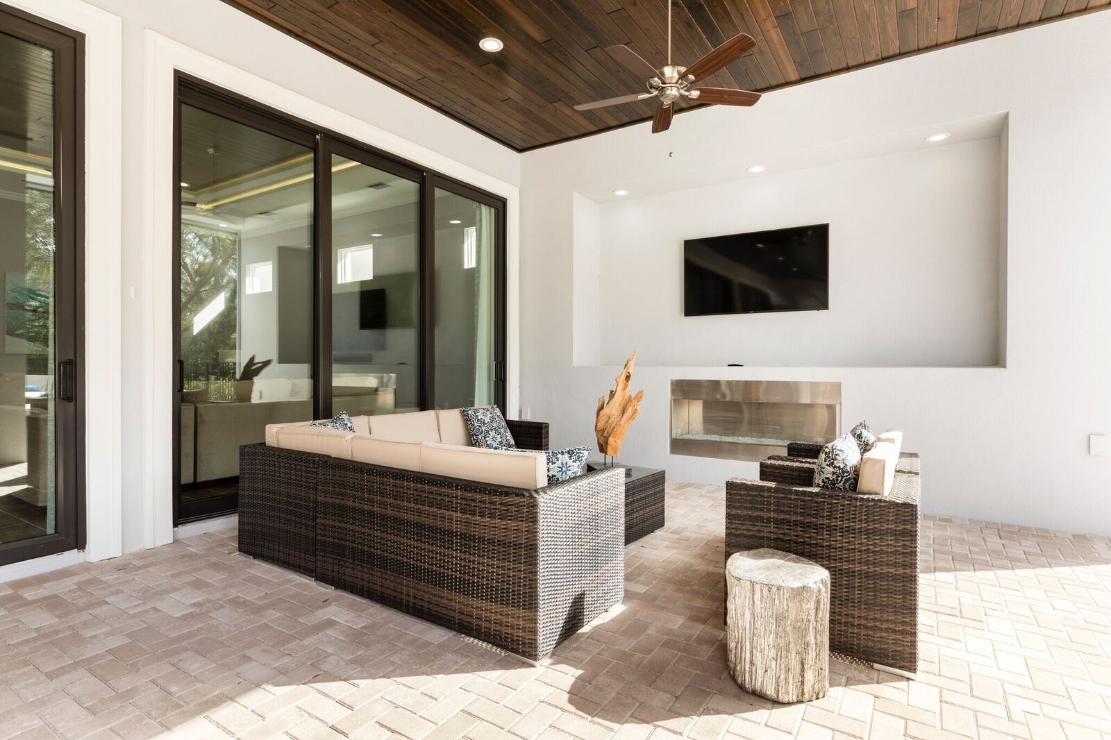 Large flat screen TV with fireplace, outdoor sectional, and 2x patio chairs