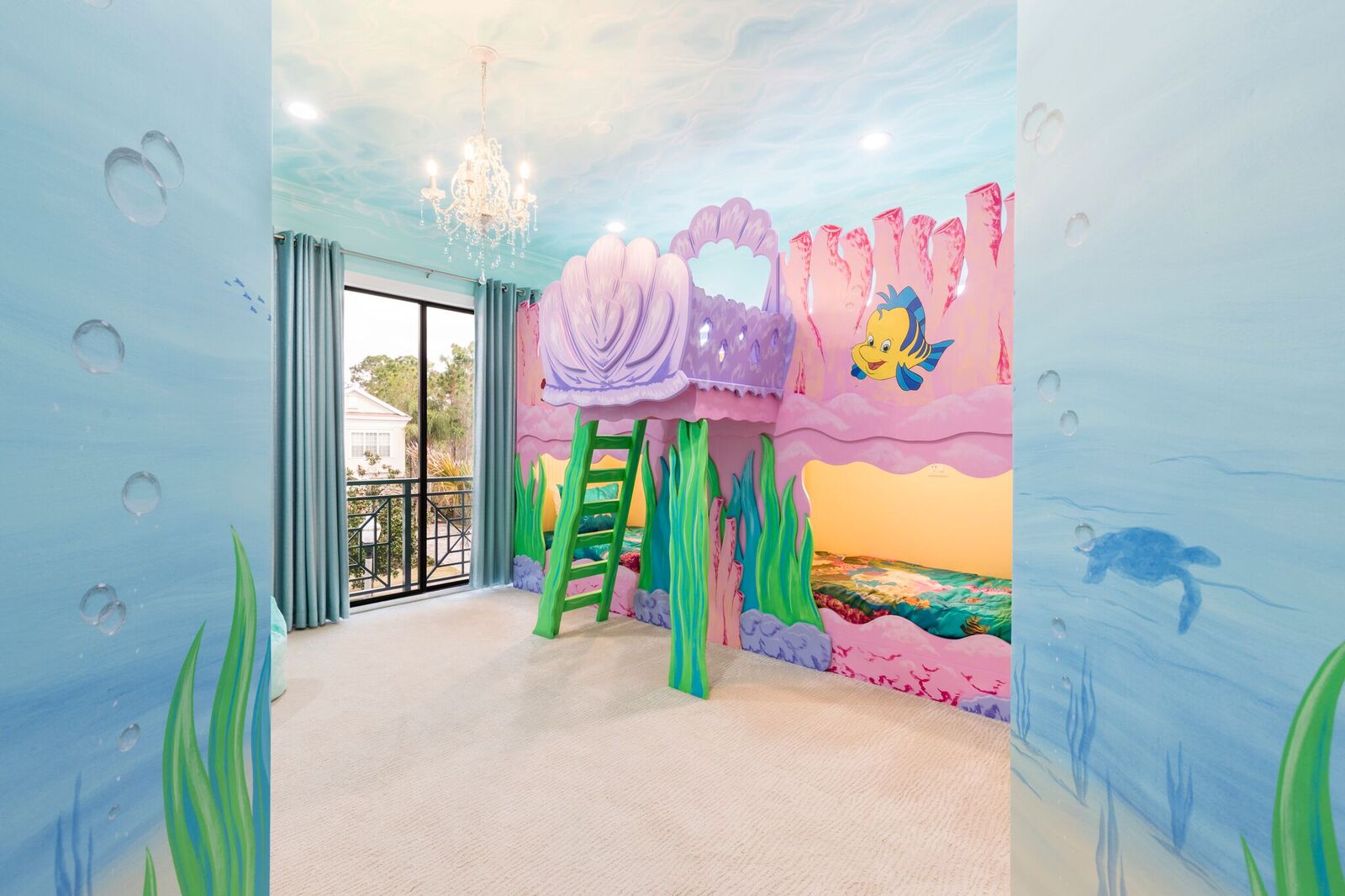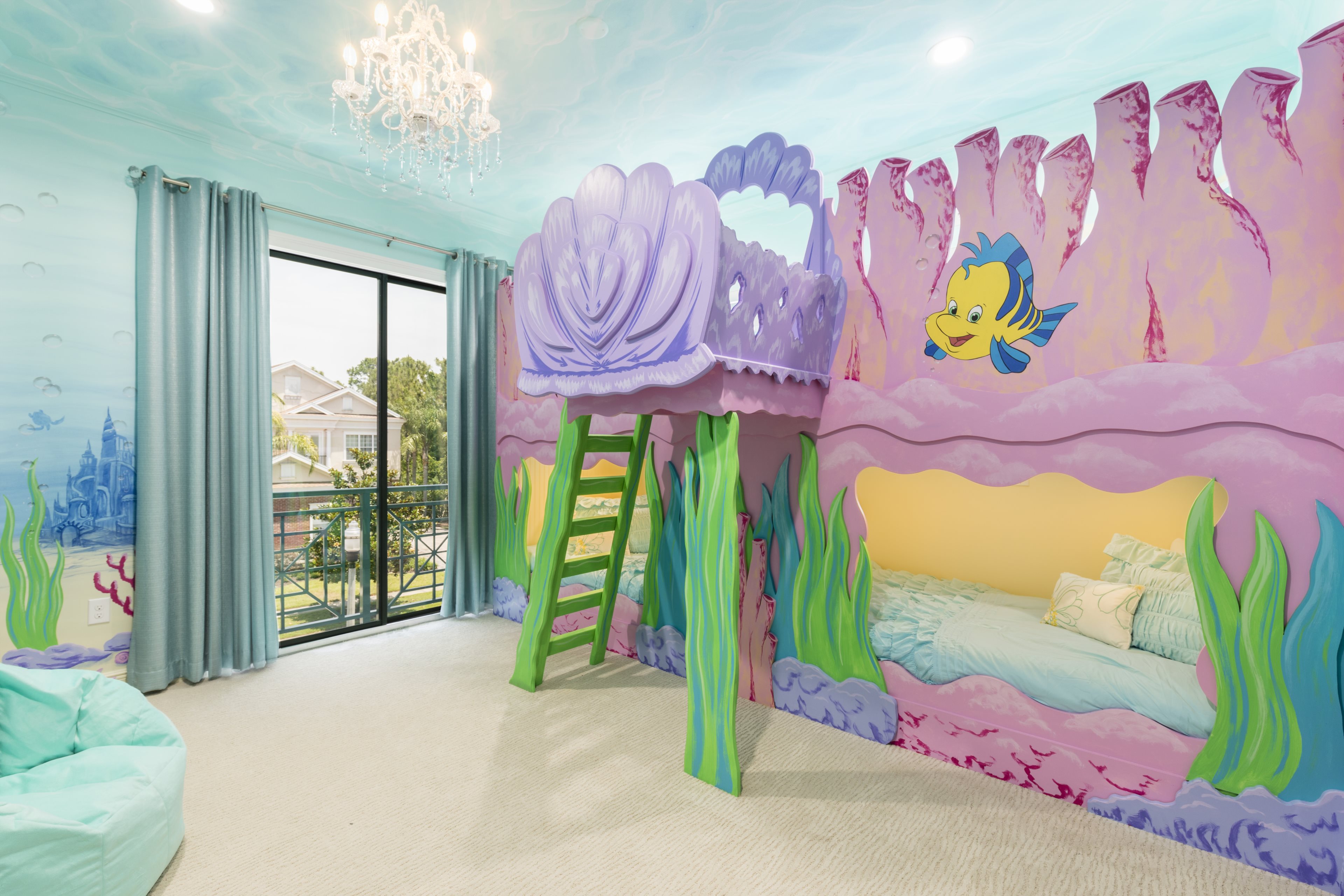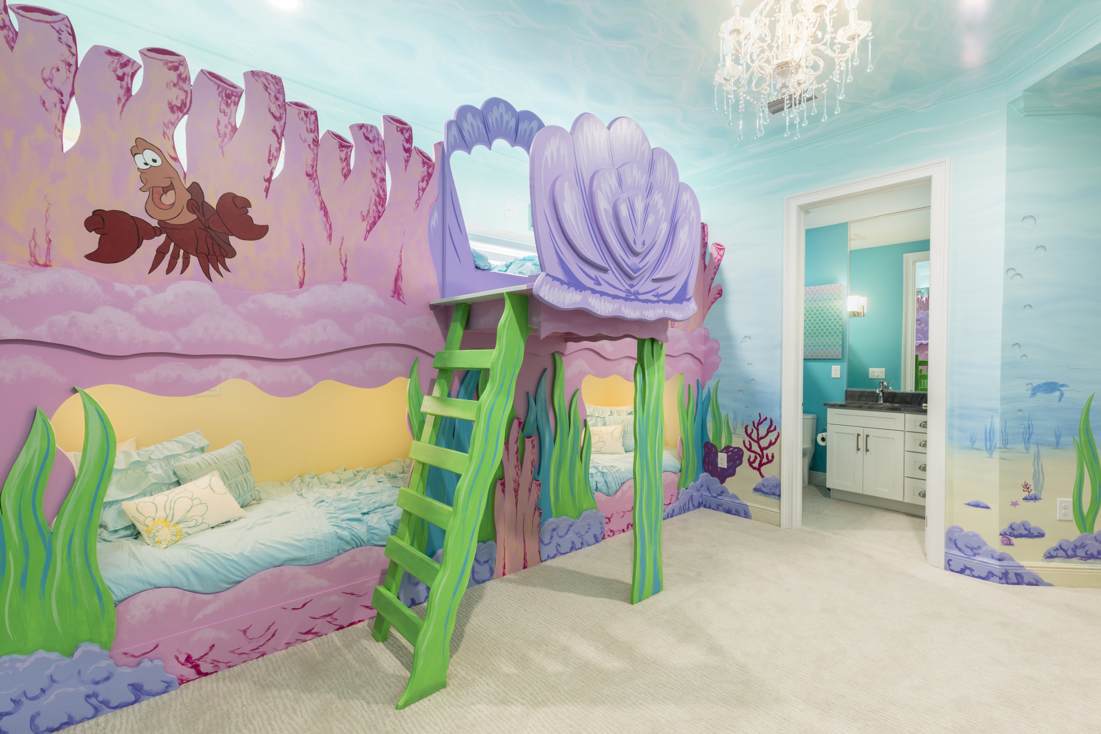 'The Little Mermaid' themed bedroom with 2x sets of bunk beds (4x Twin sized beds total), en suite (shower/bath combo), dress up station and bean bag chair