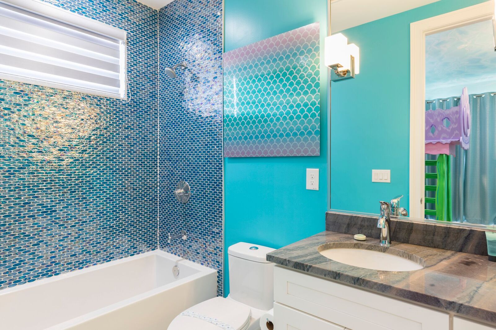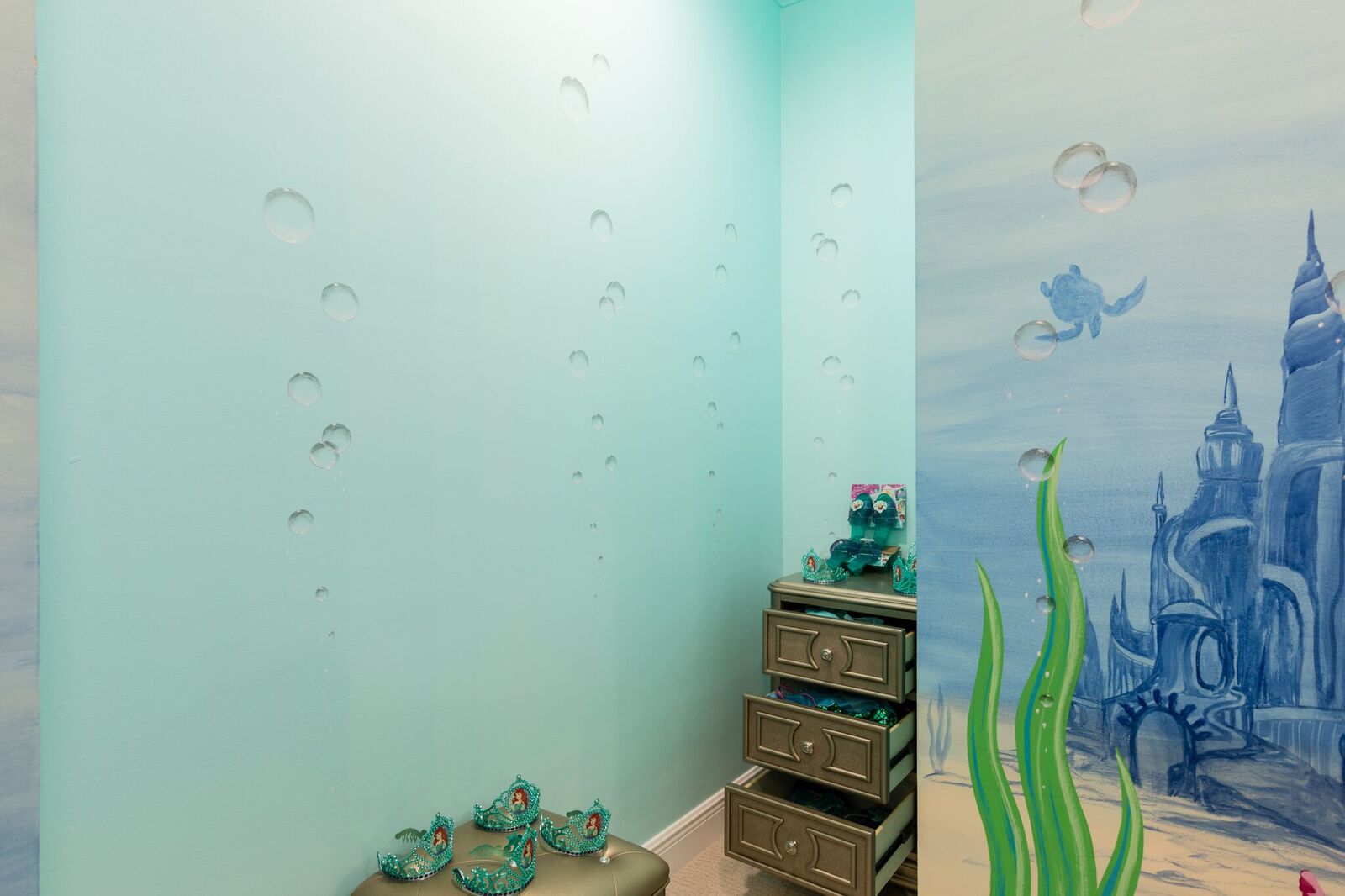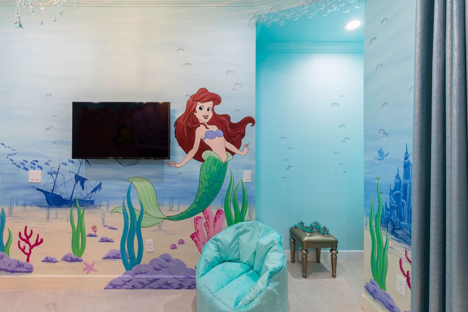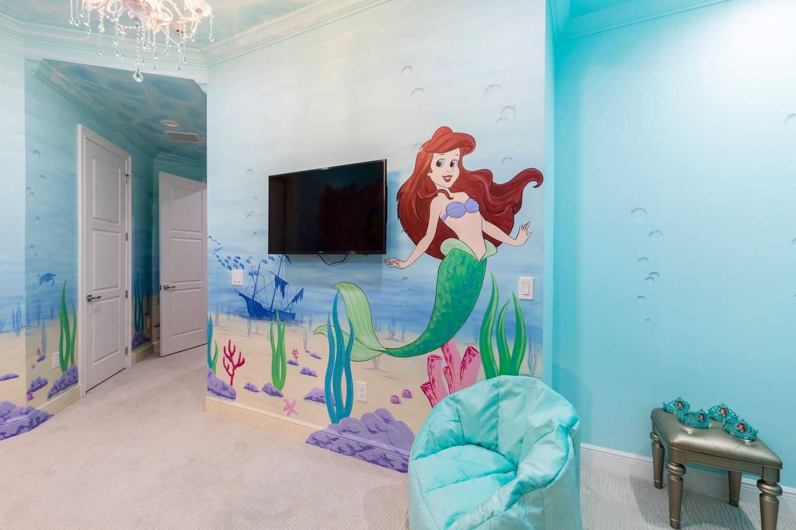 'The Little Mermaid' themed bedroom with 2x sets of bunk beds (4x Twin sized beds total), en suite (shower/bath combo), dress up station and bean bag chair