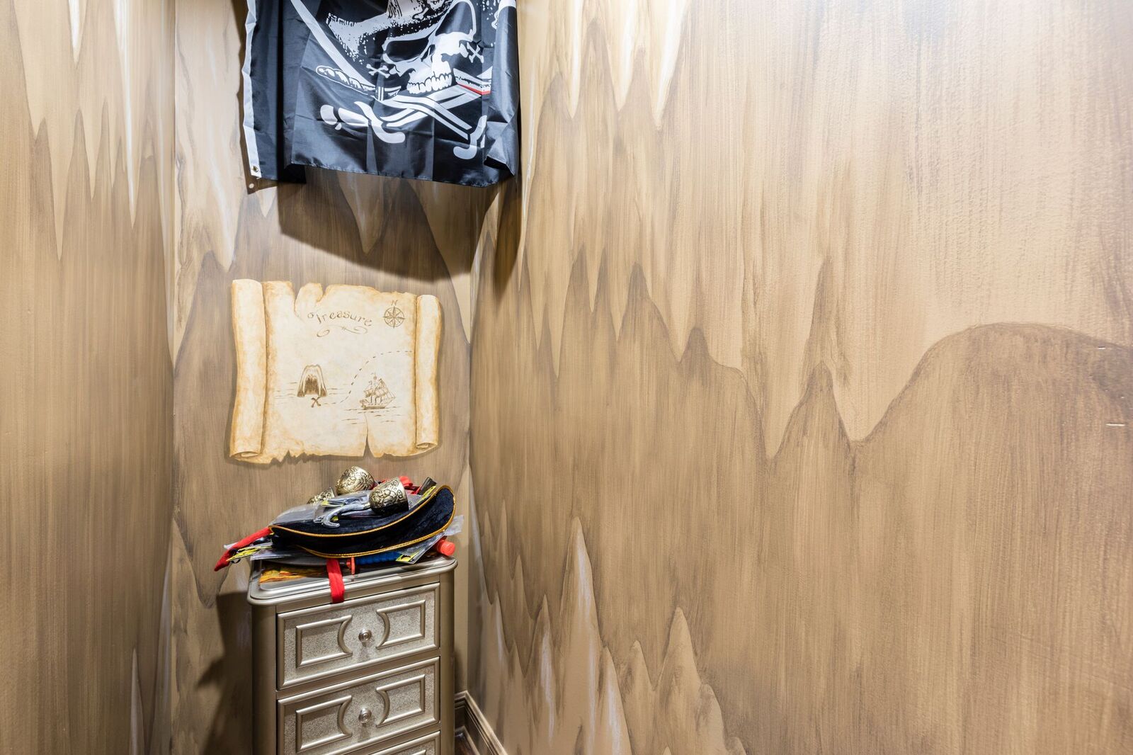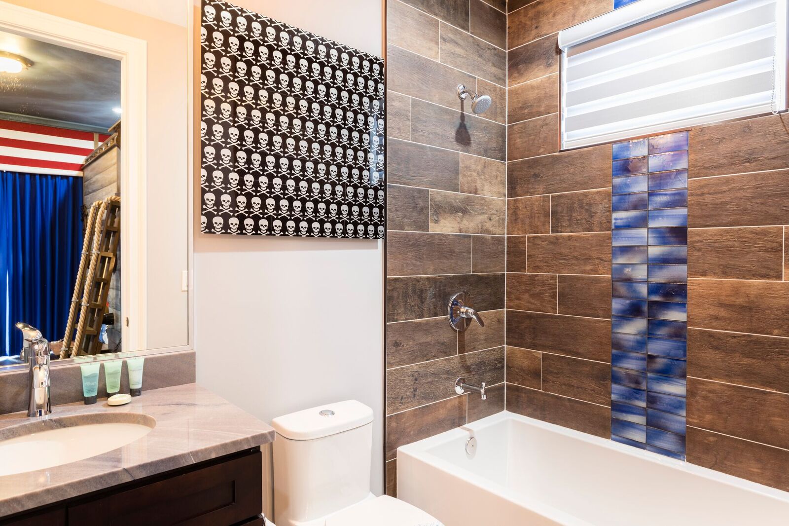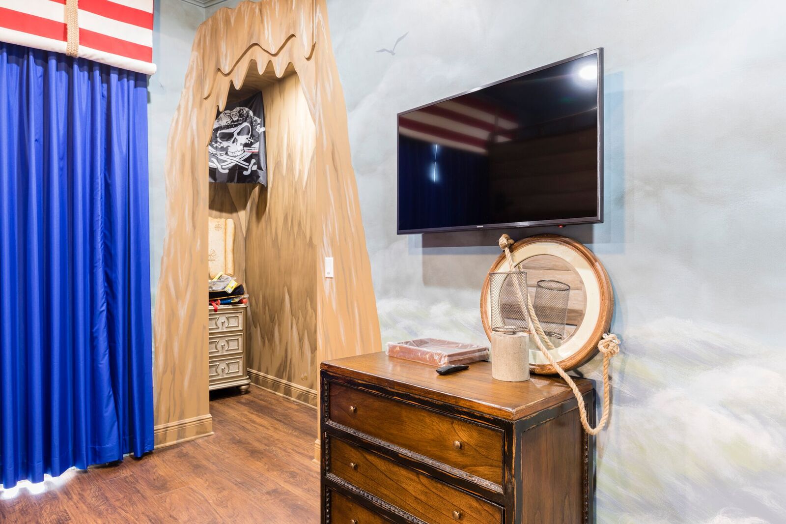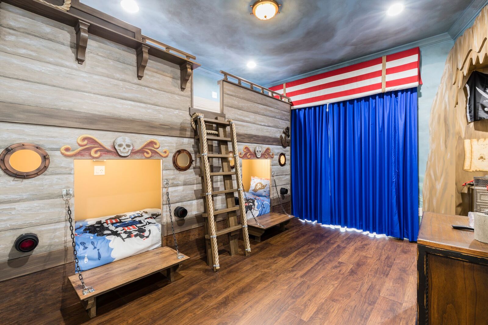 Pirate themed bedroom with 2x sets of bunk beds (4x Twin sized beds total), en suite (shower/bath combo), dress up station