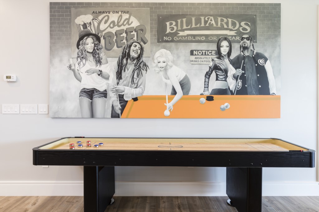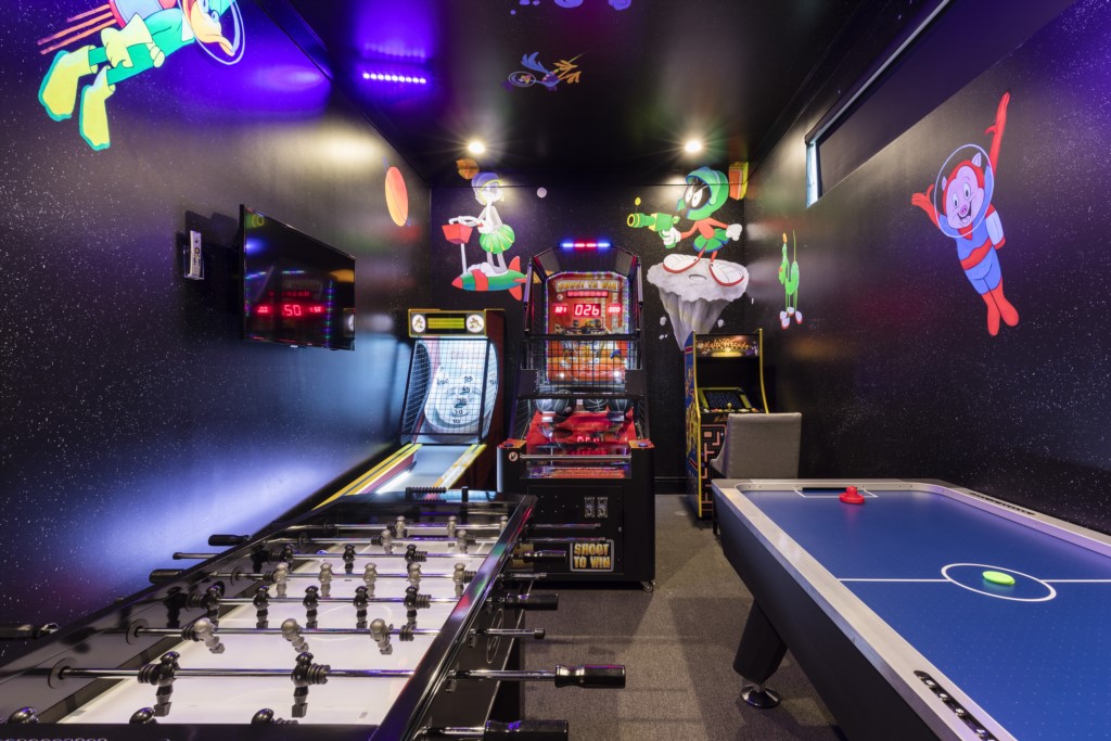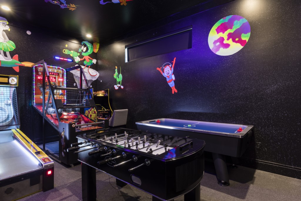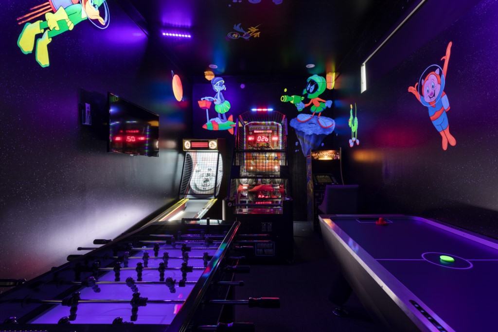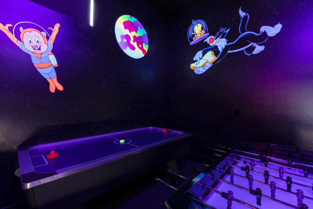 Blacklight Looney Tunes themed Arcade on main floor with a flat screen TV, Skee Ball, Shoot To Win, Air Hockey, 60:1 Arcade Game and Foosball
