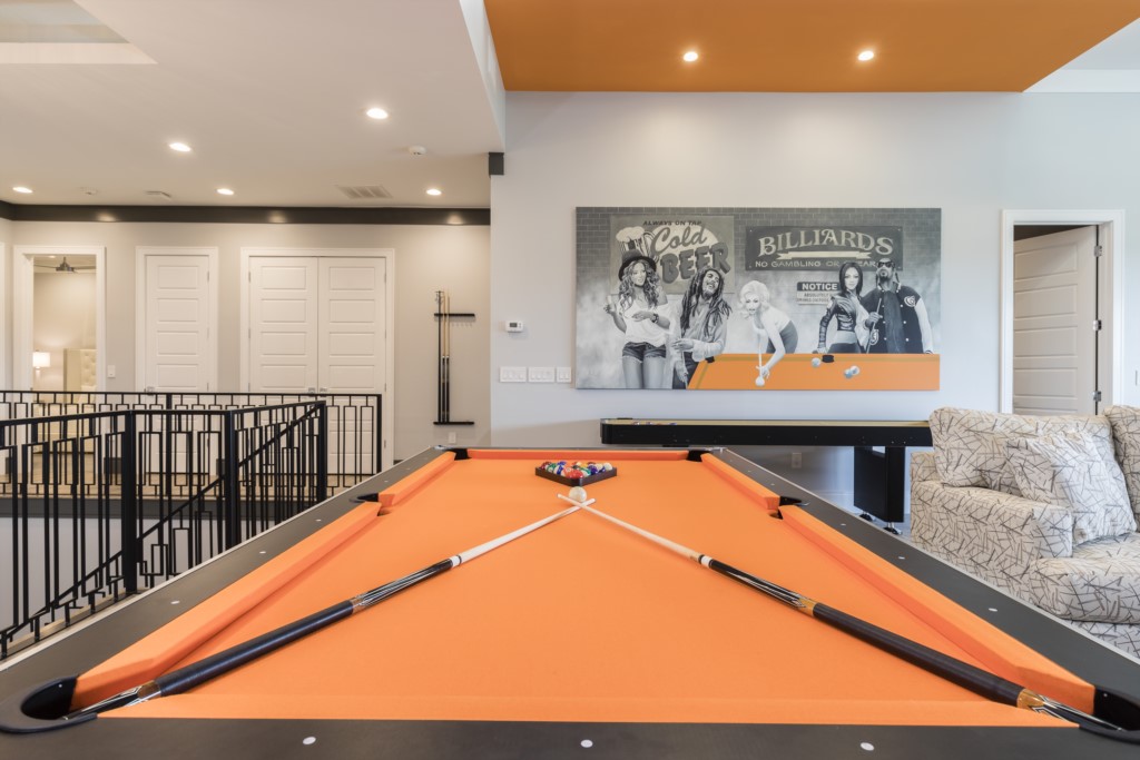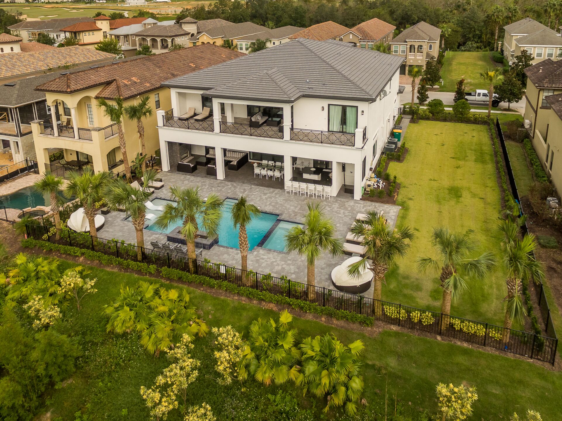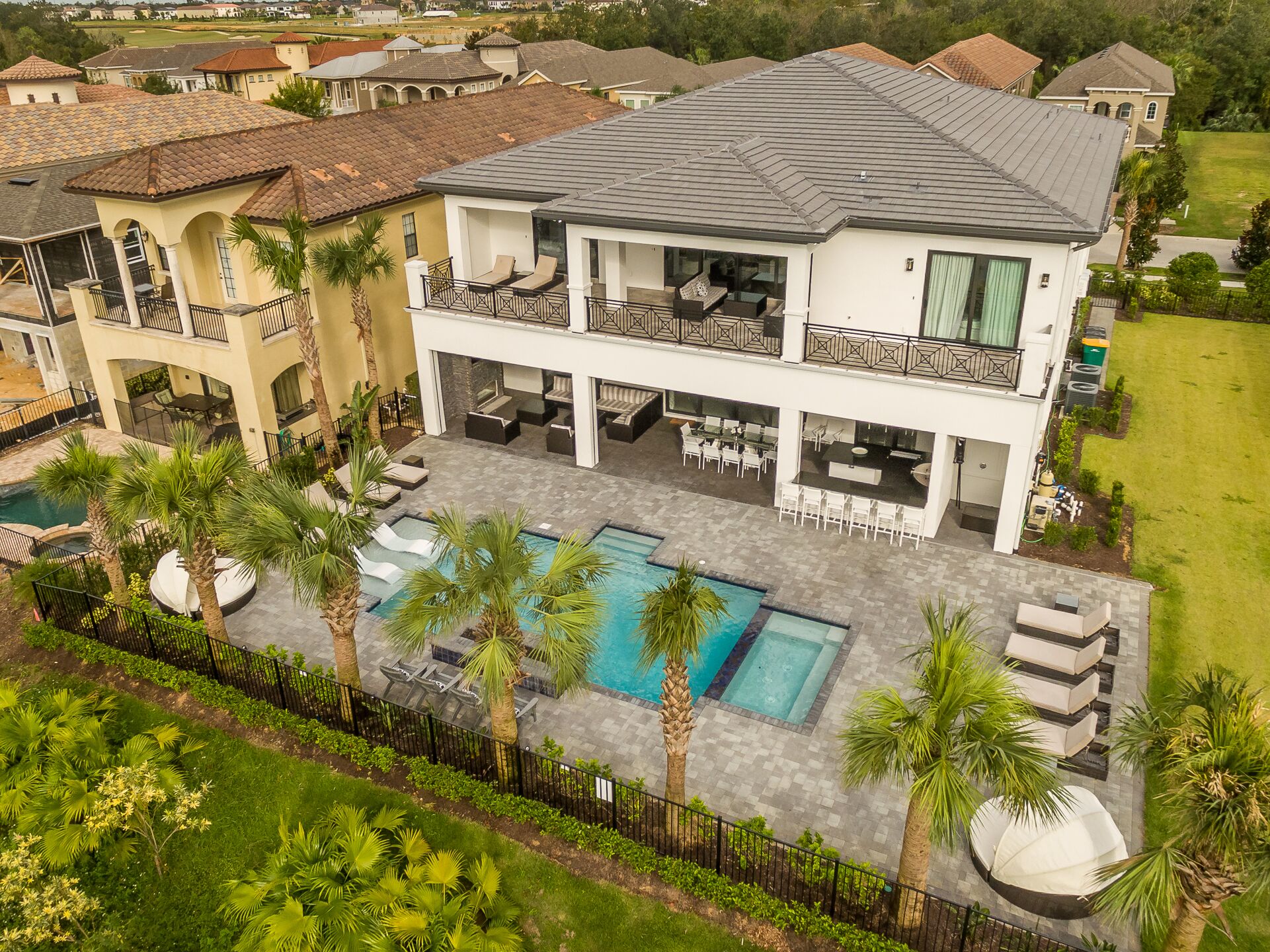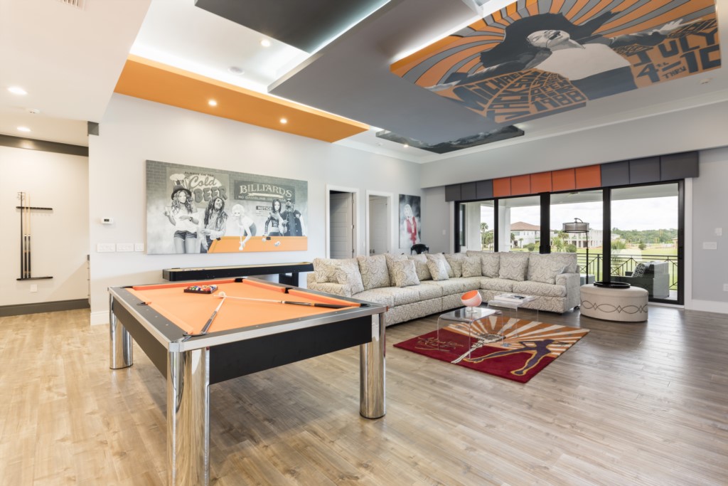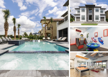 This stunning luxury mansion is one of the finest in Orlando and includes a large west facing private pool deck with a panoramic view of the 6th Hole of the Nicklaus course, a Lego themed interactive playroom with a race track and video games, a blacklight Looney Tunes themed arcade, themed bunk bed room with a hidden area, large loft area with karaoke and a pool table, professional cinema room, the convenience of your own summer kitchen and spectacularly designed and furnished bedrooms on two floors.