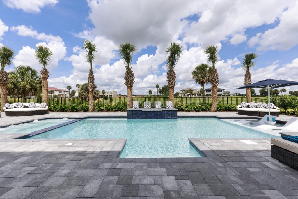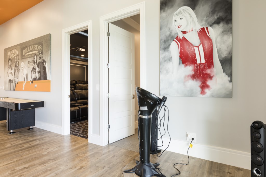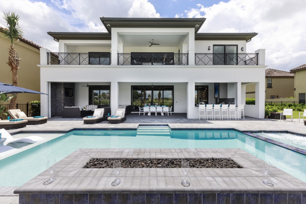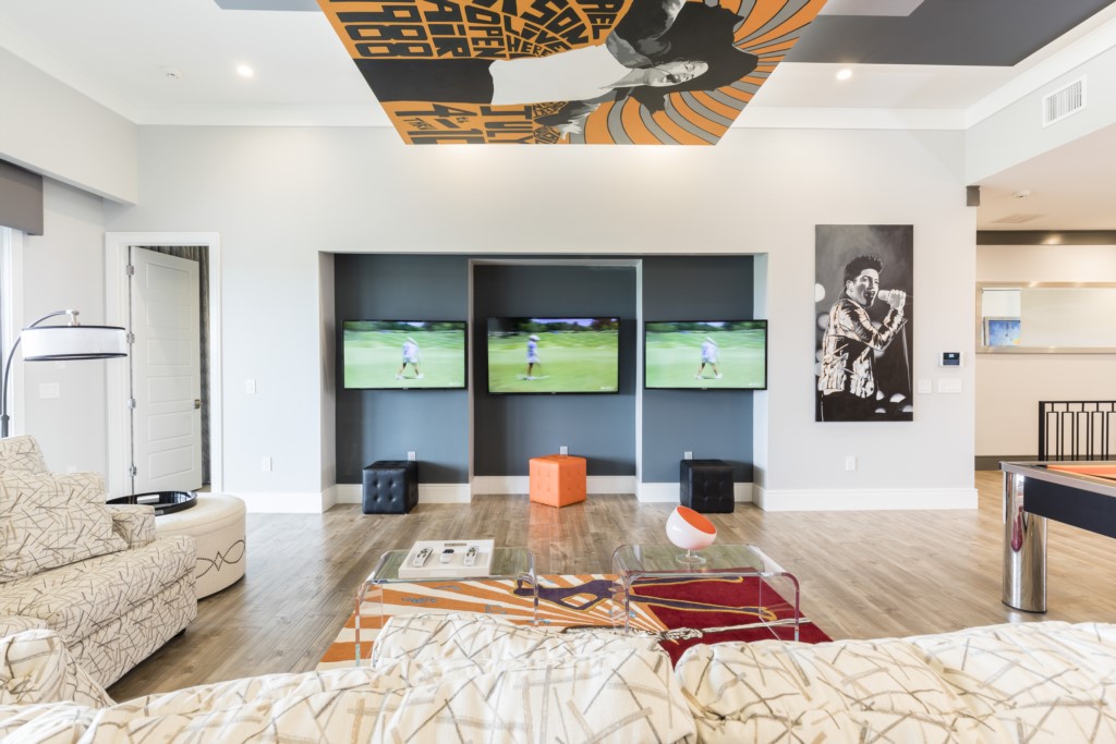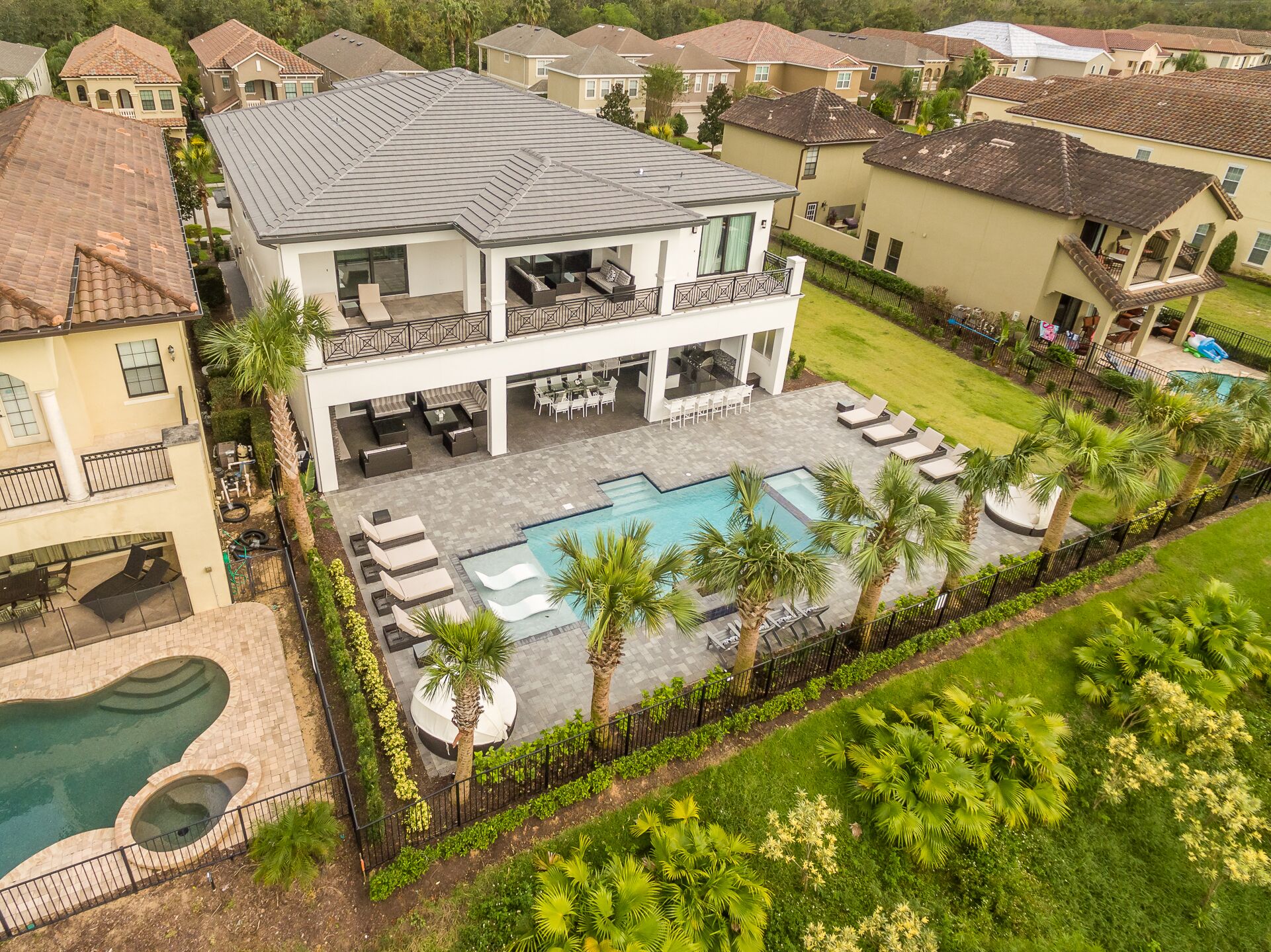 This stunning luxury mansion is one of the finest in Orlando and includes a large west facing private pool deck with a panoramic view of the 6th Hole of the Nicklaus course, a Lego themed interactive playroom with a race track and video games, a blacklight Looney Tunes themed arcade, themed bunk bed room with a hidden area, large loft area with karaoke and a pool table, professional cinema room, the convenience of your own summer kitchen and spectacularly designed and furnished bedrooms on two floors.