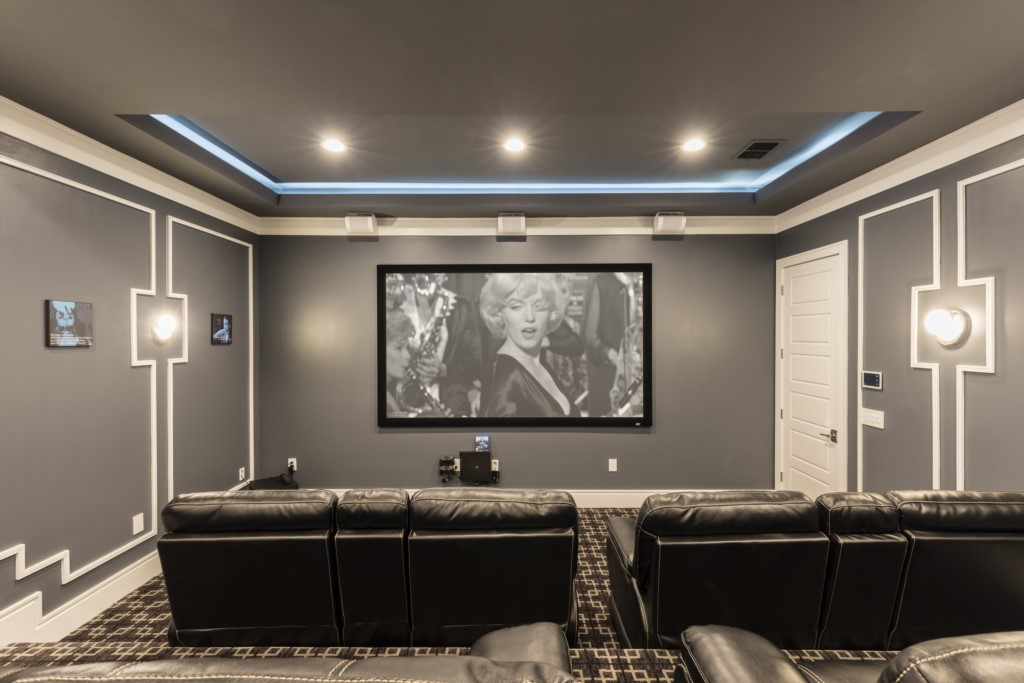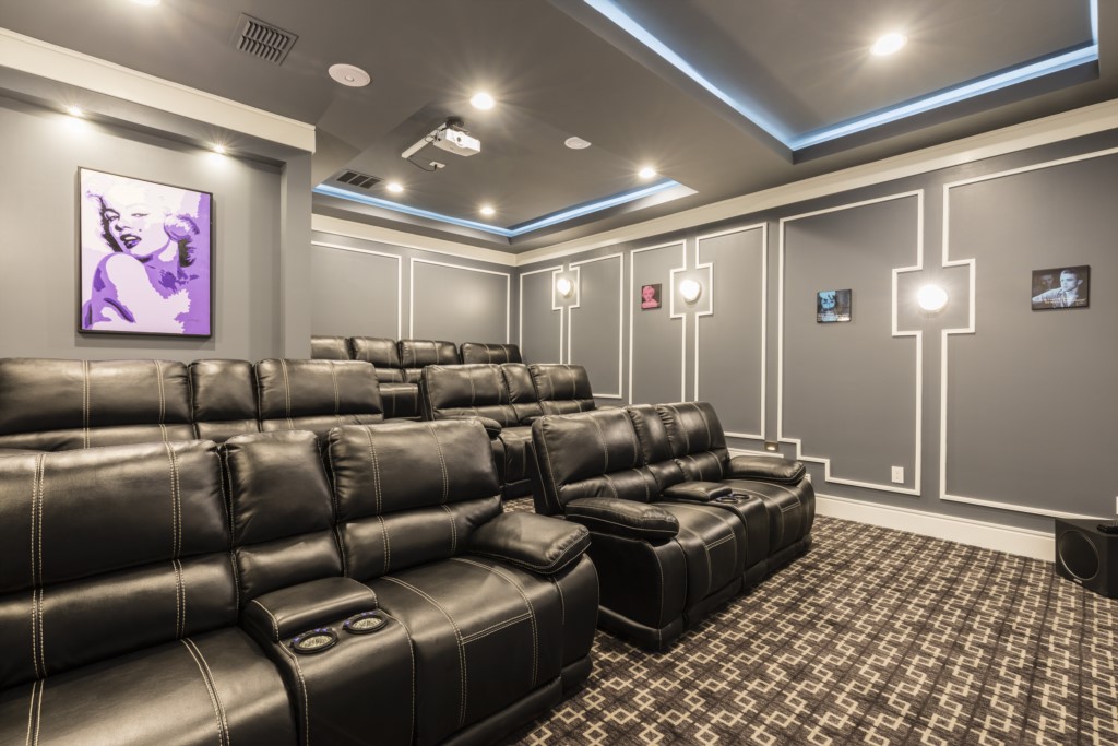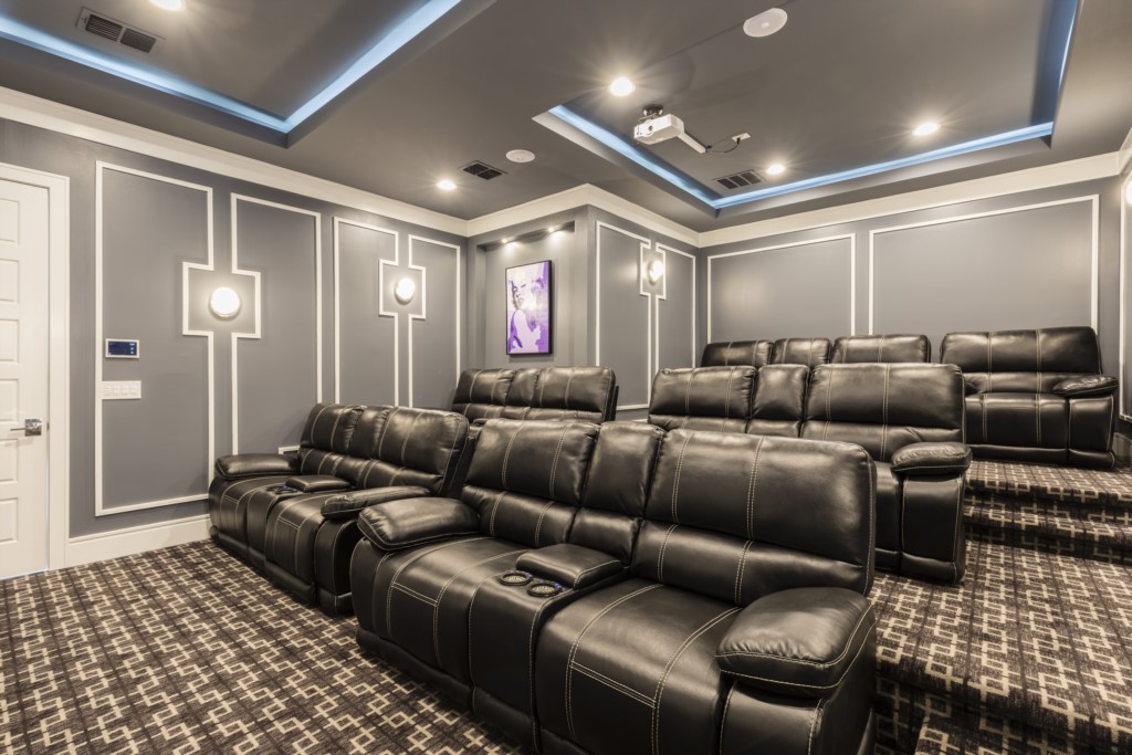 Upstairs tiered home theater has 12 leather recliners with built in drink holders with LED lighting and a large projection screen