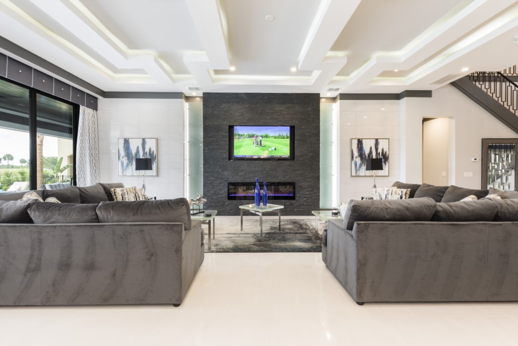 Spacious comfortable seating area with a double sectional looking onto a capitvating feature wall with backlit glass shelving, a large flat screen TV and a linear electric LED fireplace with multiple color flame setting options. You can look out through a large 10' high sliding glass door onto the large patio deck and west facing pool area