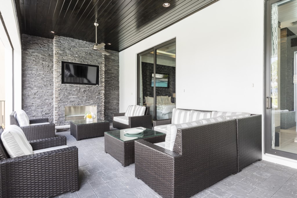 A comfortable seating area with a sectional and 3x patio charis around a gas fireplace with a large flat screen TV located above and LED lighting to wind down the day around