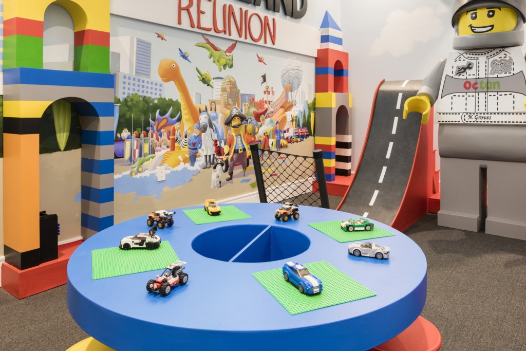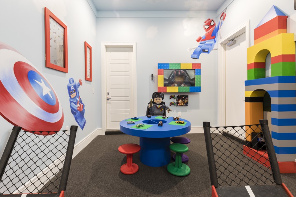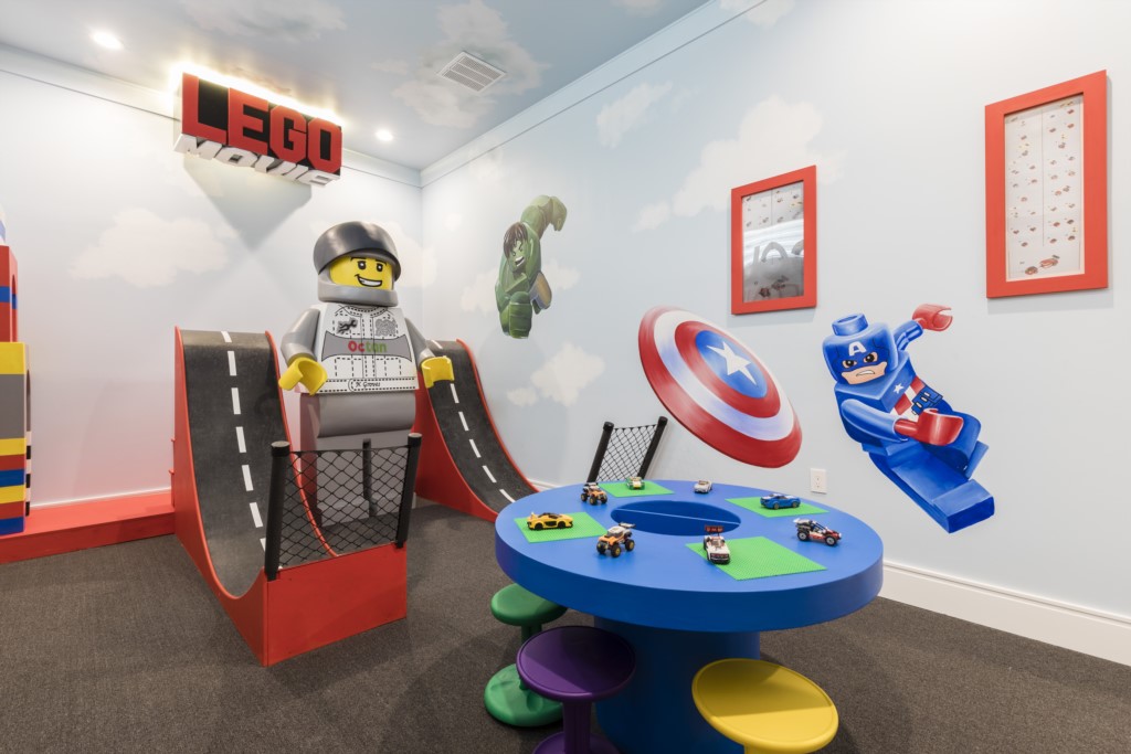 Lego 3D Themed Play Room on the main floor with lego race car building stations and instructions, dual lego race tracks and lego video games and console on a large flat screen TV. Also has a 7' high 3D Lego figurine