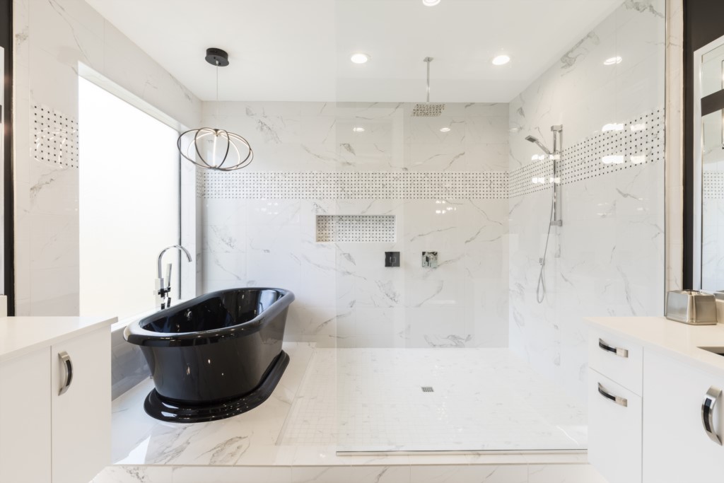 King sized master with en suite (walk in shower with rain head, free standing tub, two separate vanities, vanity make up mirror) with patio doors to the rear patio