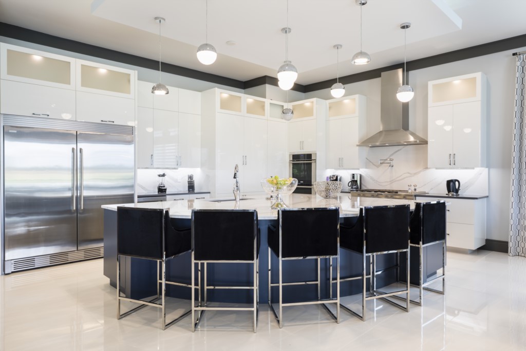 Fully equipped with an over sized pie shaped island with an upgraded Cambria Brittanica quartz counter top and bar seating for 5