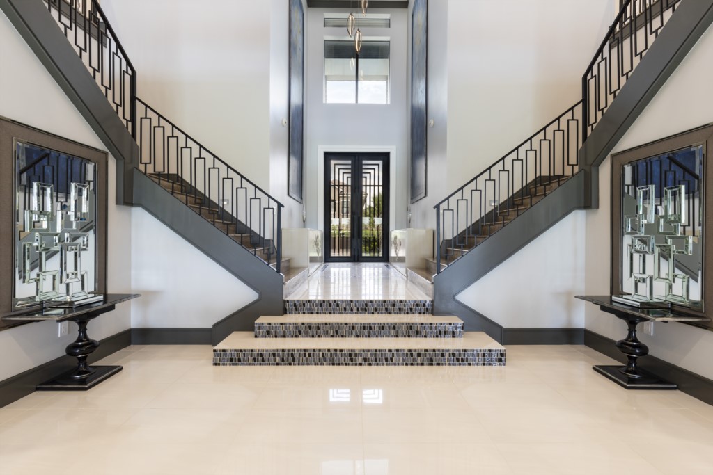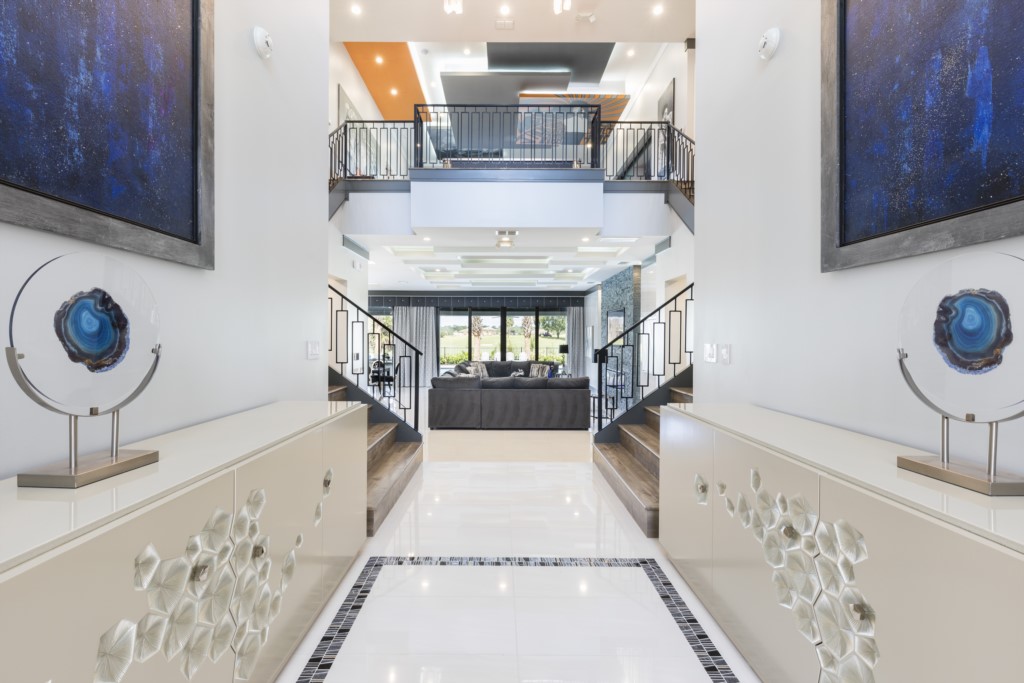 As you enter the home you are greeted by 30' high ceilings into an open double stair case that leads up to the 2nd story. As you step down into the living room, you are over taken by the open design and modern grey, black and silver furnishings. You are then welcomed by an incredible view of the pool and water fall with a fire feature as you look out out over the west facing backyard with the golf couse in the background.