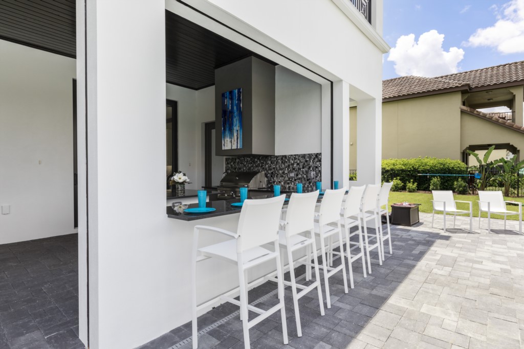 Covered lanai with a 10 seat patio table, summer kitchen with a grill, sink, bar fridge, 6 seat pool bar, and bathroom