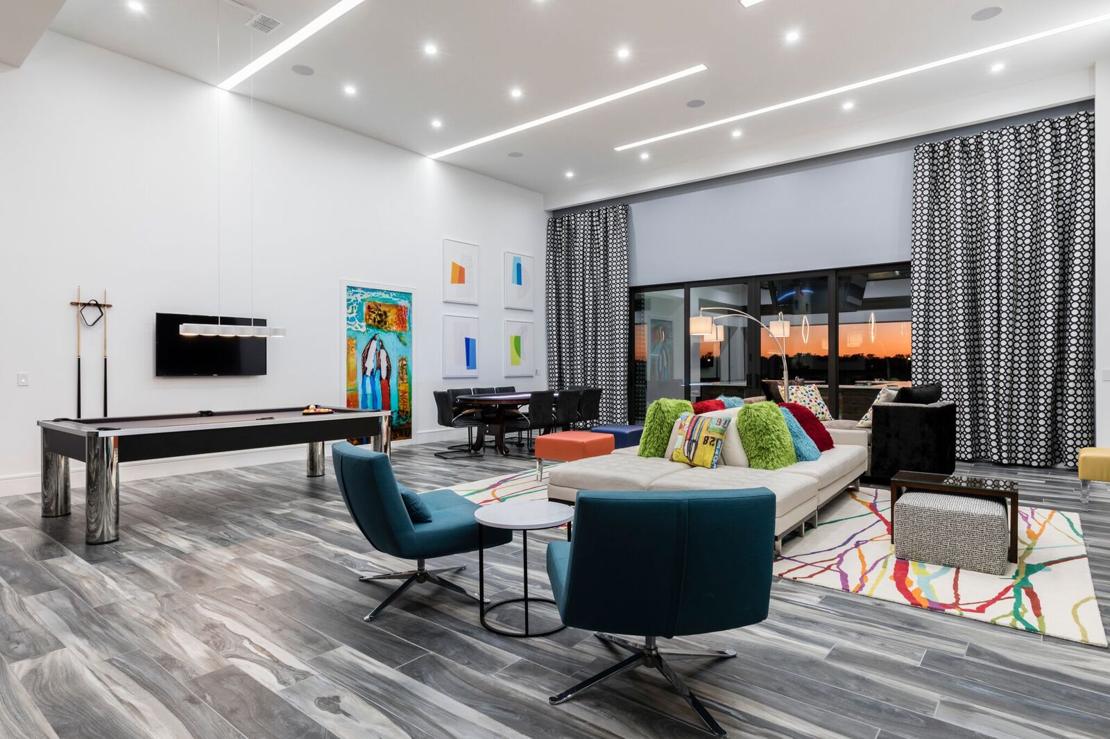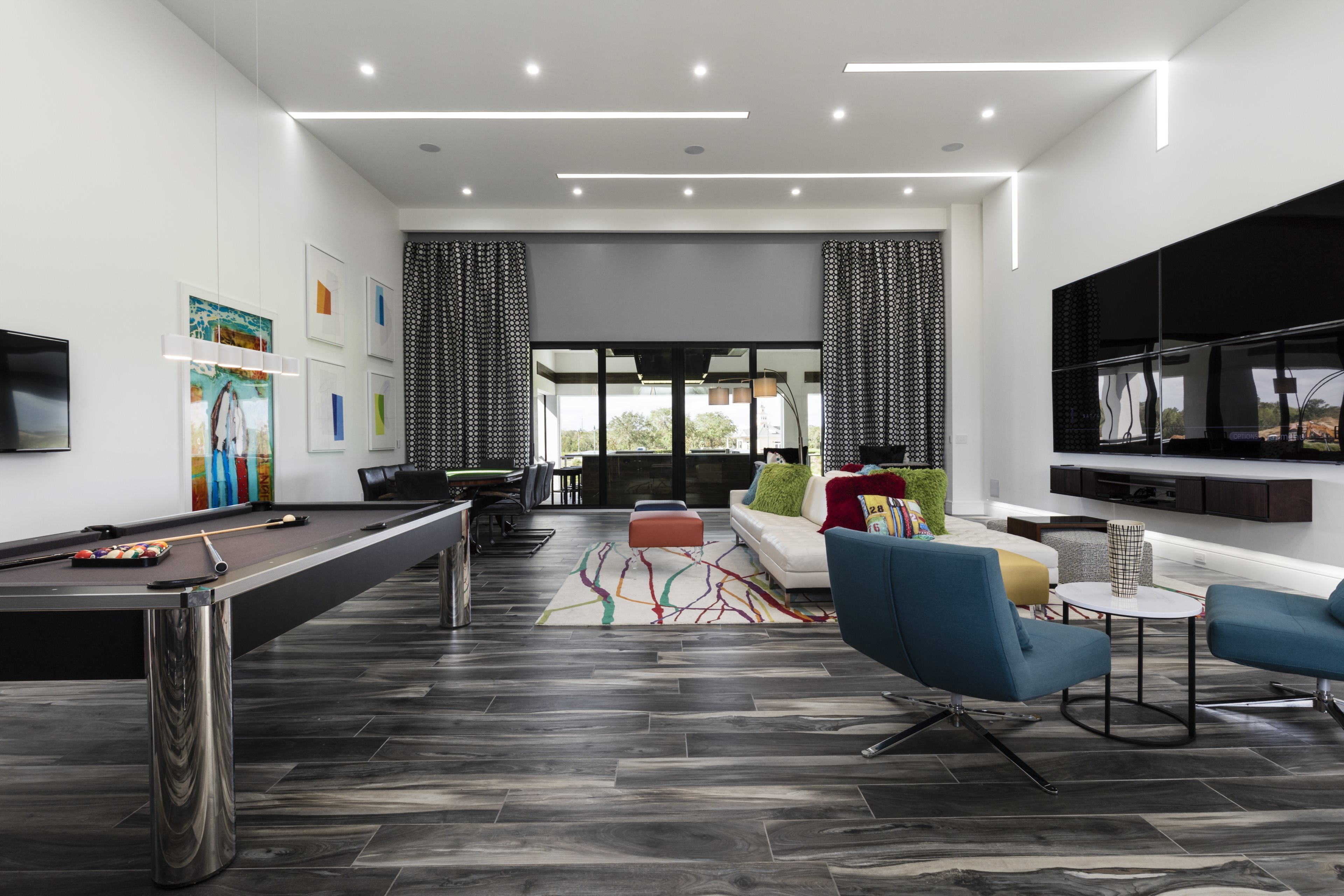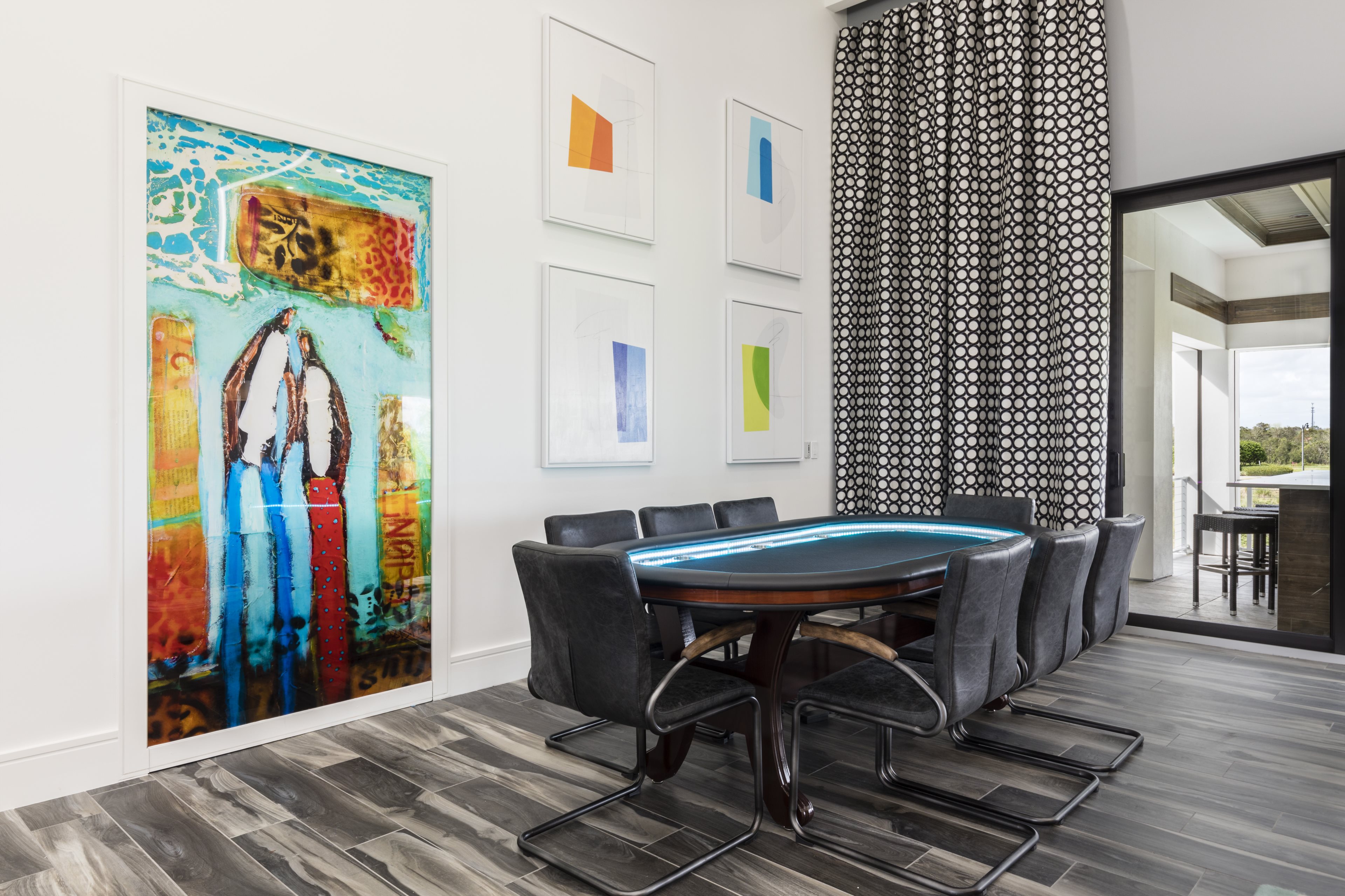 Large upstairs games/entertainment area has 4x 75” TVs, 2x 60” TVs, 7-seat wet bar, pool table and poker table