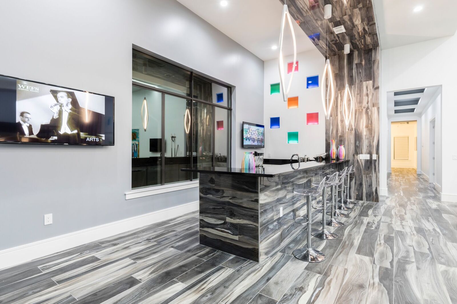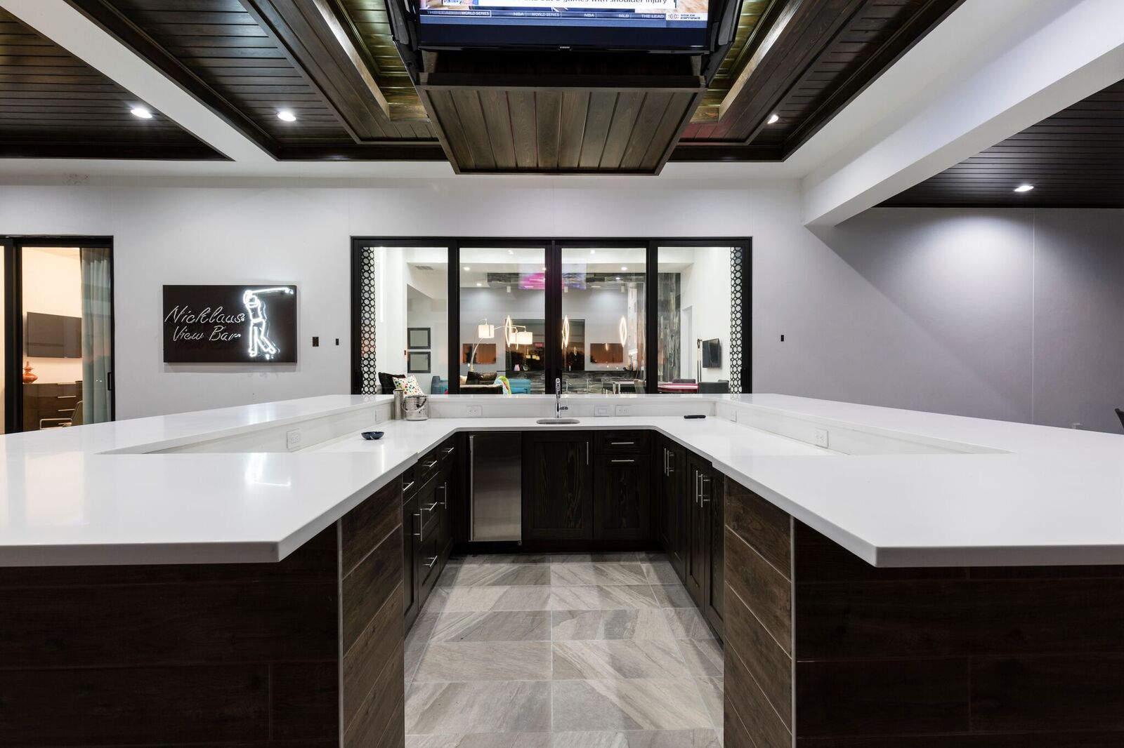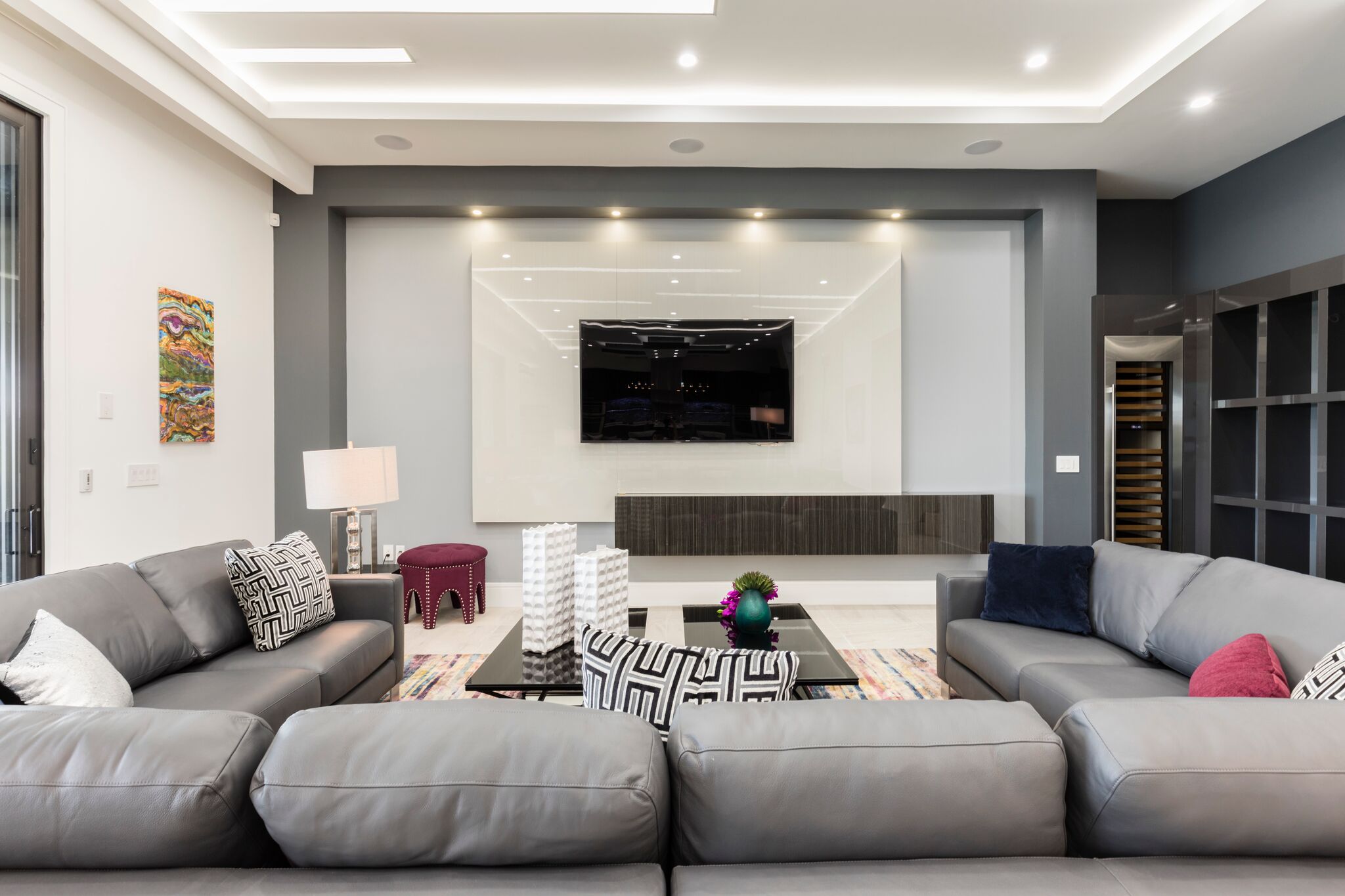 Large upstairs games/entertainment area has 4x 75” TVs, 2x 60” TVs, 7-seat wet bar, pool table and poker table