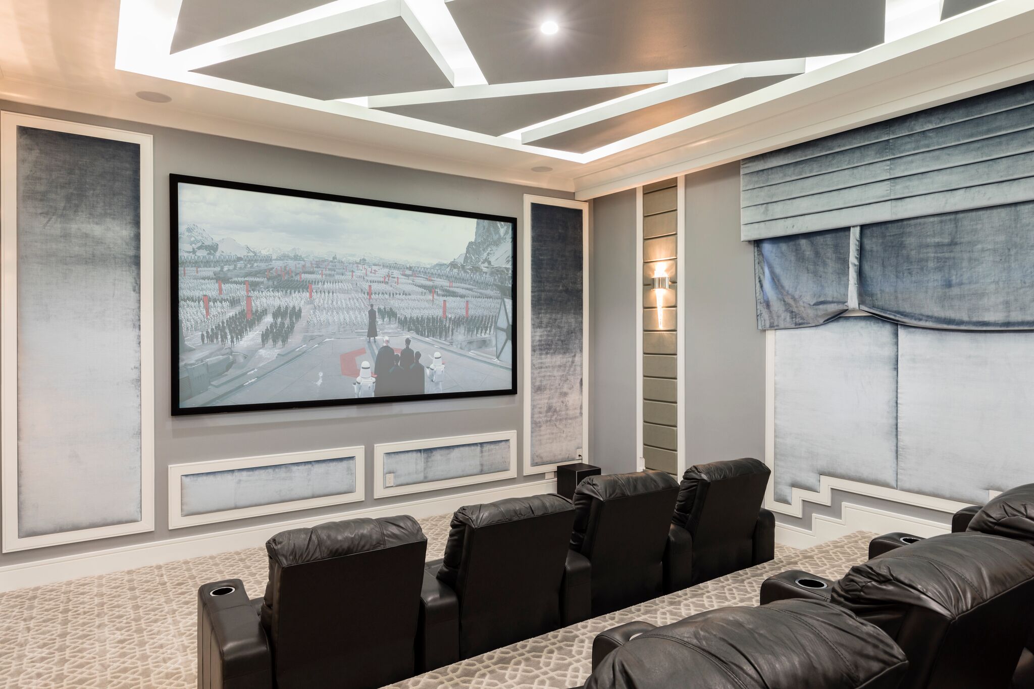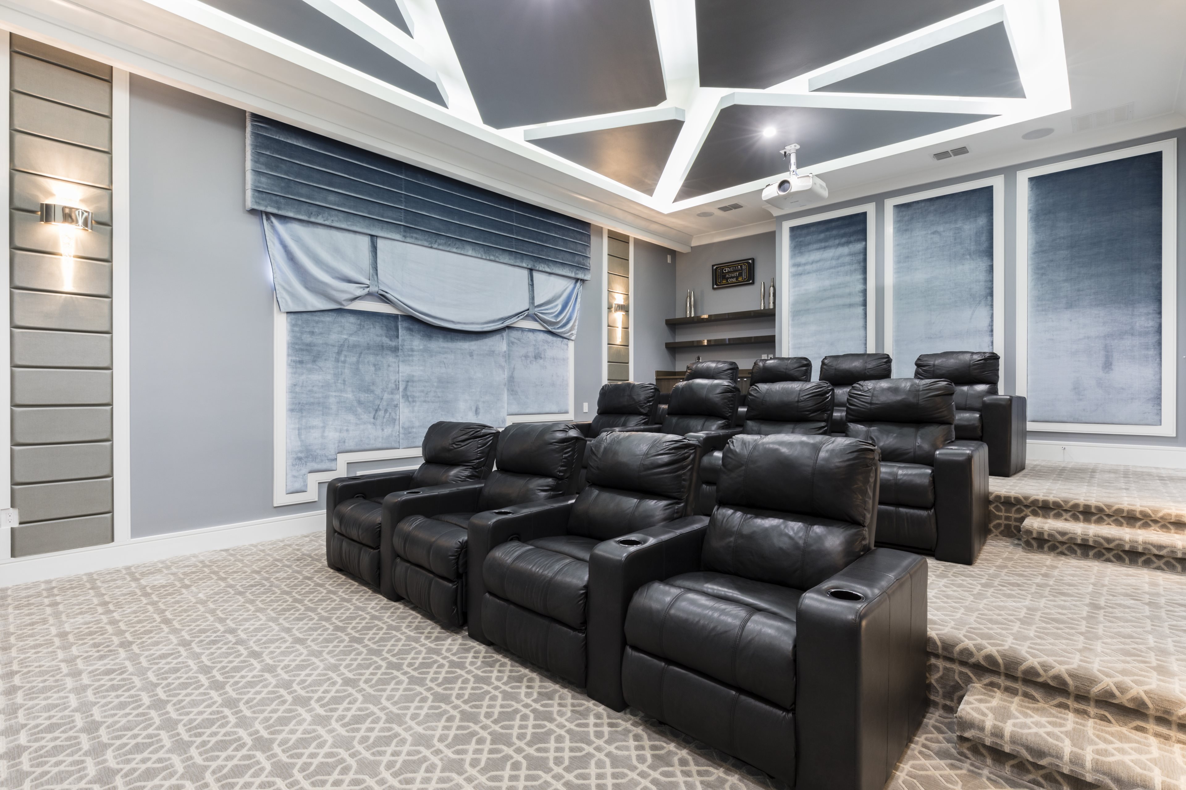 4K home theatre with 3 tiered seating and twelve leather recliners