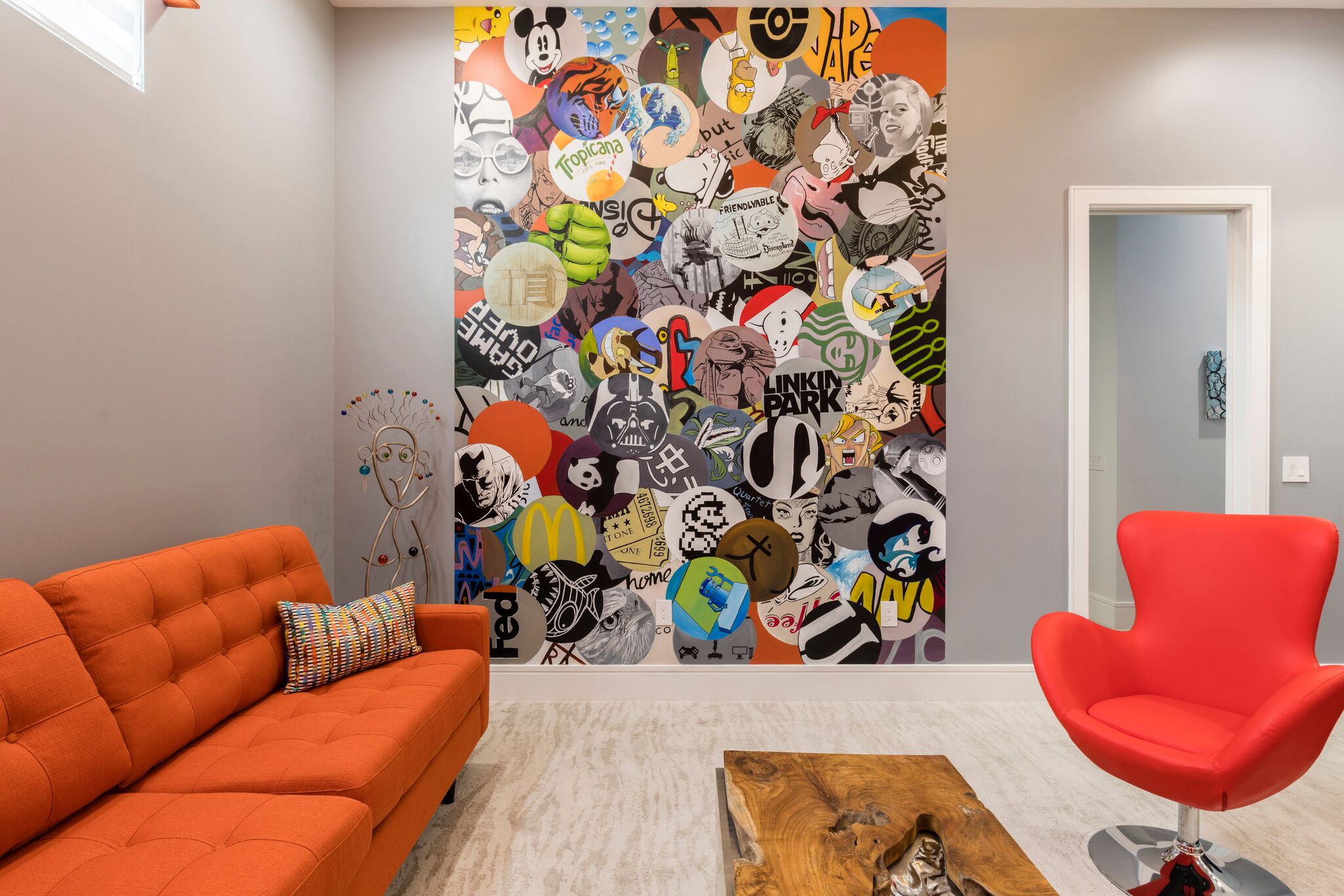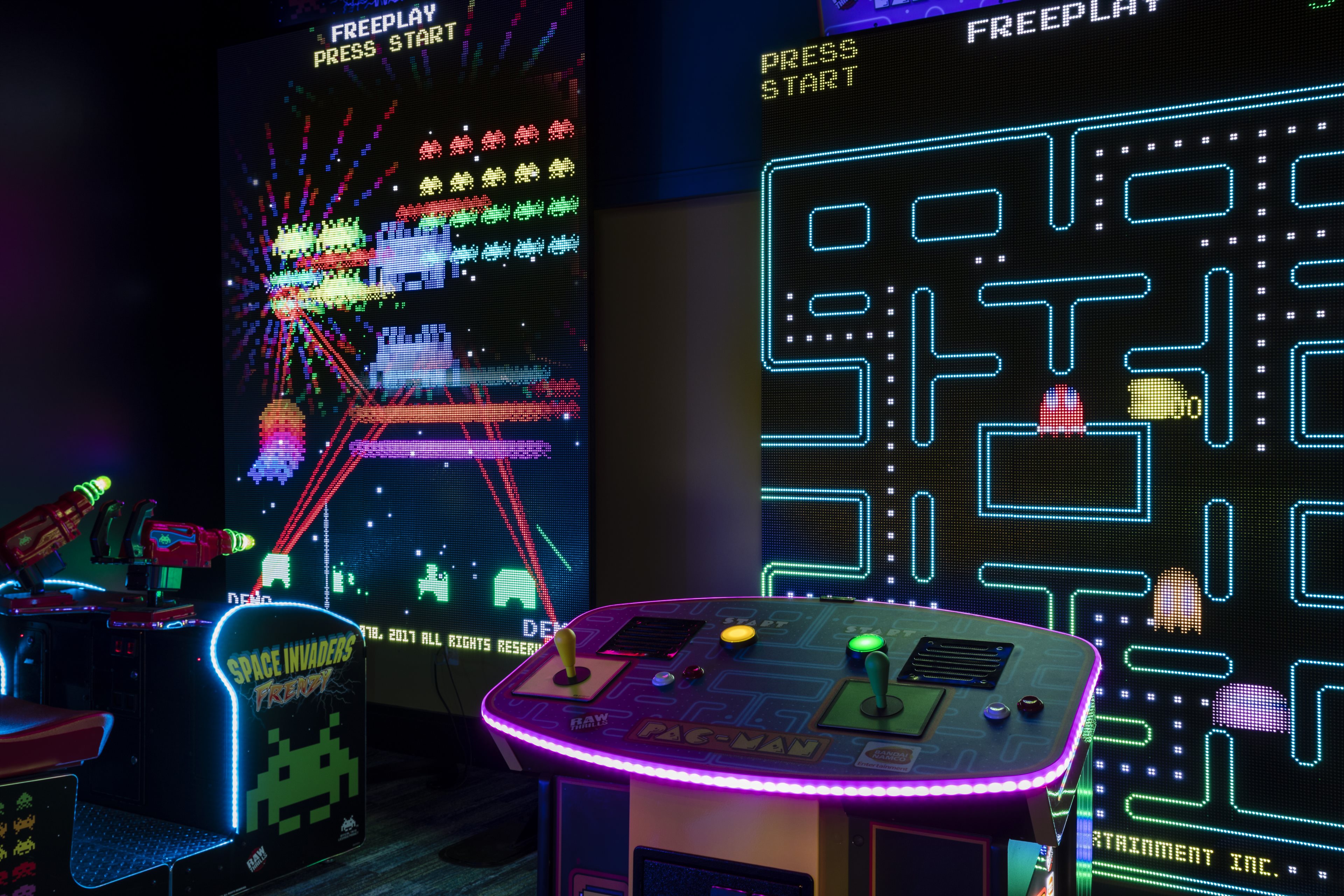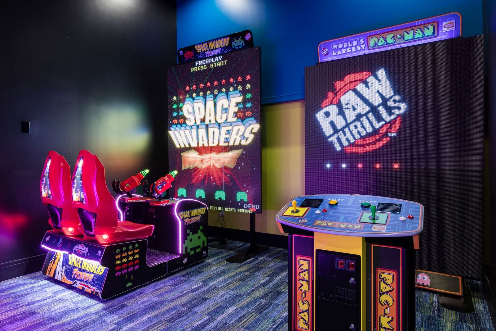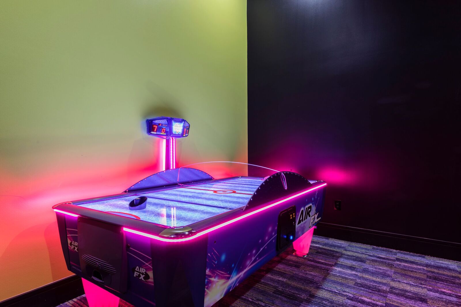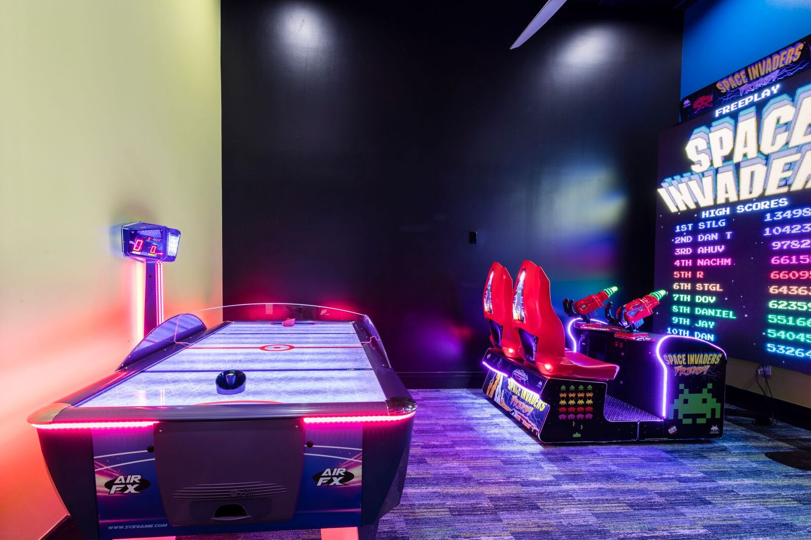 Separate Arcade with air hockey, arcade video games and secret entrance from upstairs entertainment area