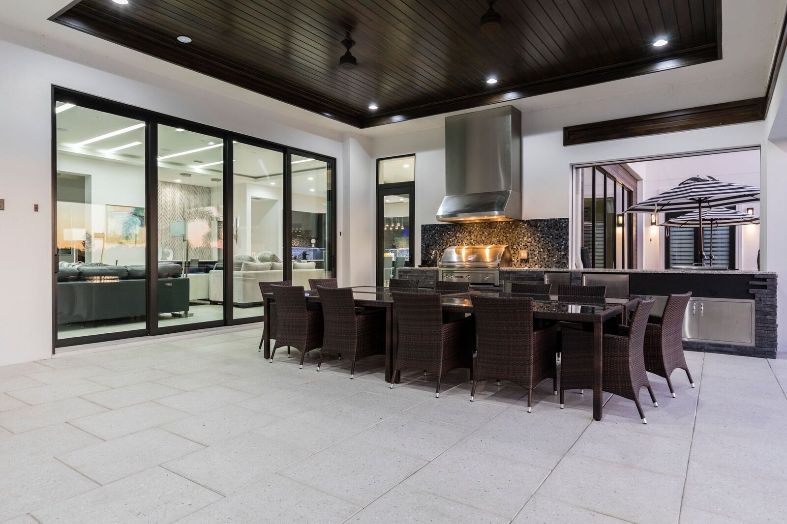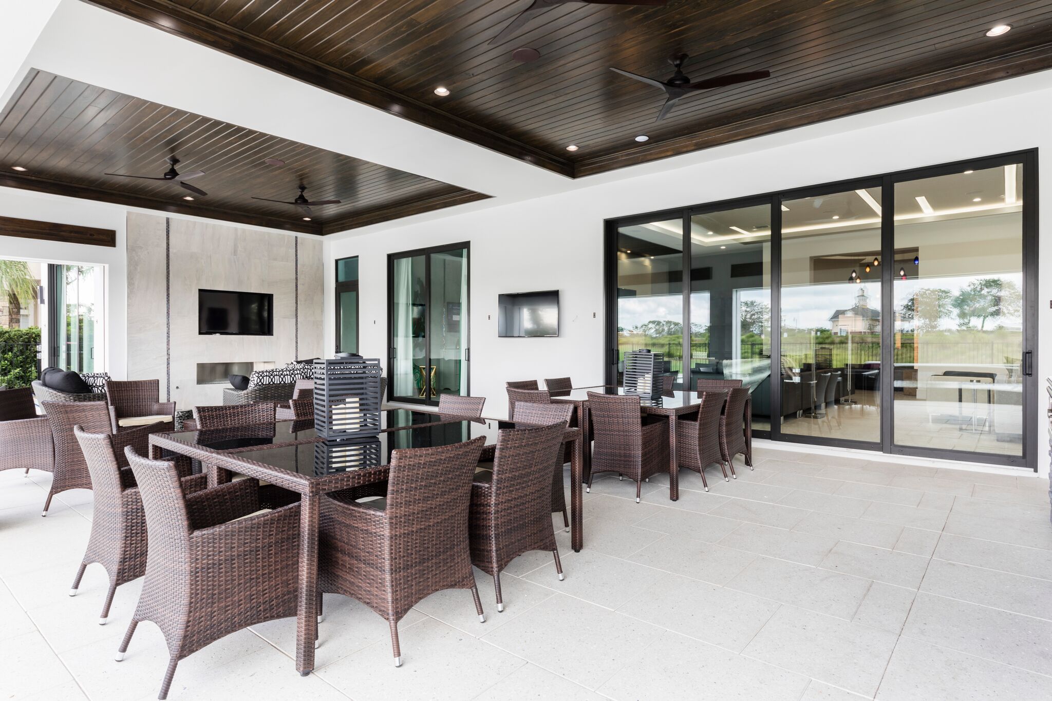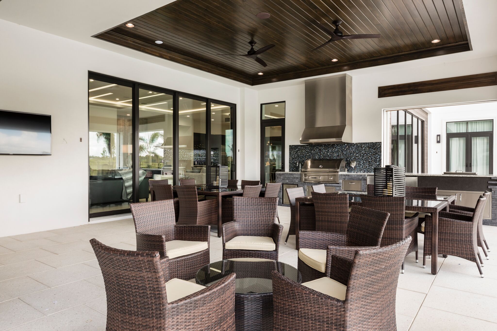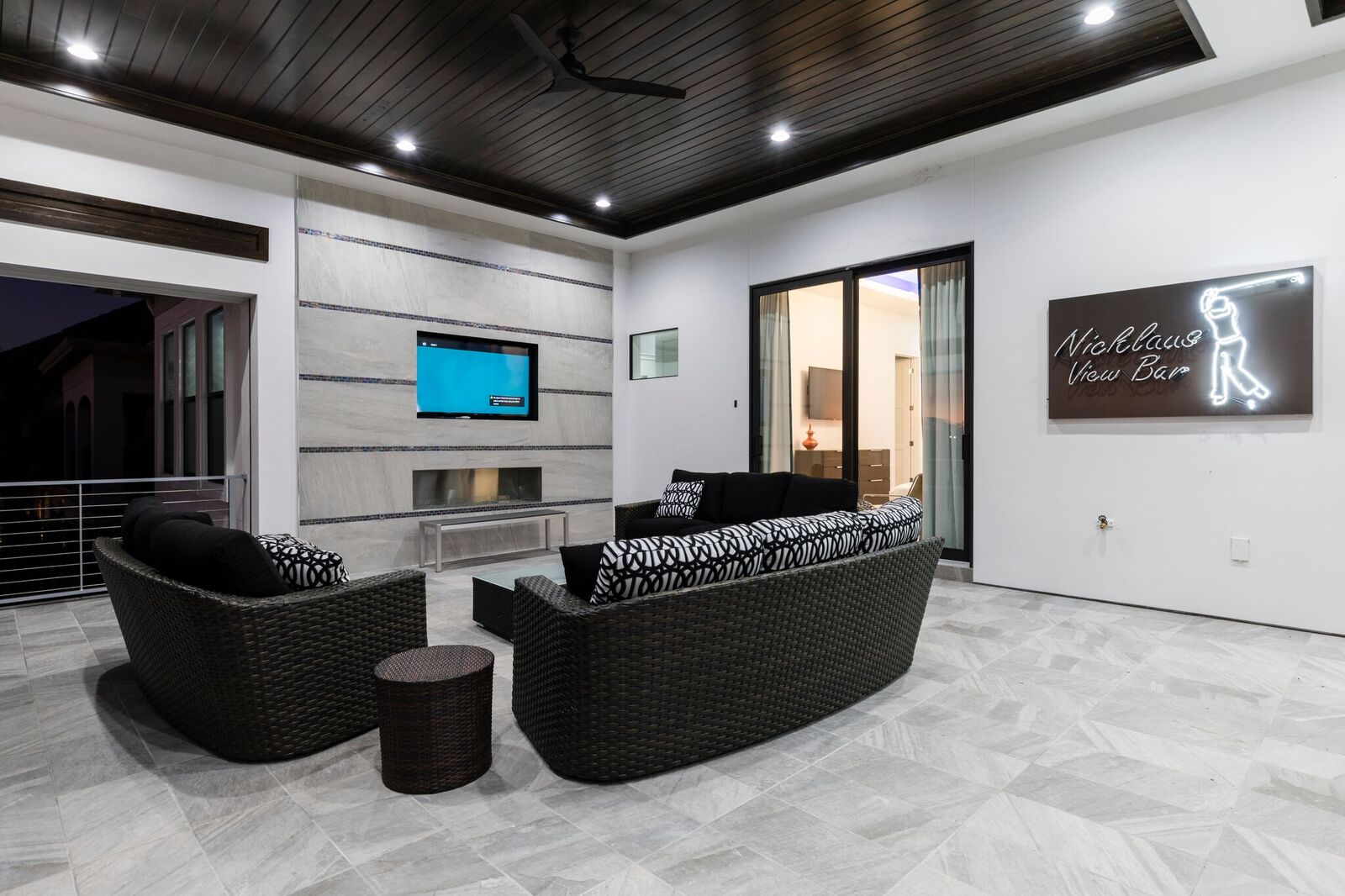 In addition to the entertainment area, there is a large covered balcony terrace overlooking the golf course featuring a full sports bar with comfortable seating, 6 outdoor TVs and fire