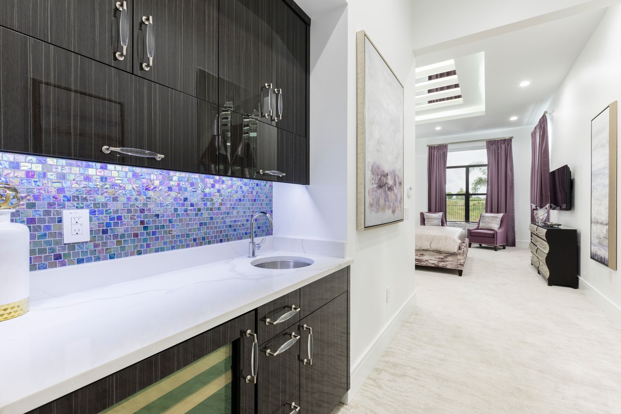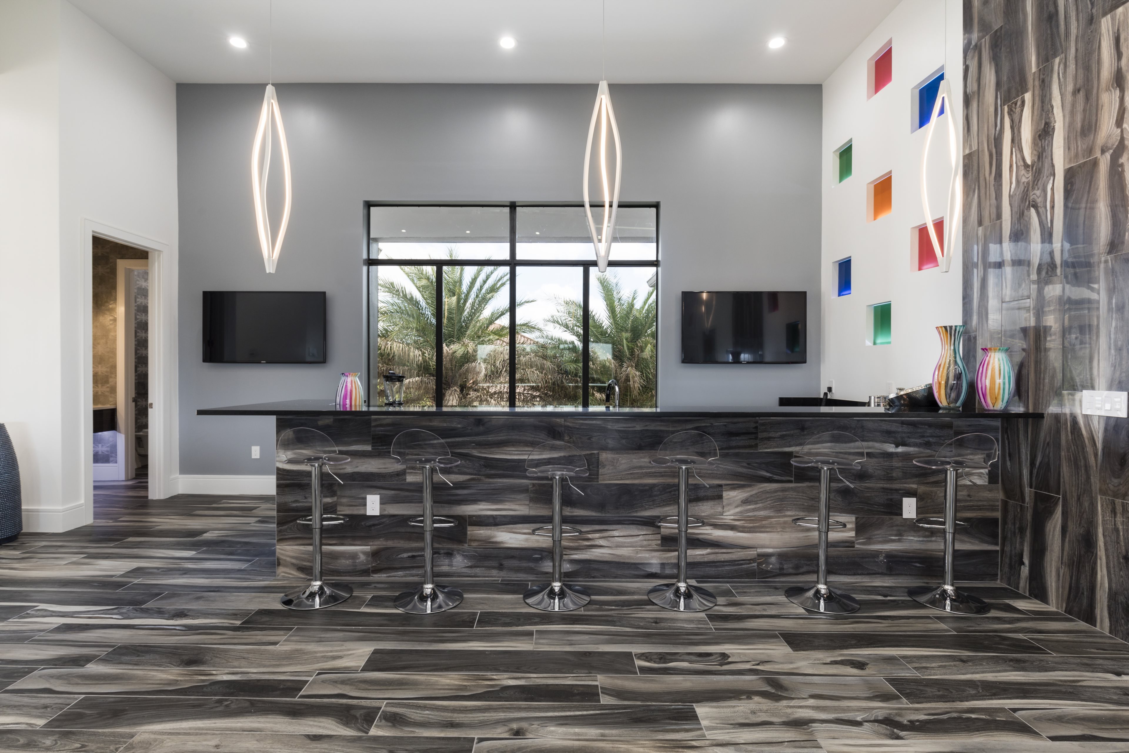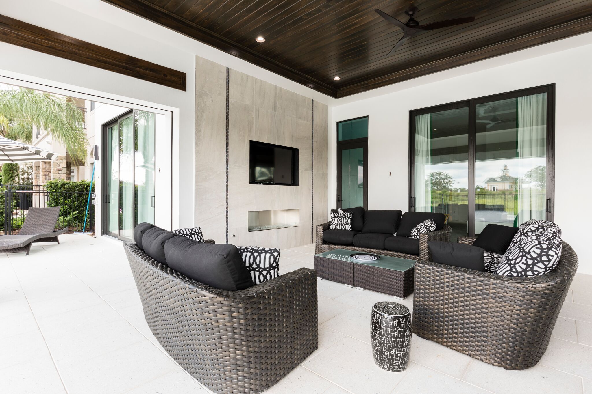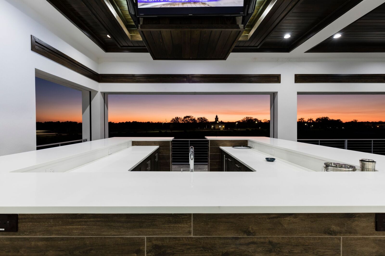 In addition to the entertainment area, there is a large covered balcony terrace overlooking the golf course featuring a full sports bar with comfortable seating, 6 outdoor TVs and fire