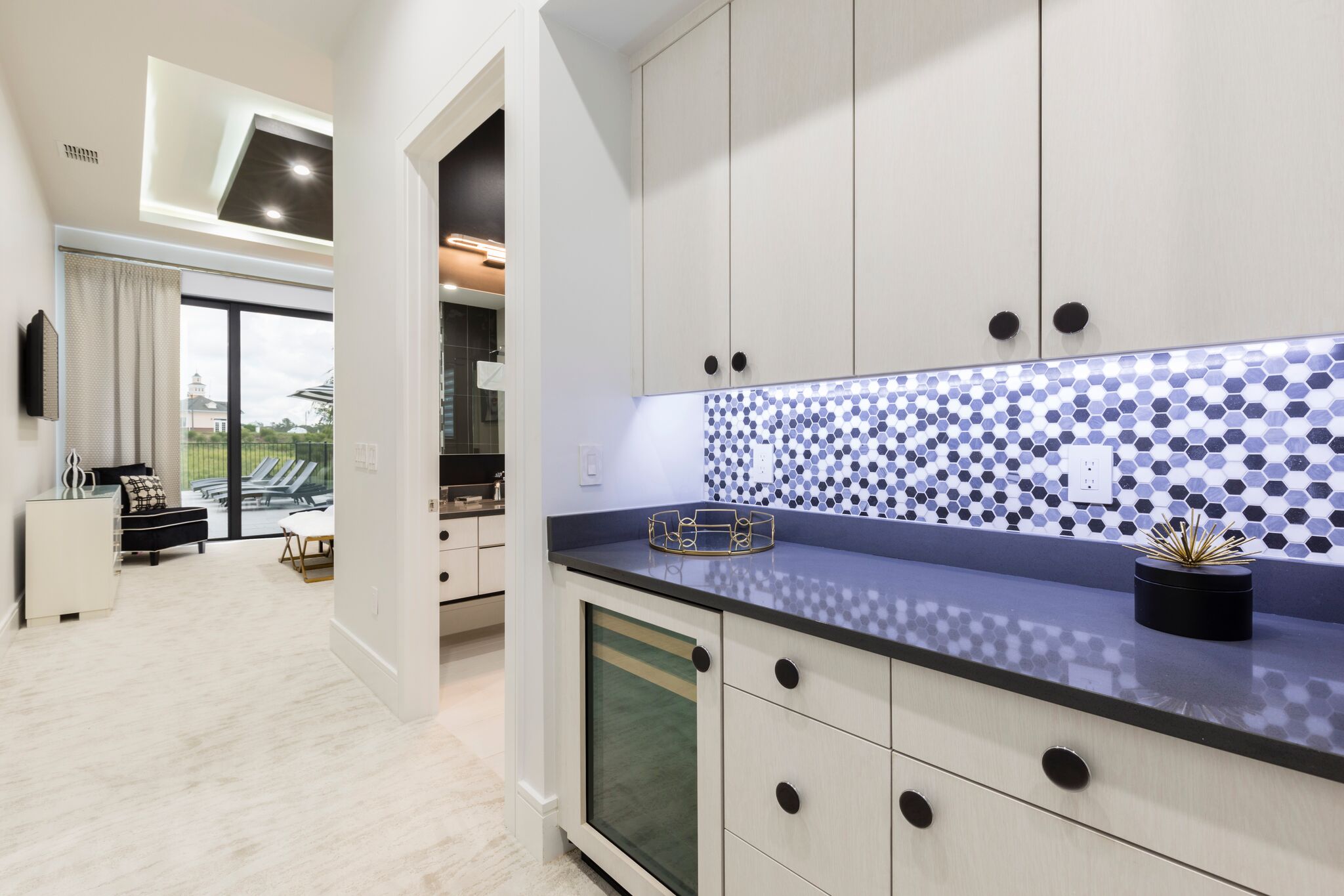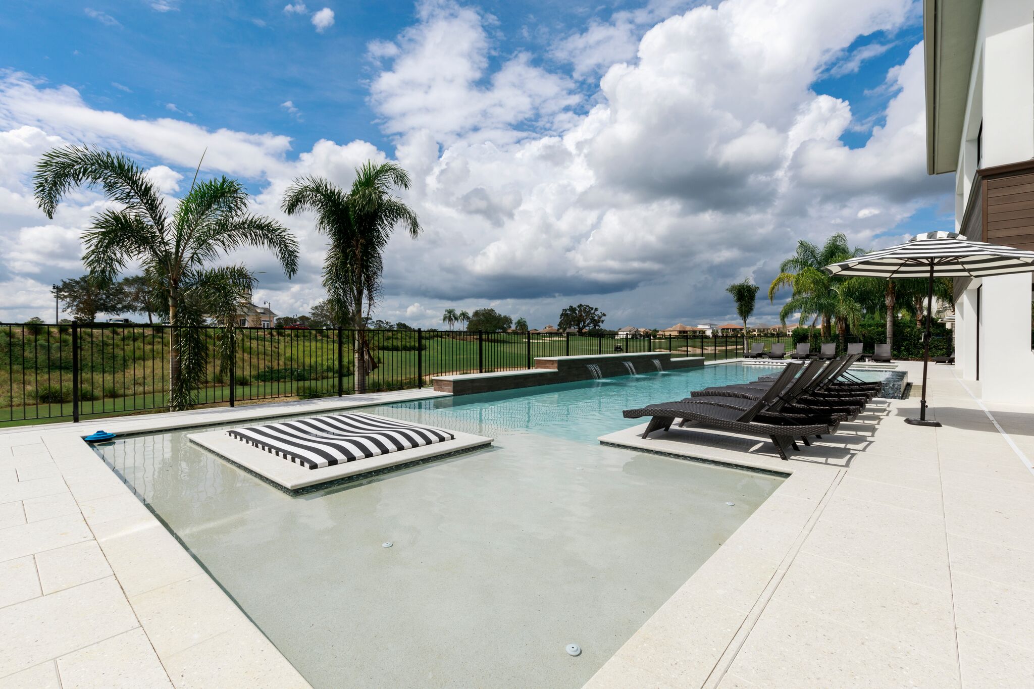 To compliment this amazing villa, there is a huge outdoor patio and pool area, which spans the entire width of this impressive property. With plenty of space for every guest to enjoy the Florida sunshine, there are shallow splash areas within the pool that are perfect for young children, a huge spa which can comfortably seats 10 people and two additional ‘floating’ loungers where you can relax and enjoy the tremendous views of the golf course. In addition to this, there is over 2500 sq.ft of covered outdoor living space. From a full-blown Sports Bar on the upstairs balcony to a large gourmet outdoor kitchen and gathering area downstairs, this really is the perfect balance of indoor and outdoor living.