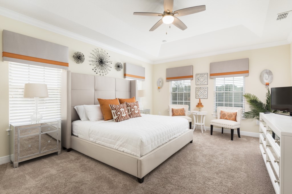 King sized Master with en suite (shower, tub, twin vanities), 2x accent chairs, private balcony over the pool deck (2x patio chairs)