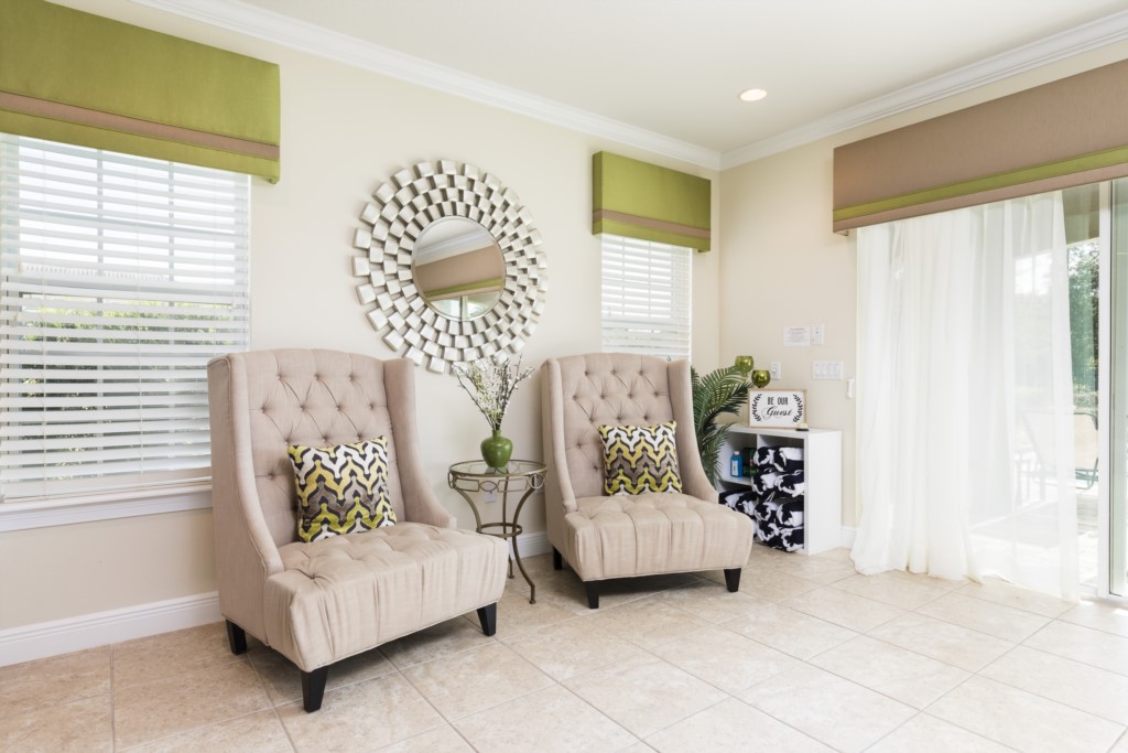 Spacious comfortable seating area with a sofa and 2x accent chairs overlooking the private pool deck through sliding glass doors