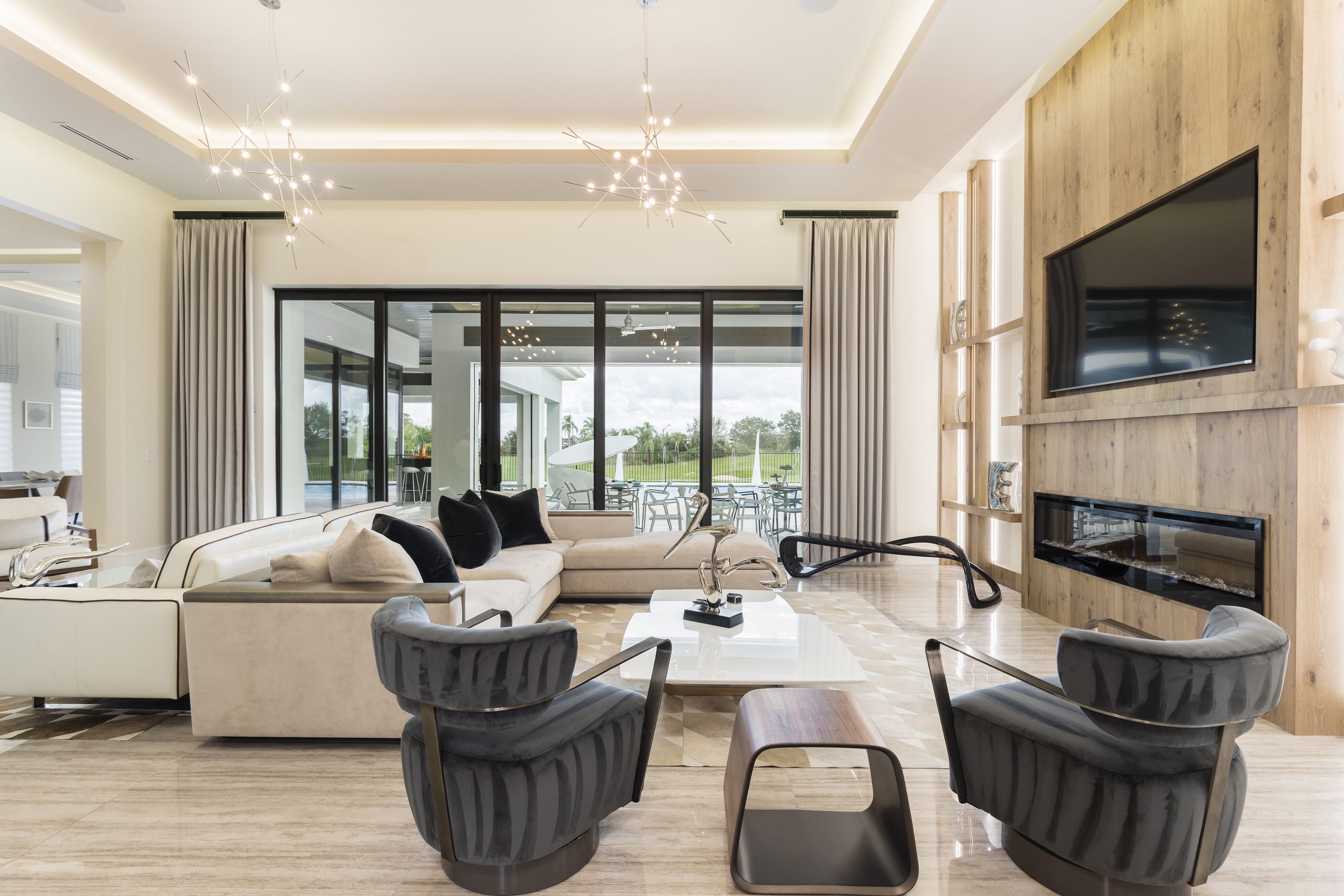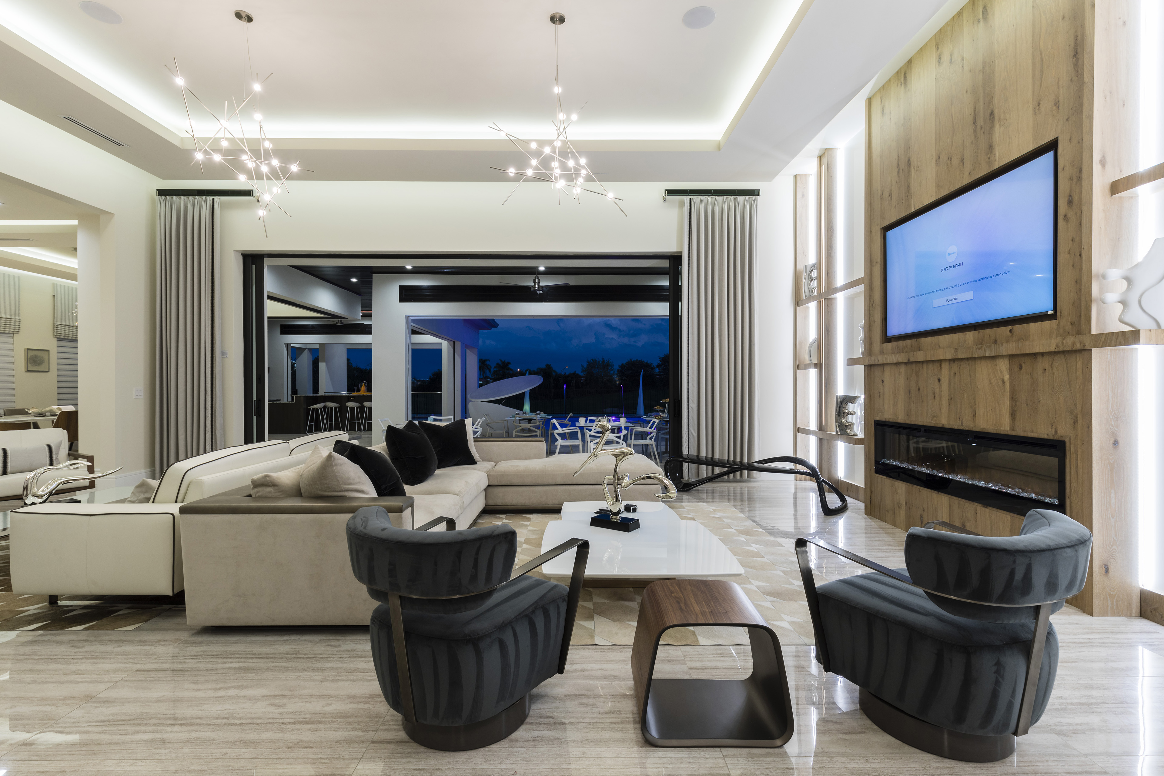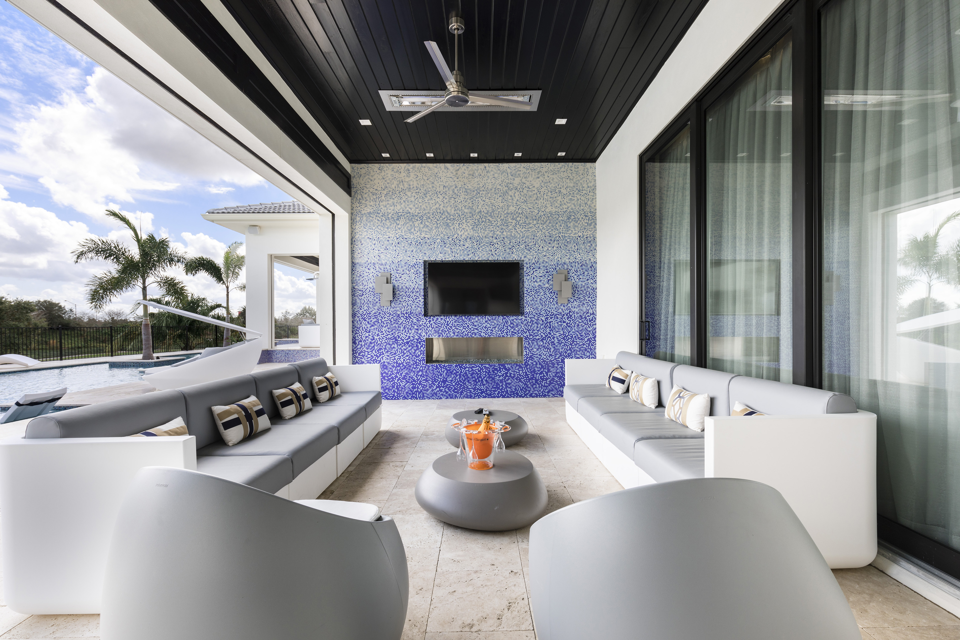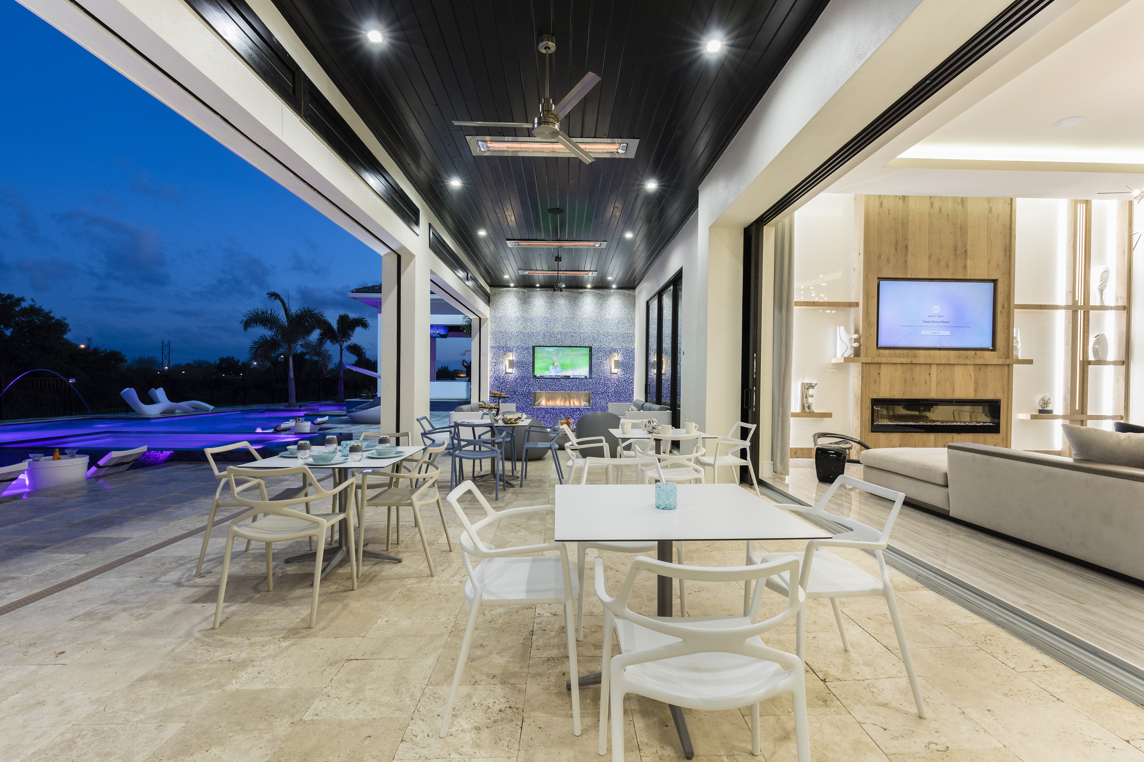 Spacious comfortable seating area with 4x accent chairs, sofa, sectional, and feature fireplace overlooking the private pool deck through sliding glass doors