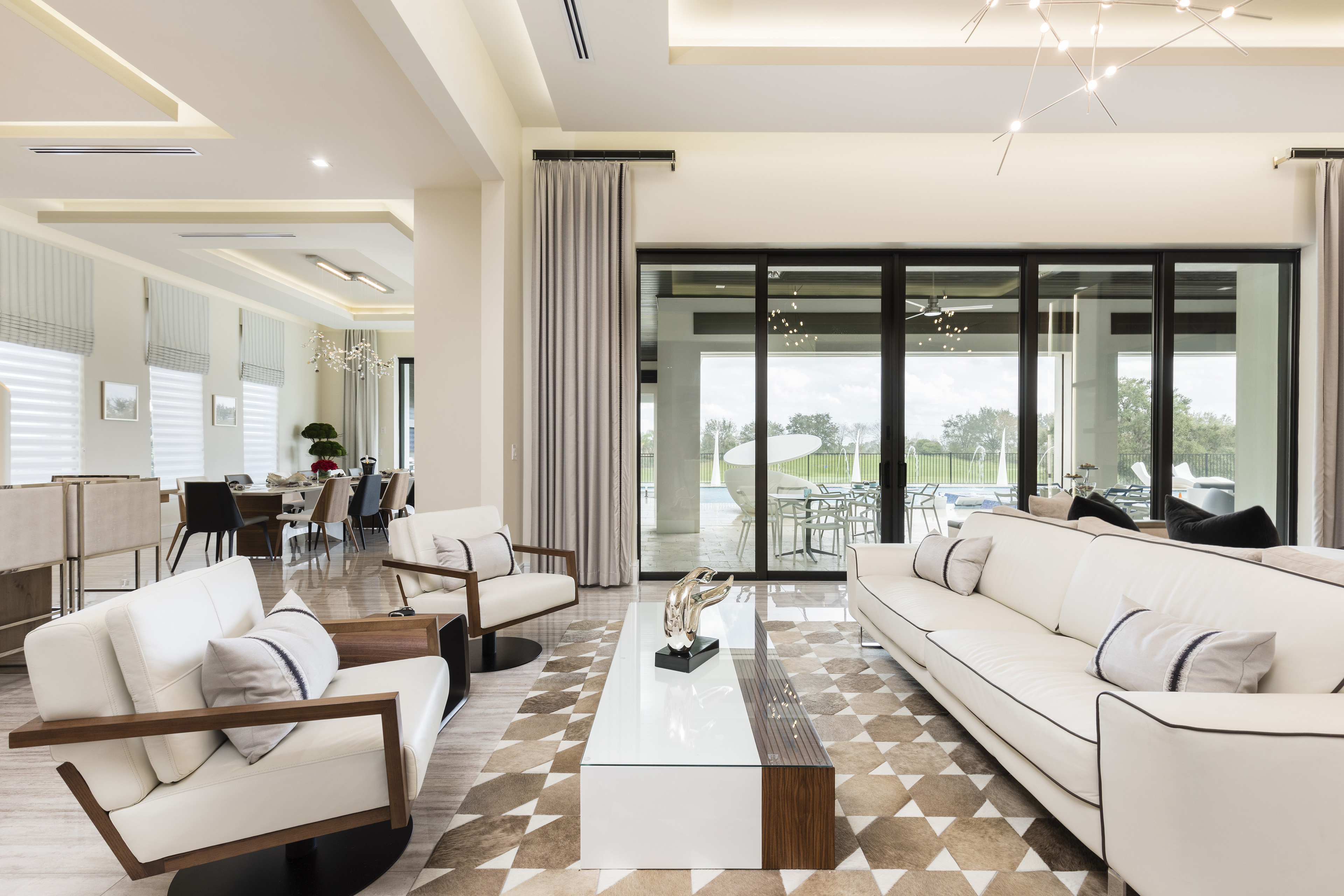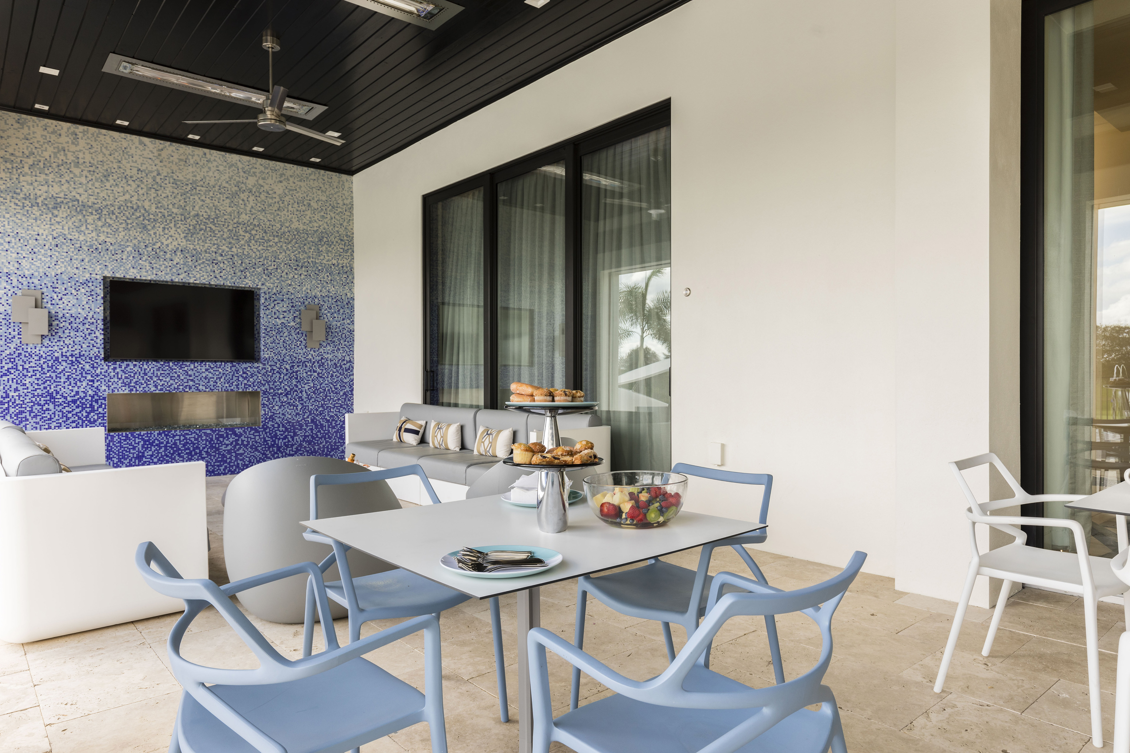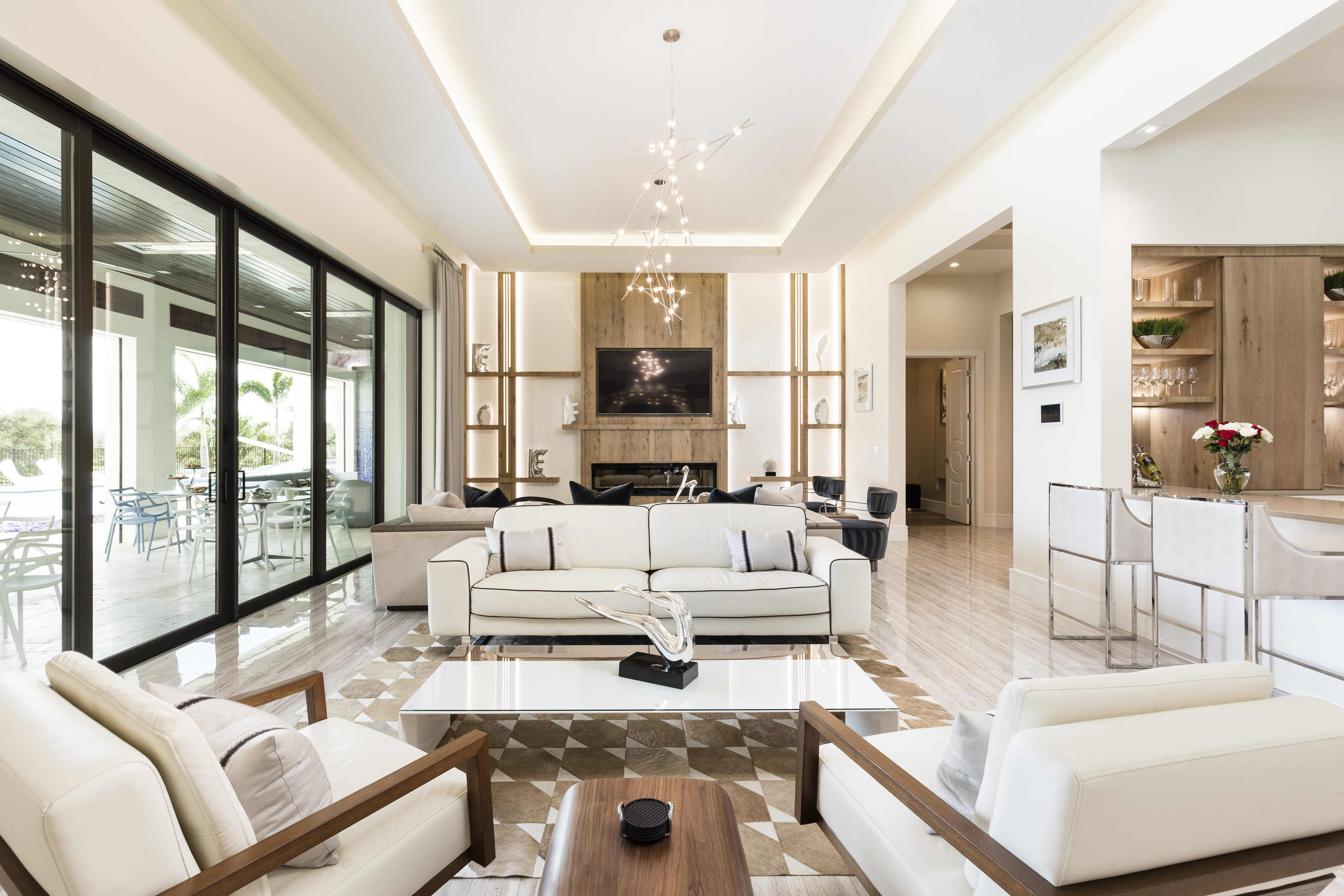 Spacious comfortable seating area with 4x accent chairs, sofa, sectional, and feature fireplace overlooking the private pool deck through sliding glass doors