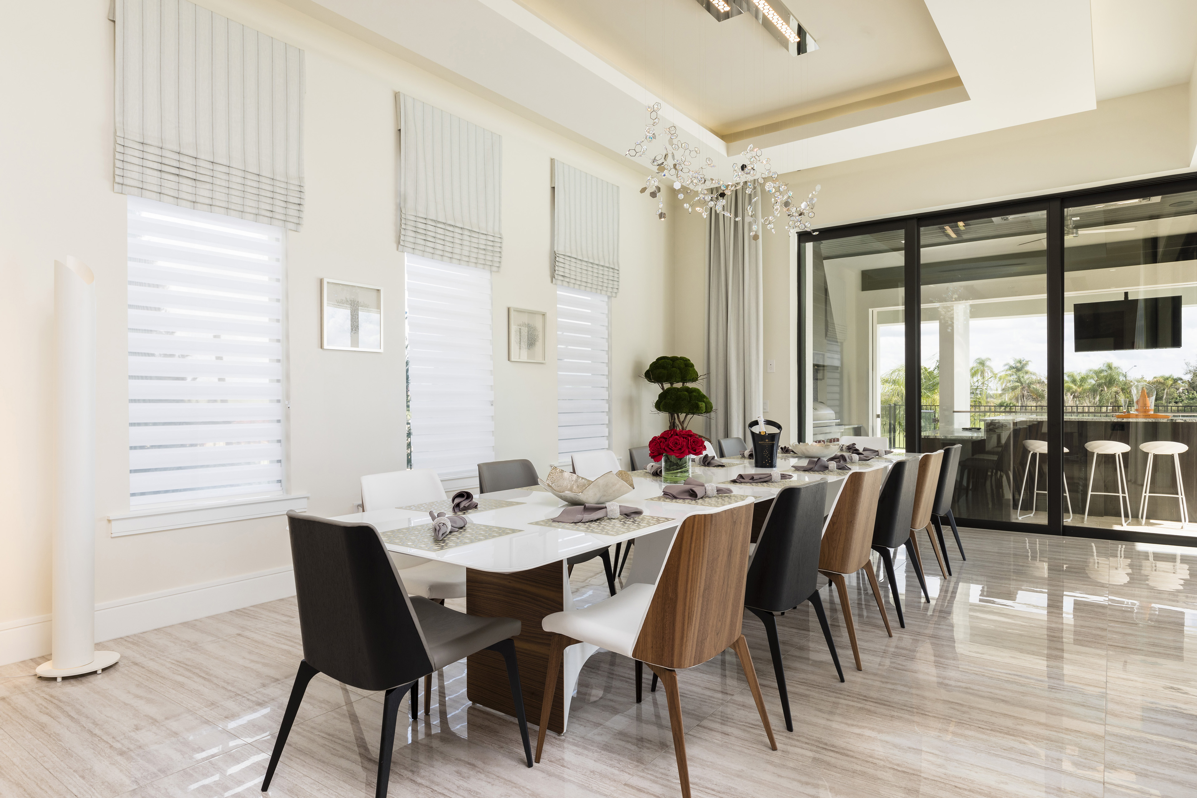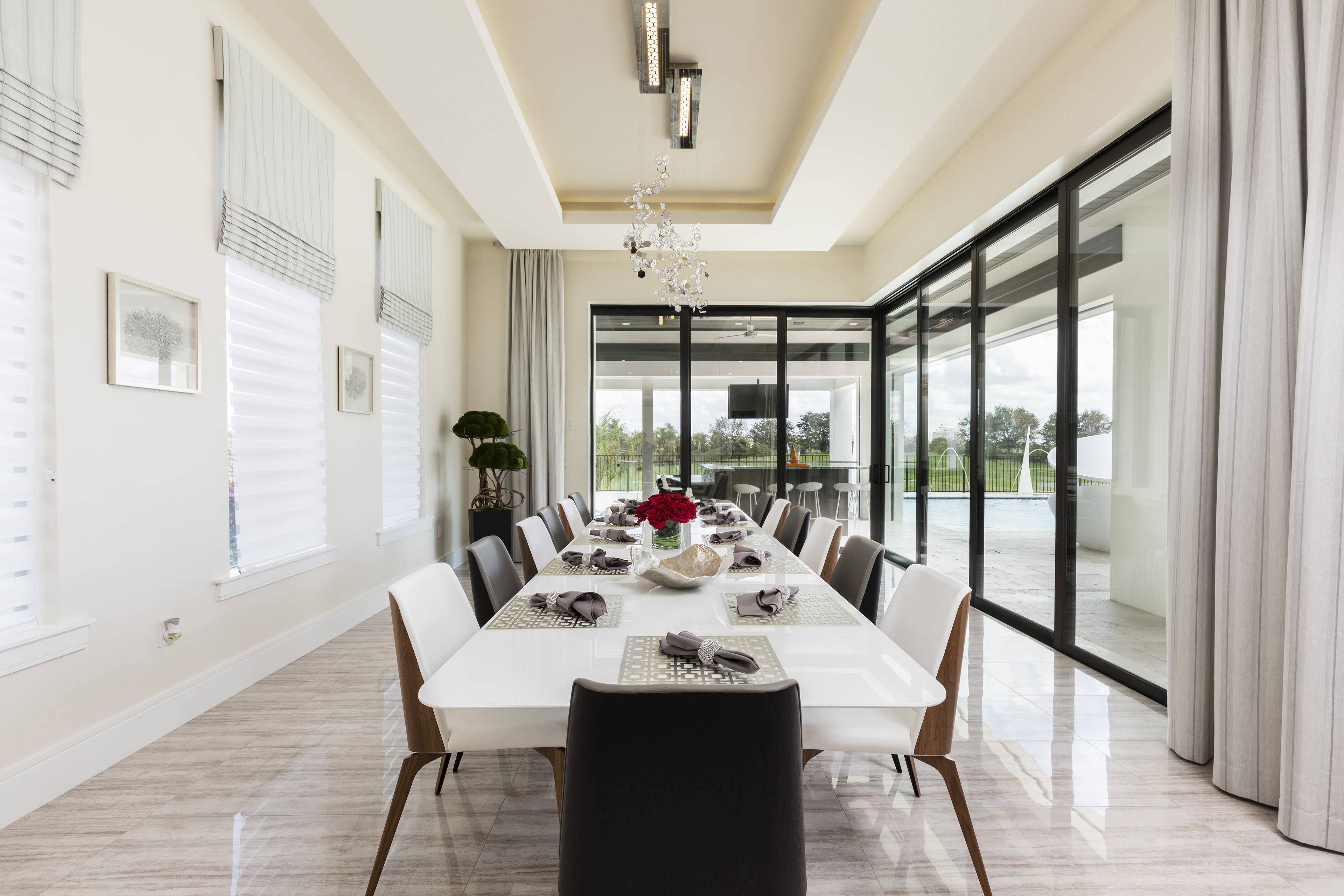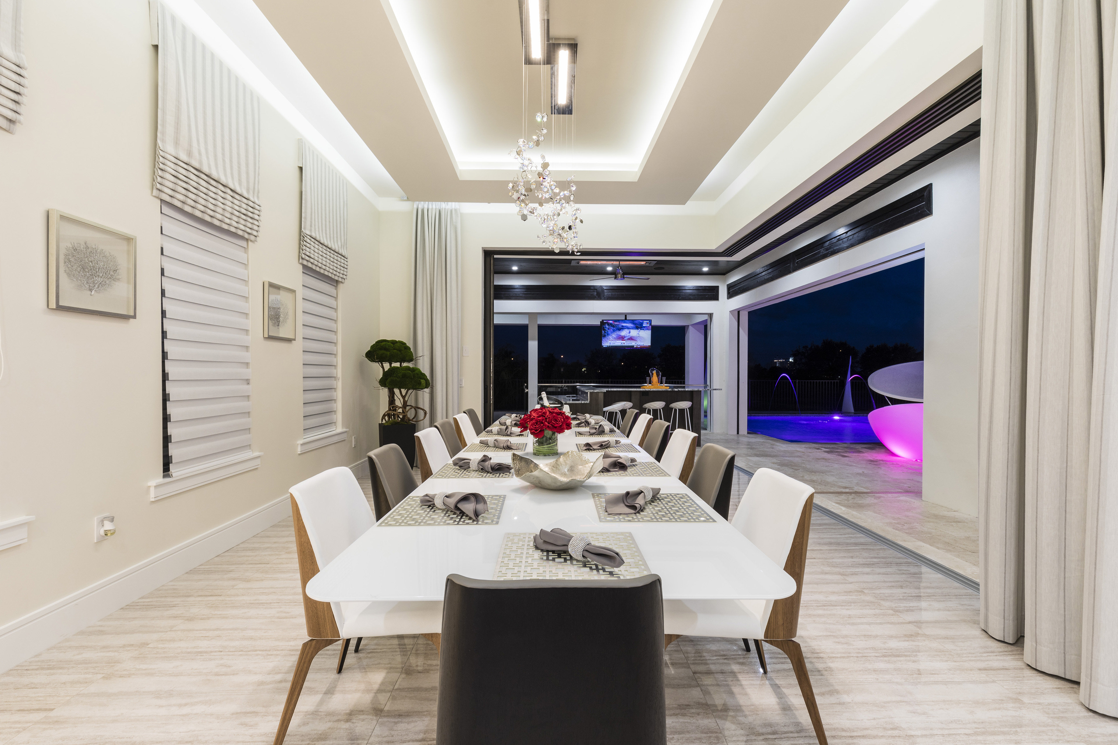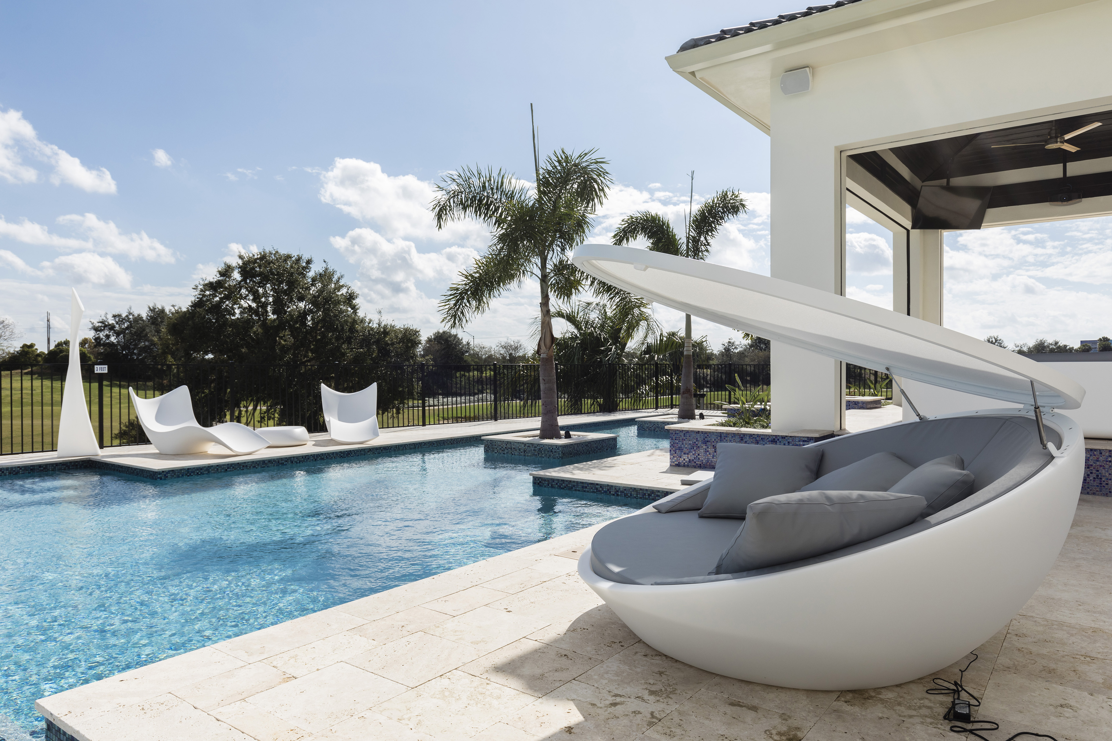 Spacious comfortable seating area with 4x accent chairs, sofa, sectional, and feature fireplace overlooking the private pool deck through sliding glass doors