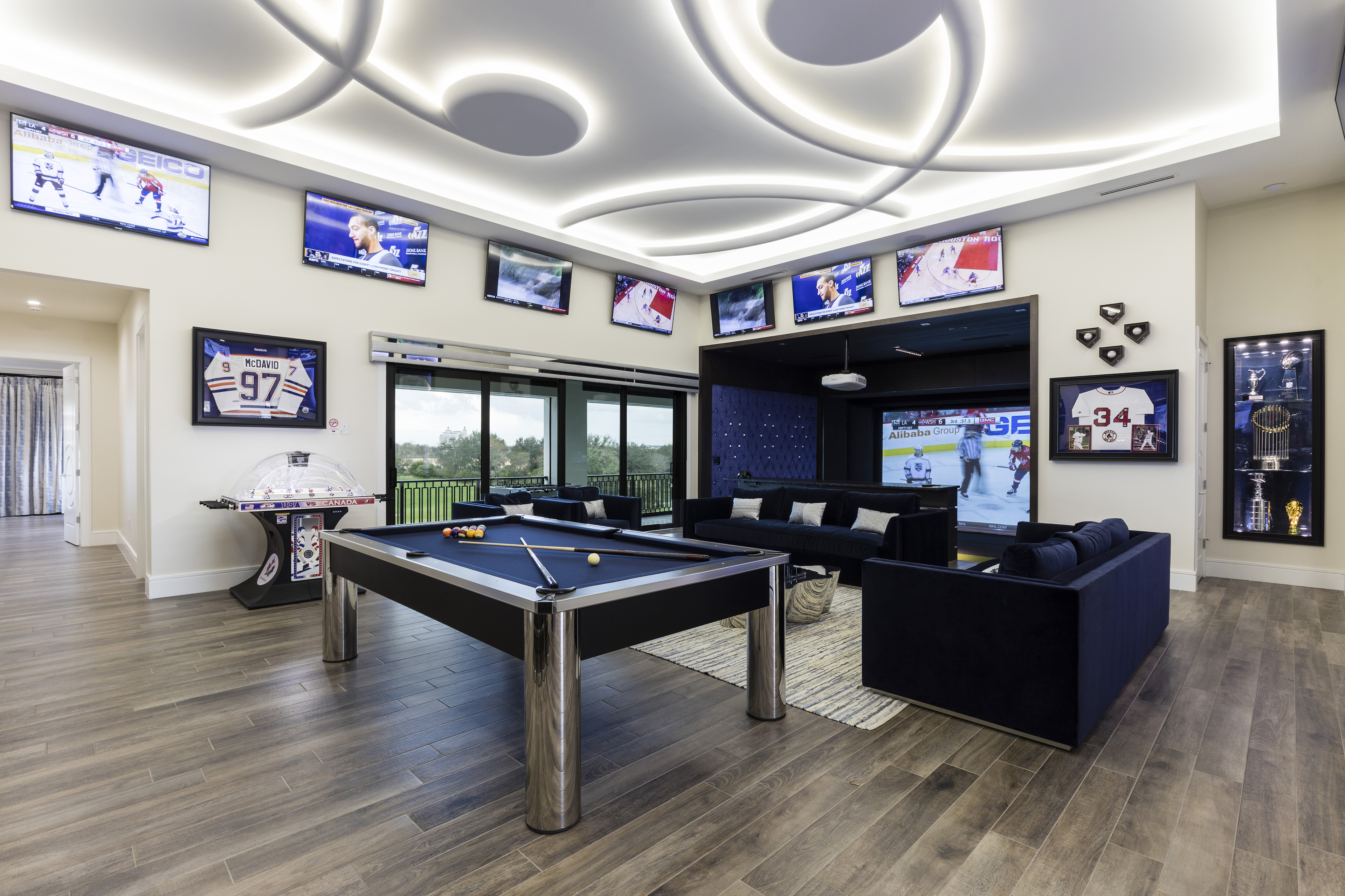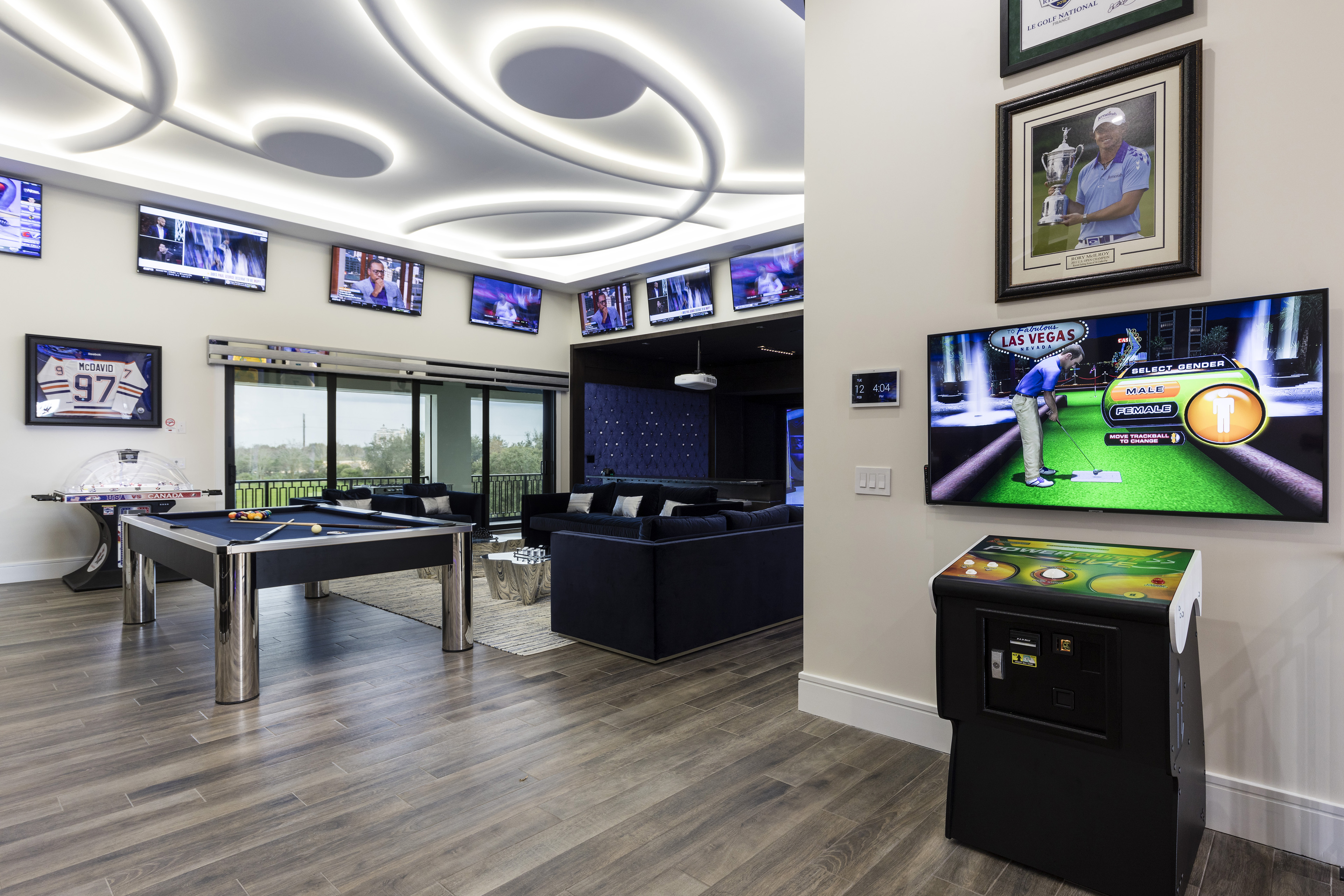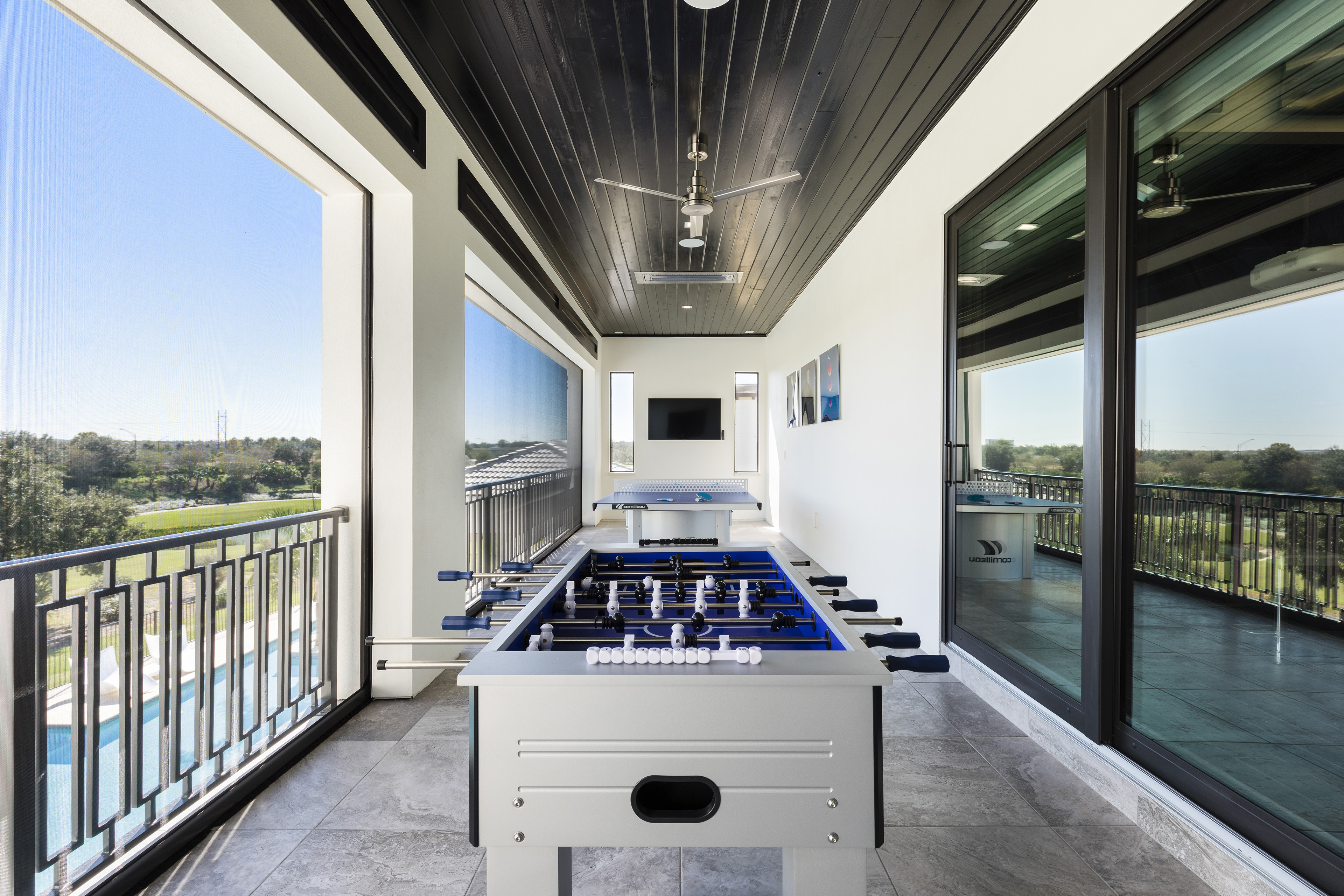 Upper floor loft area has 15x flat screen TVs, power putt live video game, pool table, bubble air hockey, 2x comfortable sofas, 2x accent chairs, 4x and 5x seat bar, golf simulator, private balcony access over the pool deck (2x flat screen TVs, foosball and ping pong table)