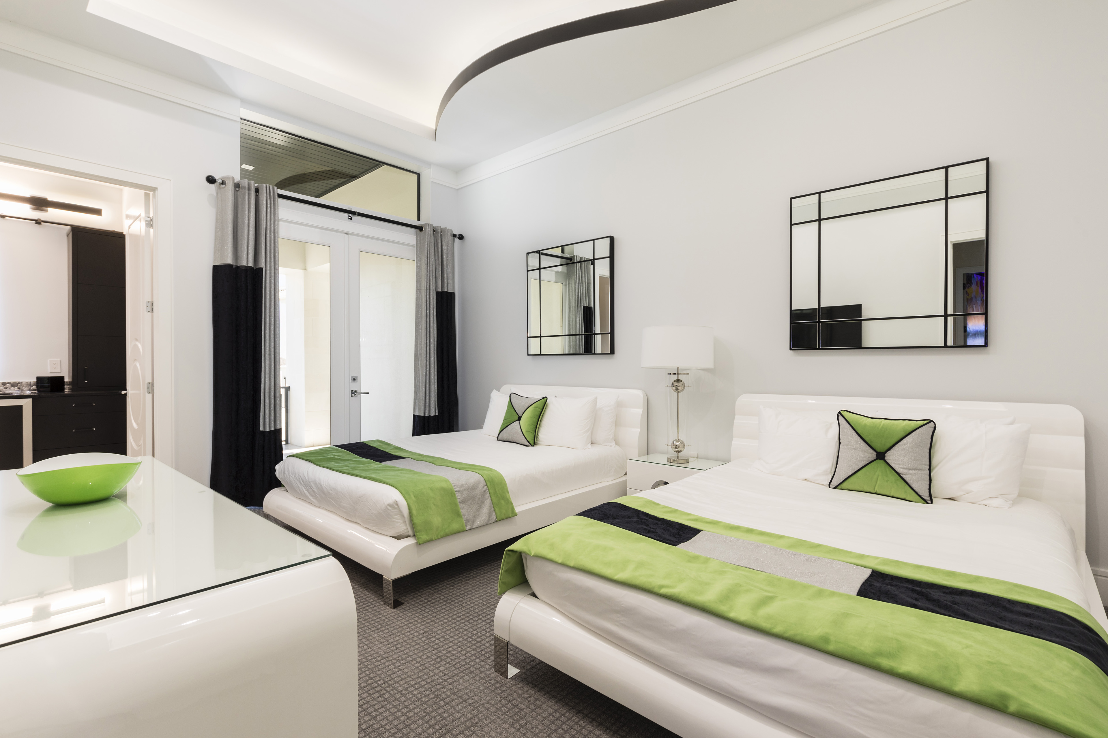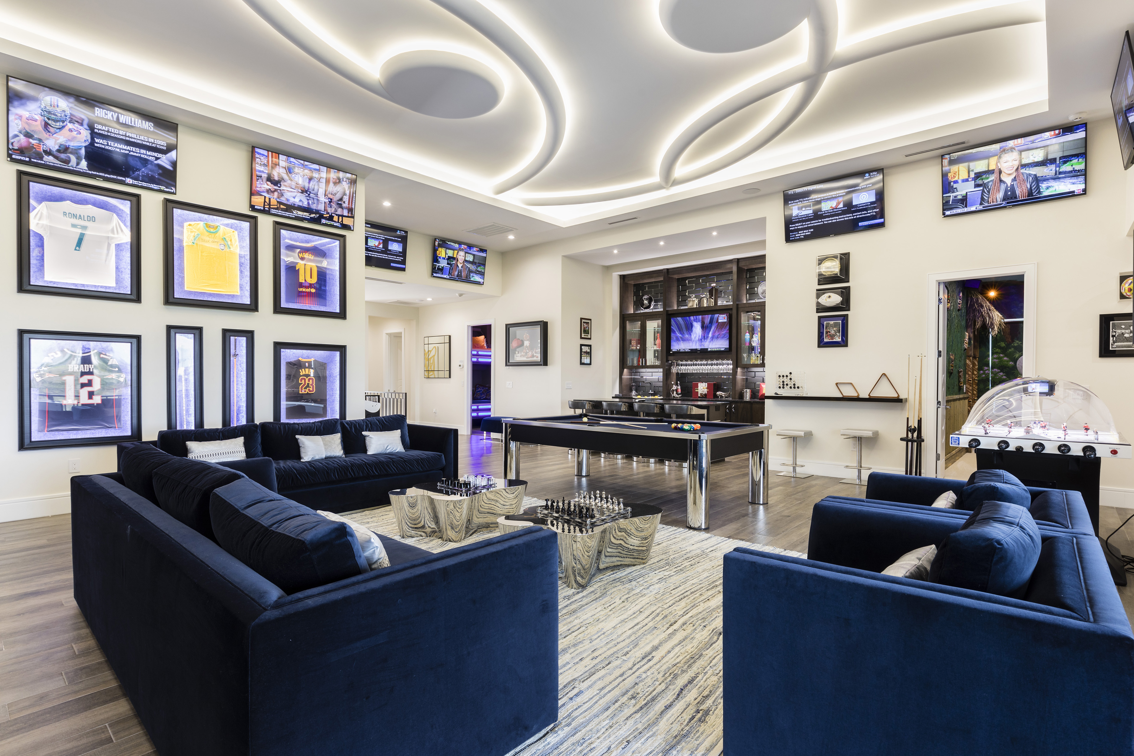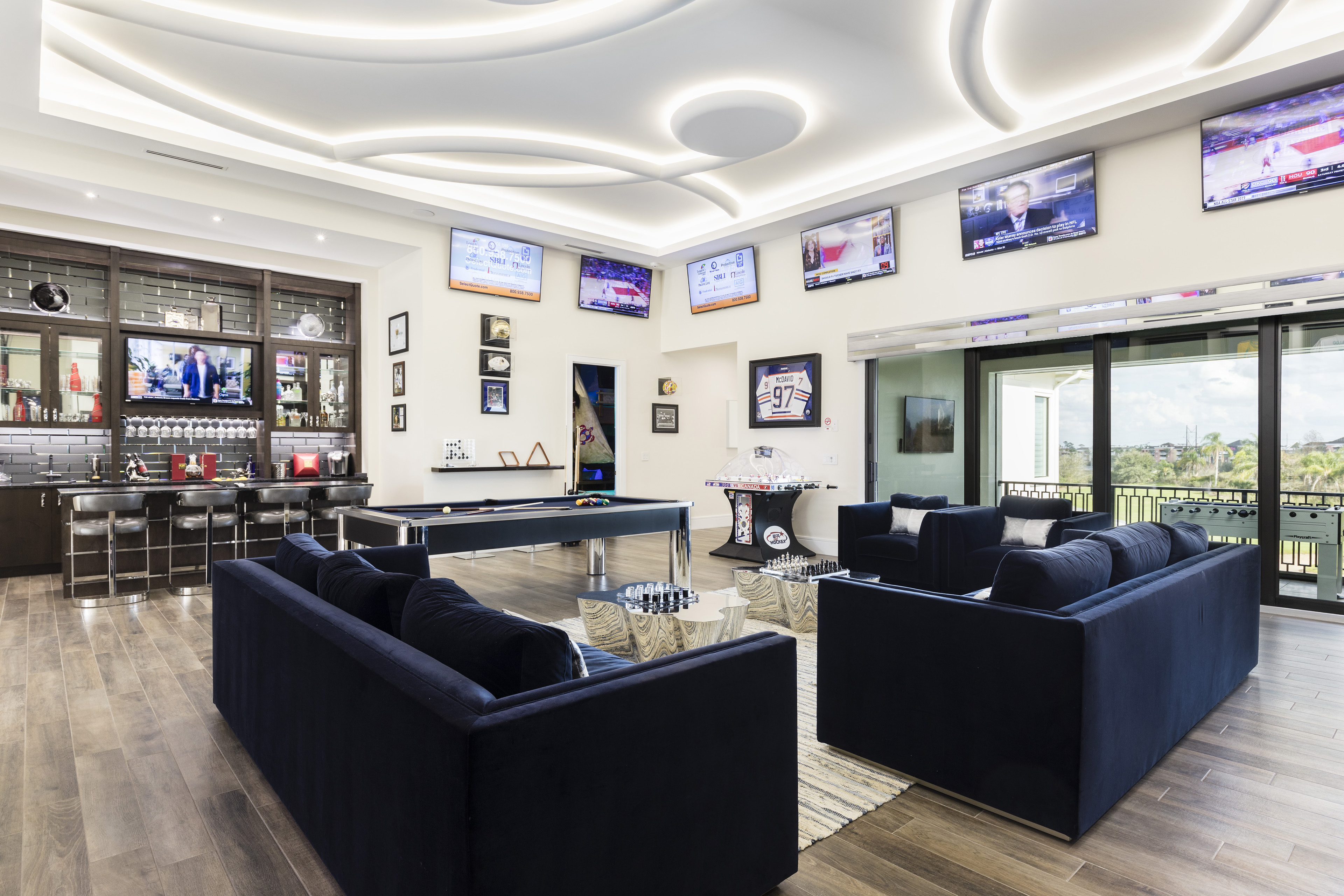 Upper floor loft area has 15x flat screen TVs, power putt live video game, pool table, bubble air hockey, 2x comfortable sofas, 2x accent chairs, 4x and 5x seat bar, golf simulator, private balcony access over the pool deck (2x flat screen TVs, foosball and ping pong table)
