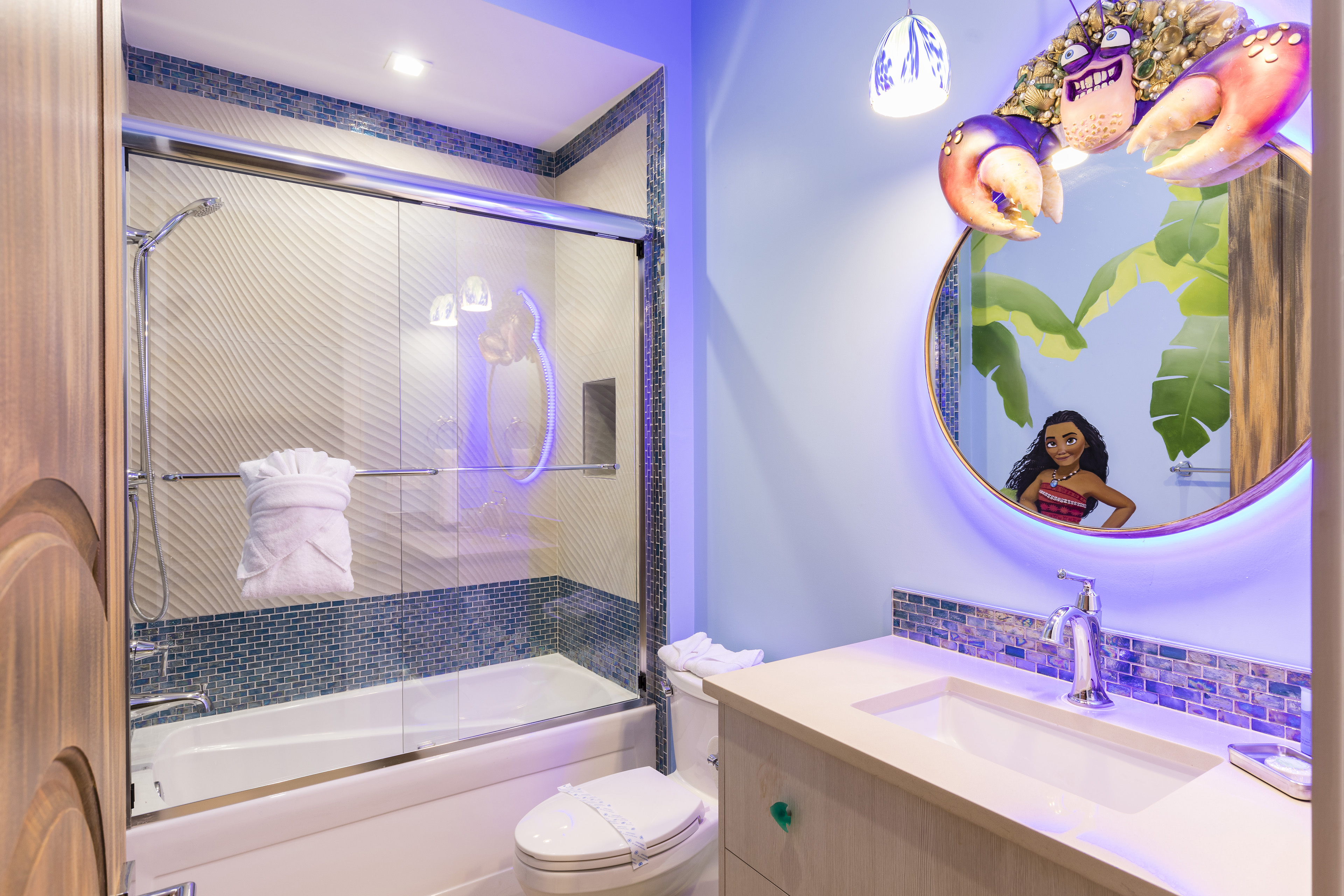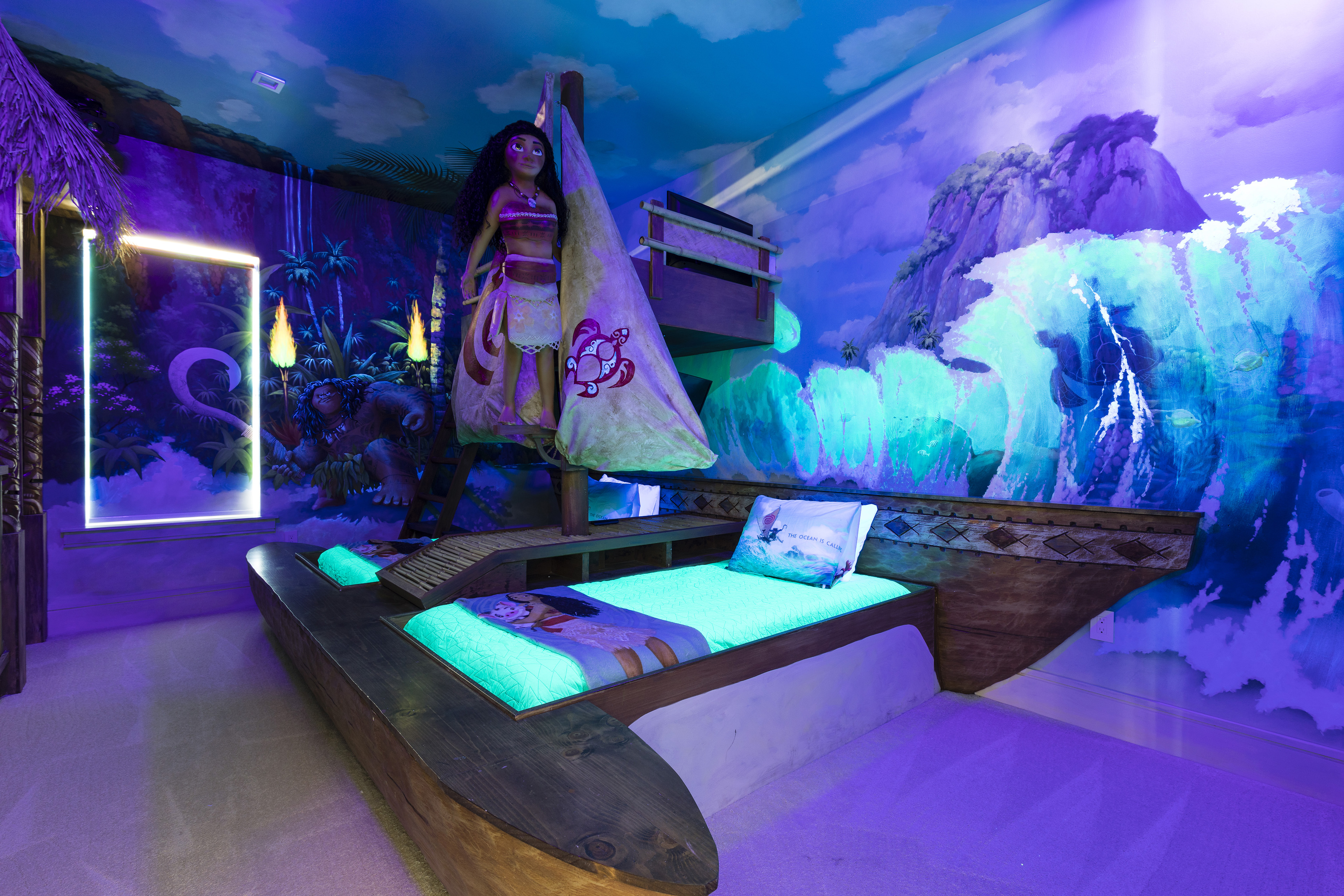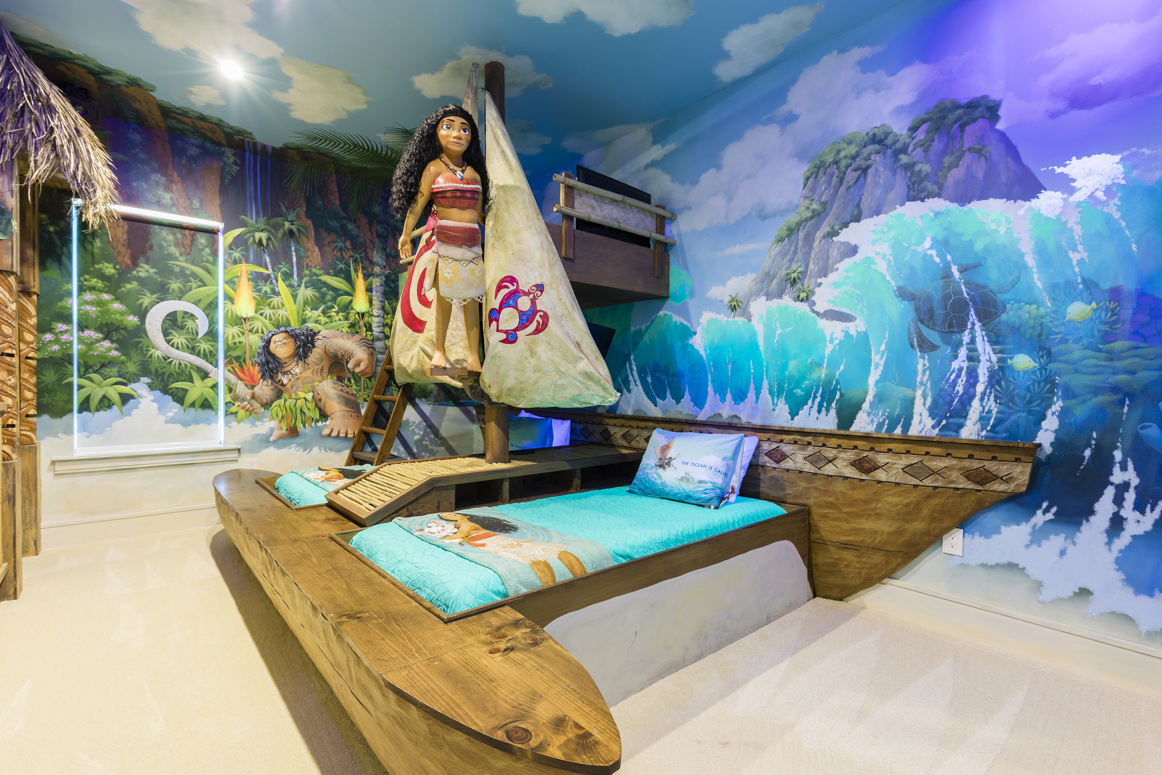 Moana themed bedroom with bunk beds (3x Twin sized beds), 3x flat screen TVs, en suite (shower/bath combo), secret entrance to kid's themed playroom
