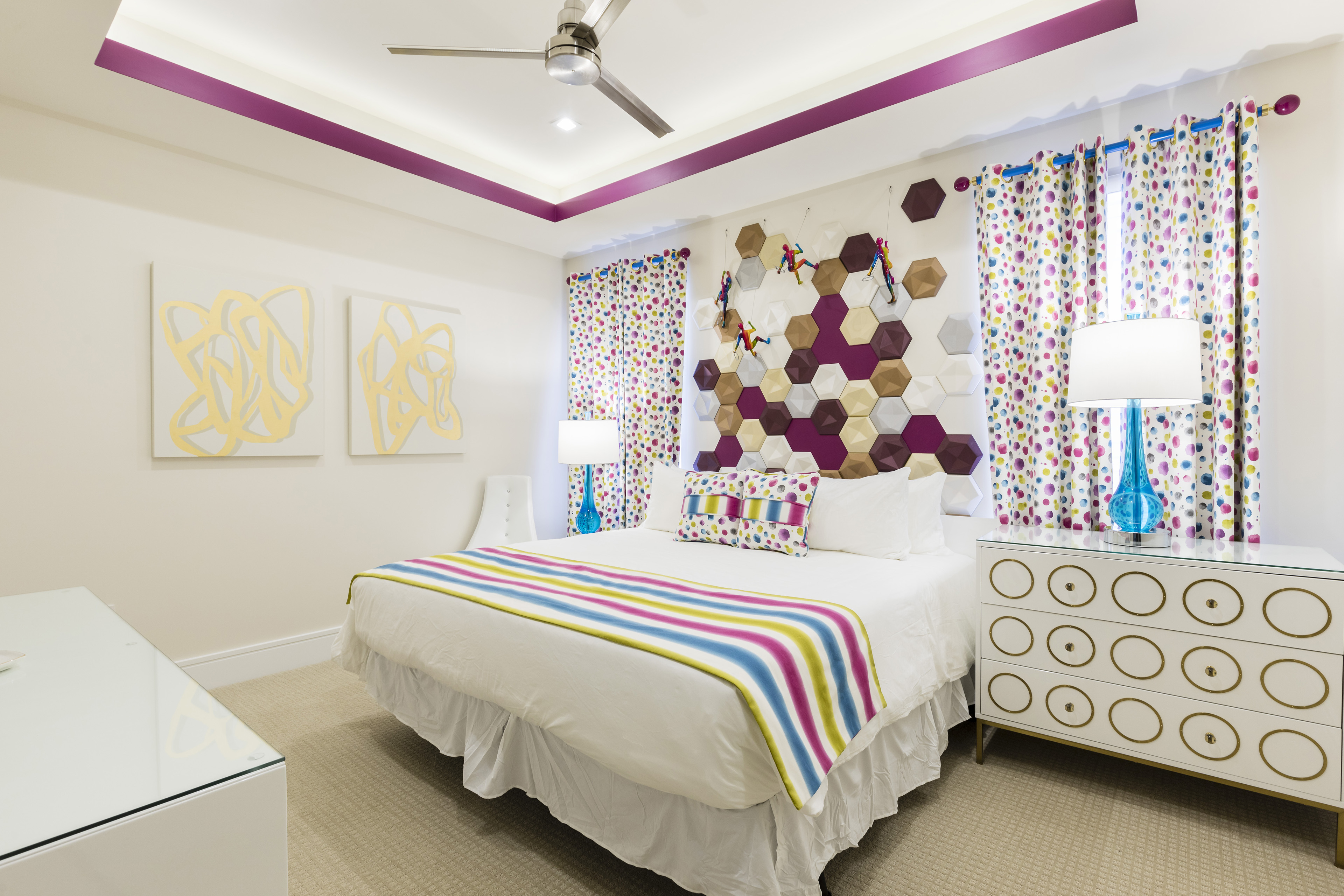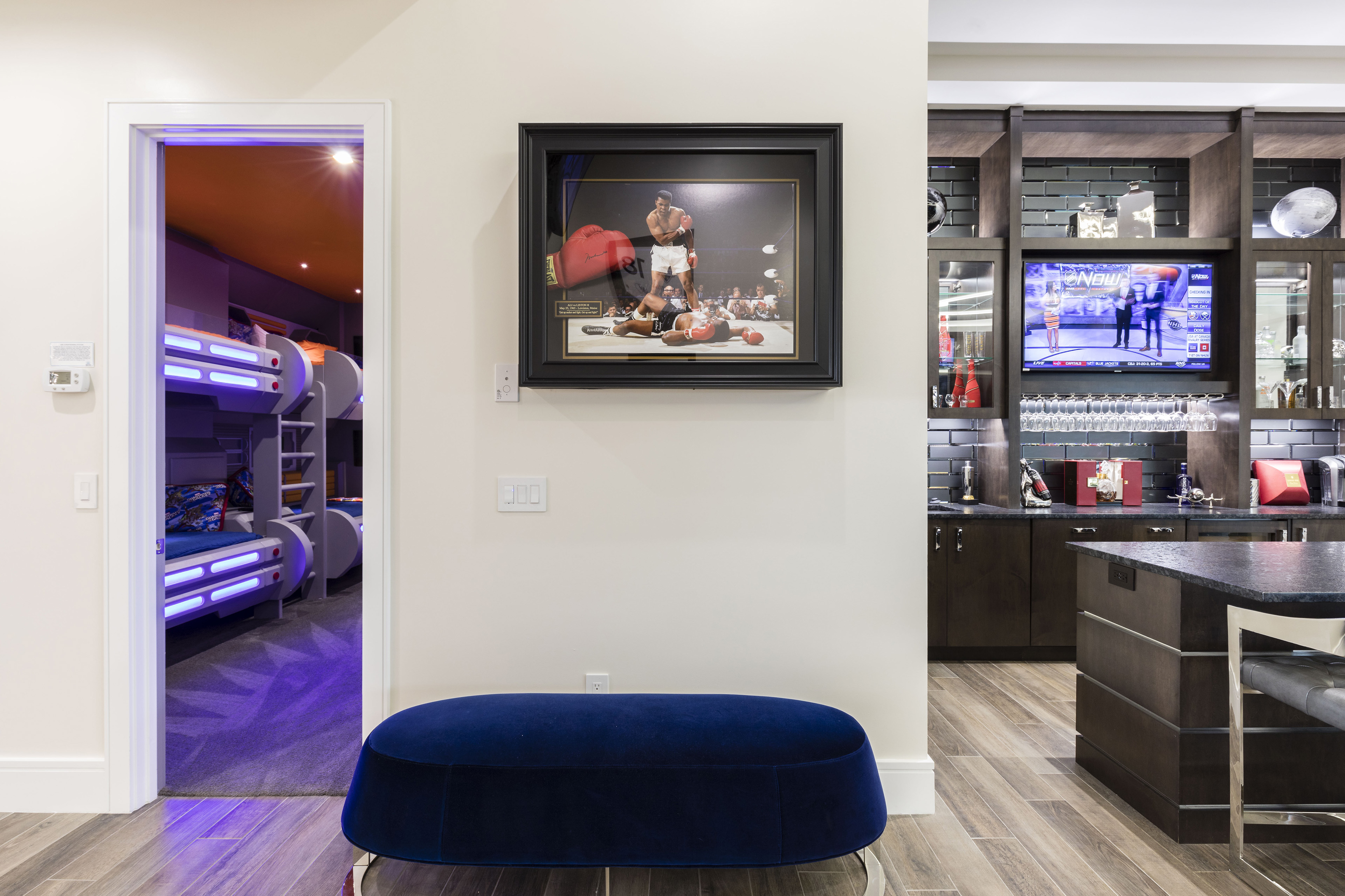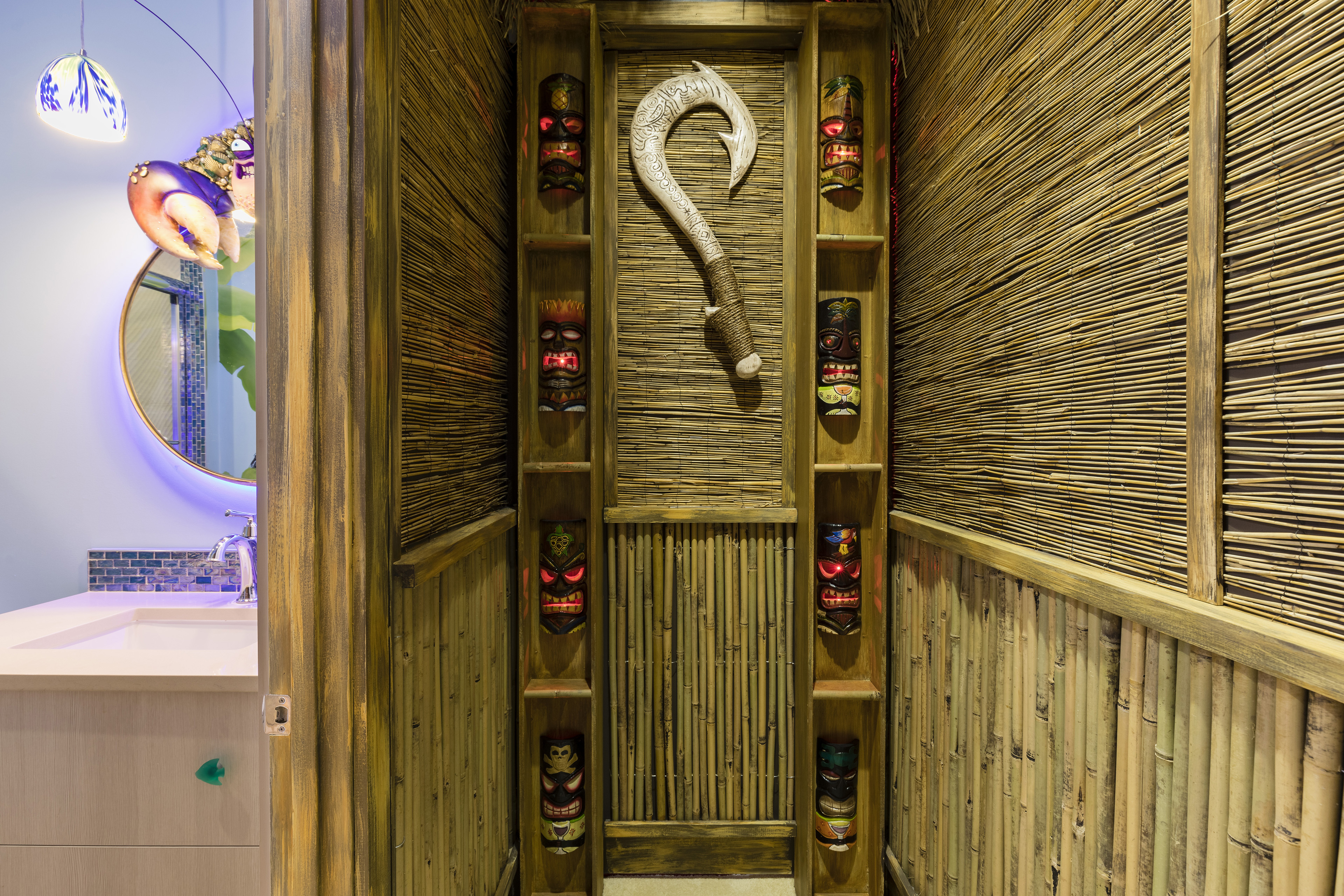 Moana themed bedroom with bunk beds (3x Twin sized beds), 3x flat screen TVs, en suite (shower/bath combo), secret entrance to kid's themed playroom