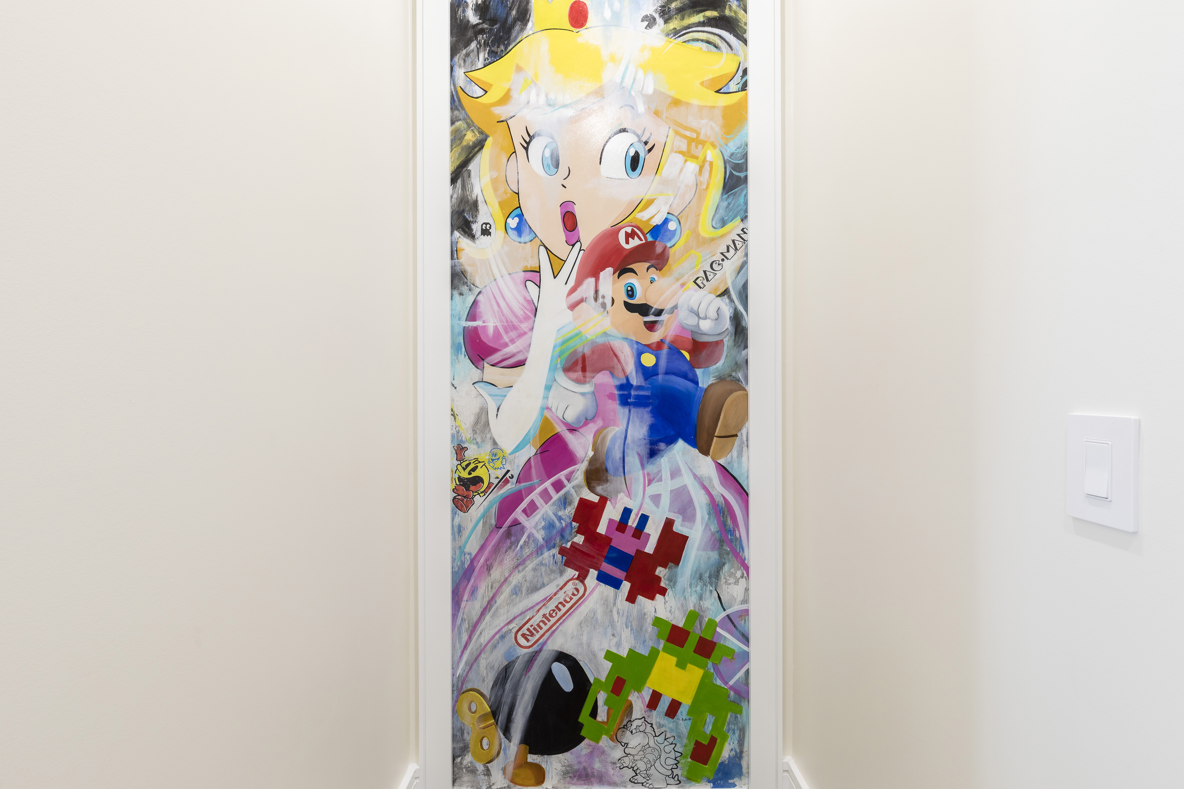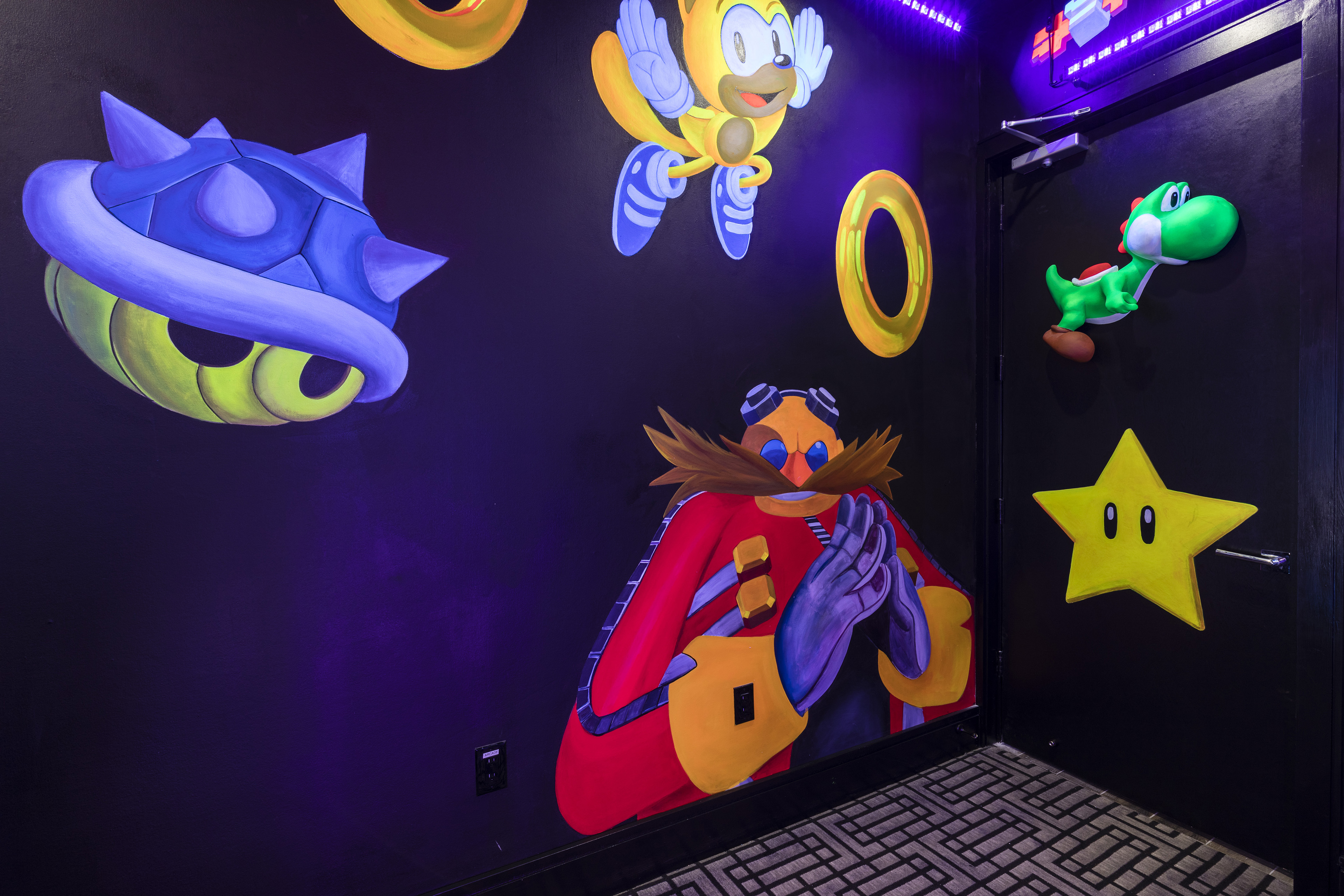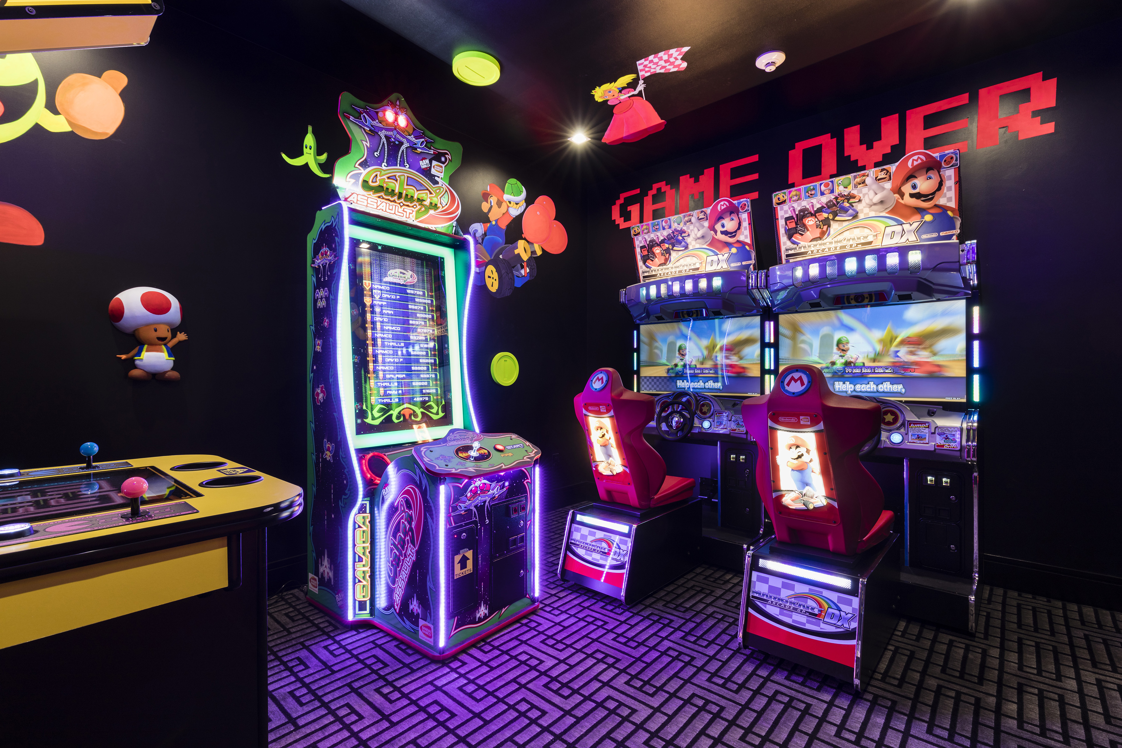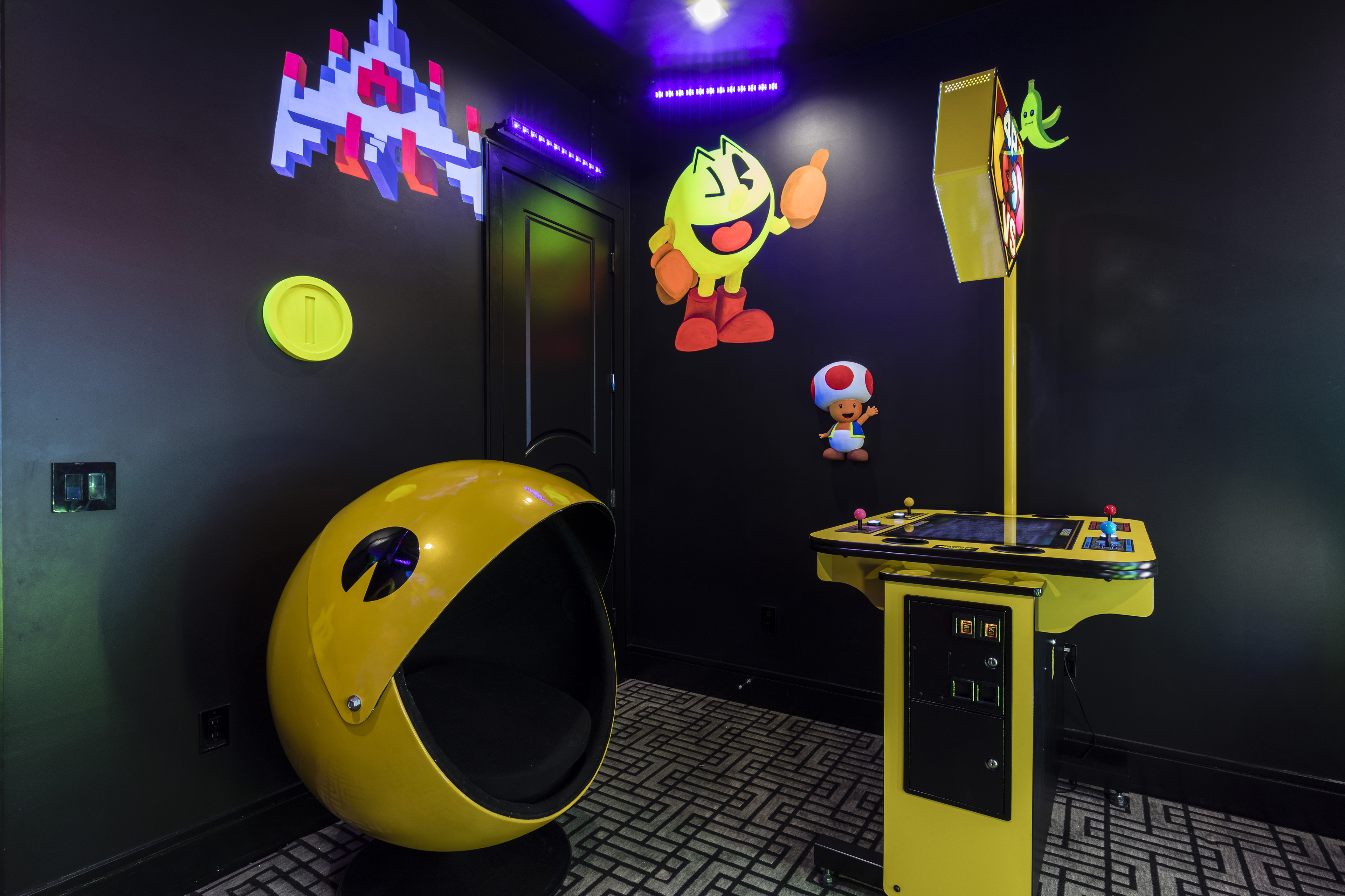 Secret arcade themed games room has a flat screen TV, accent chair, 4x player Pacman machine, 2x Mario Kart arcade video games, Galaga arcade video game