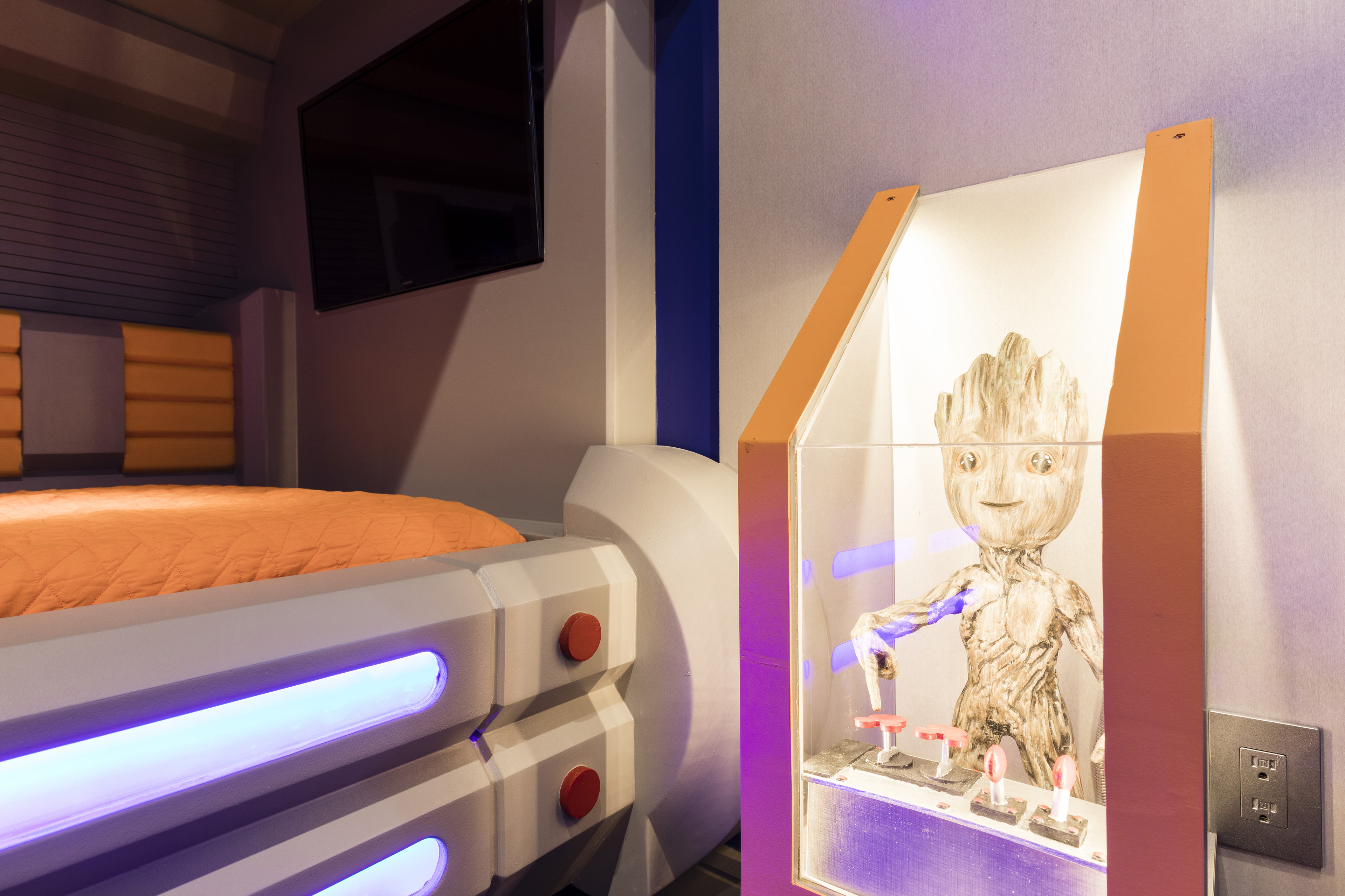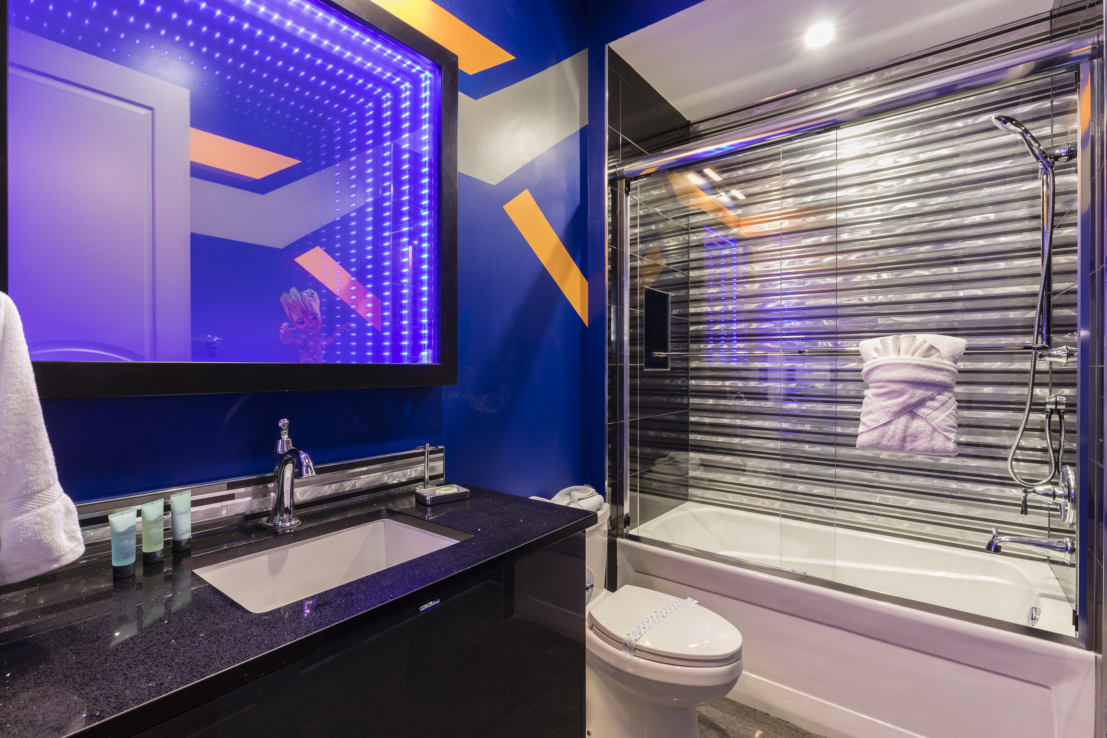Guardian Superhero themed bedroom with bunk beds (4x Twin sized beds), 4x flat screen TVs, en suite (shower/bath combo), secret entrance to kid's themed playroom