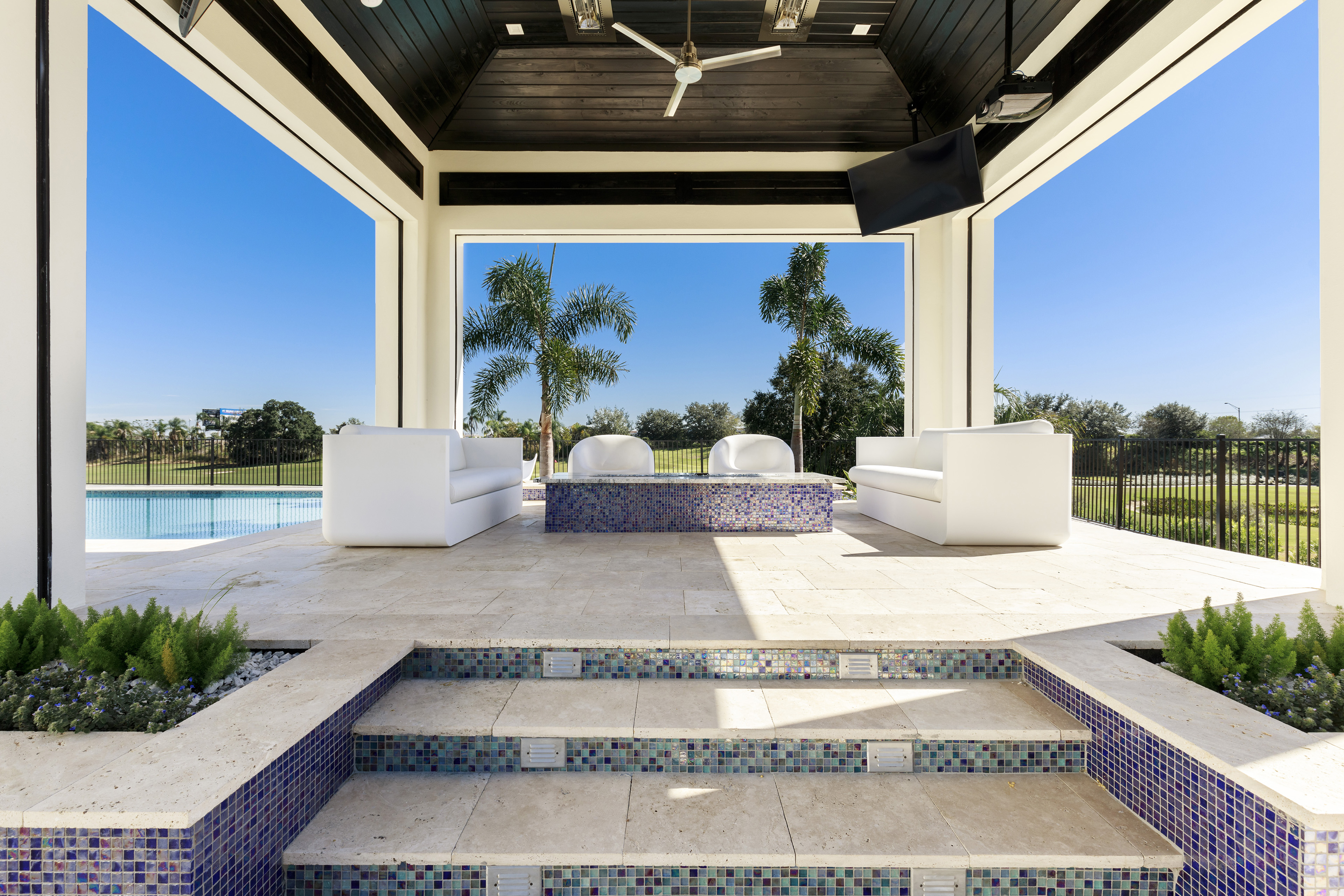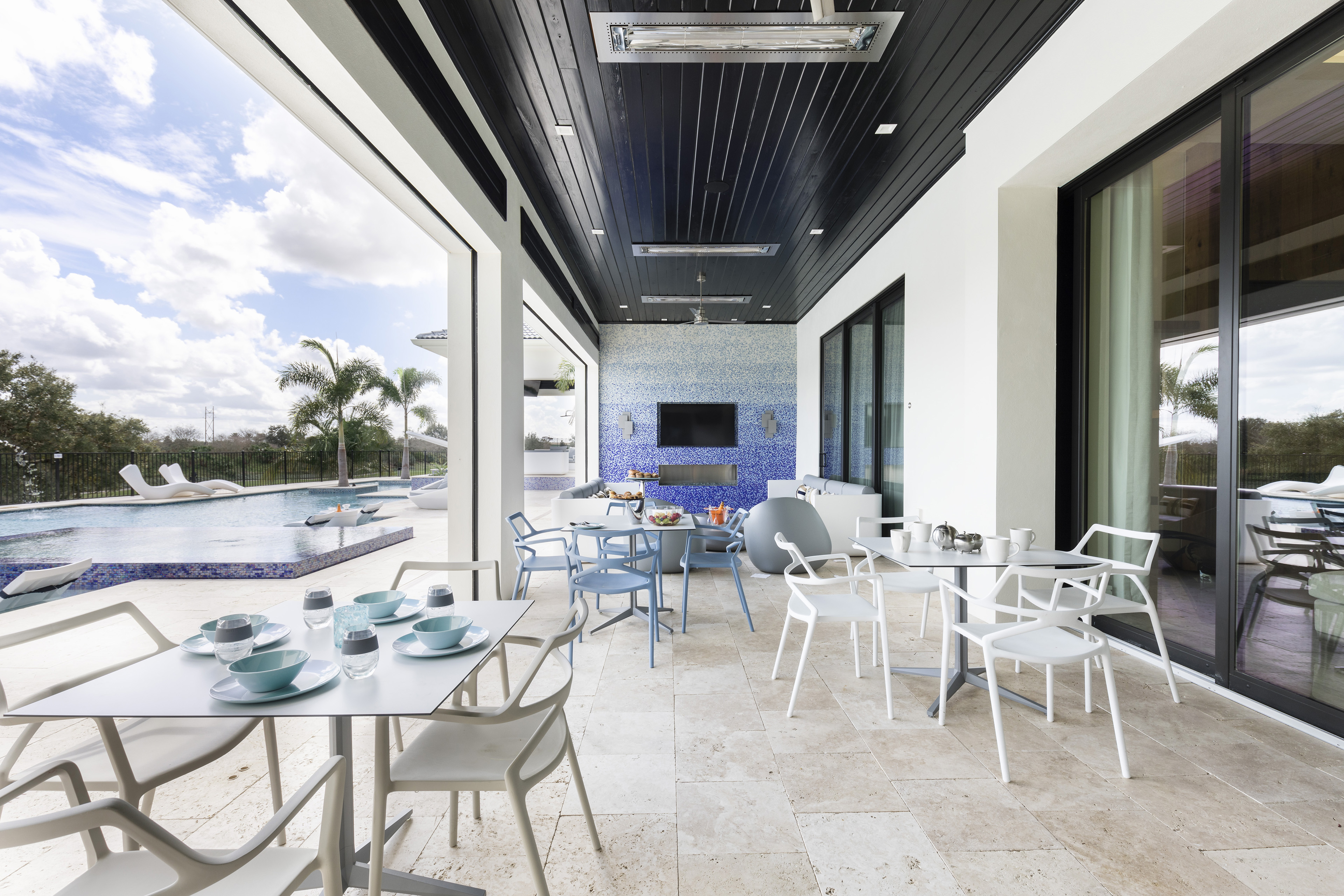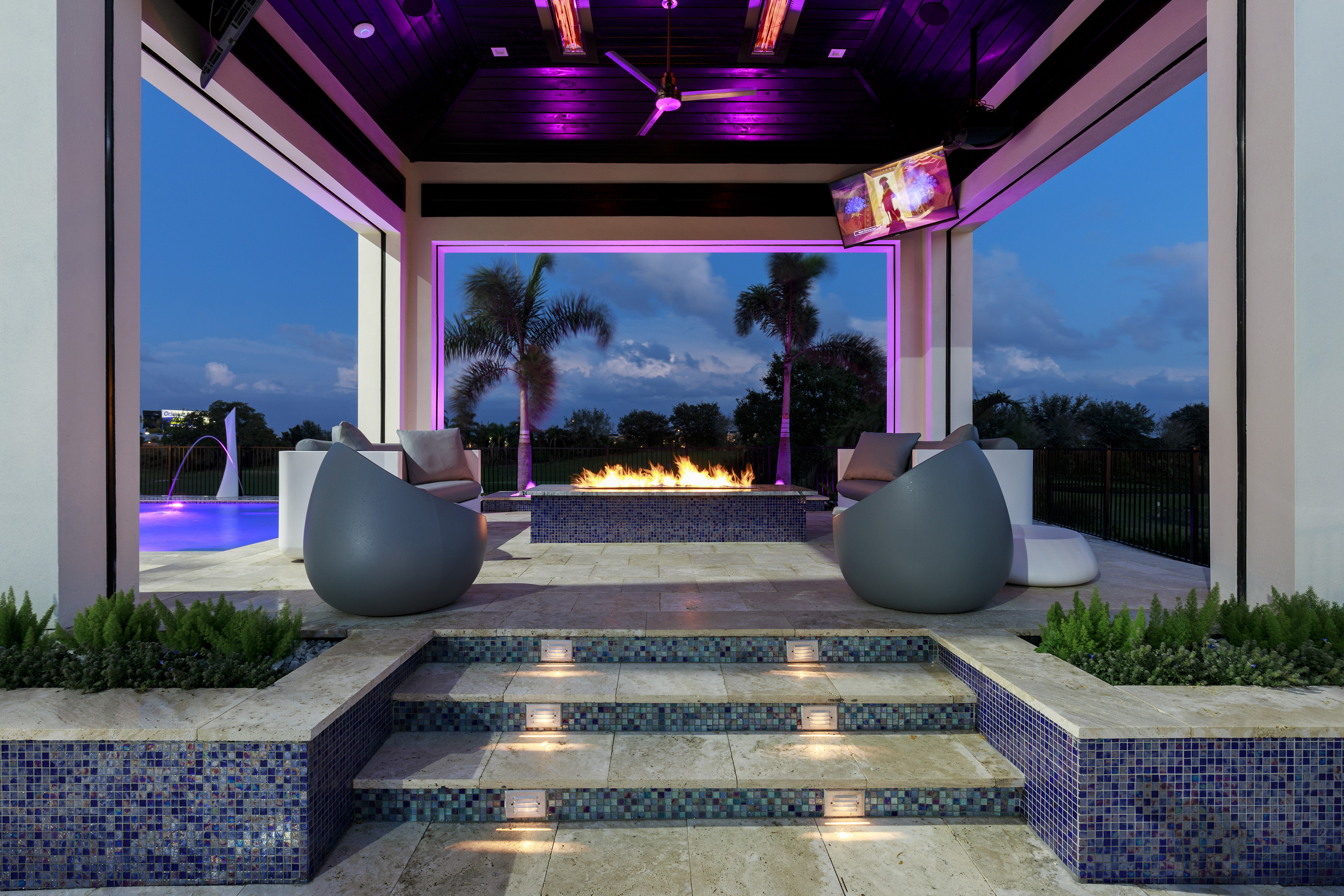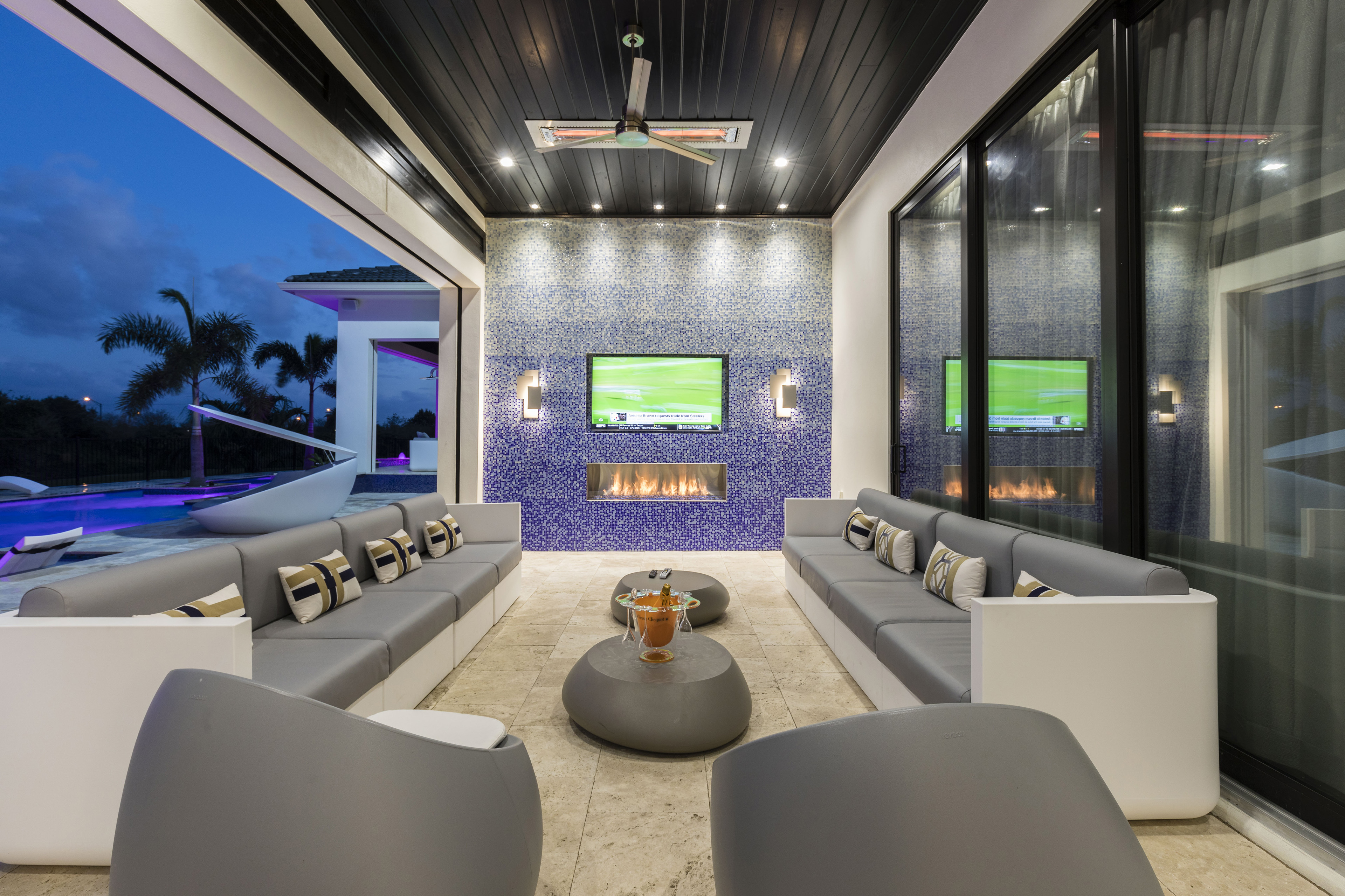 Outdoor heaters under lanai with 2x flat screen TVs, feature fireplace, 2x outdoor sofas, 2x patio chairs, 4x 4 seat tables