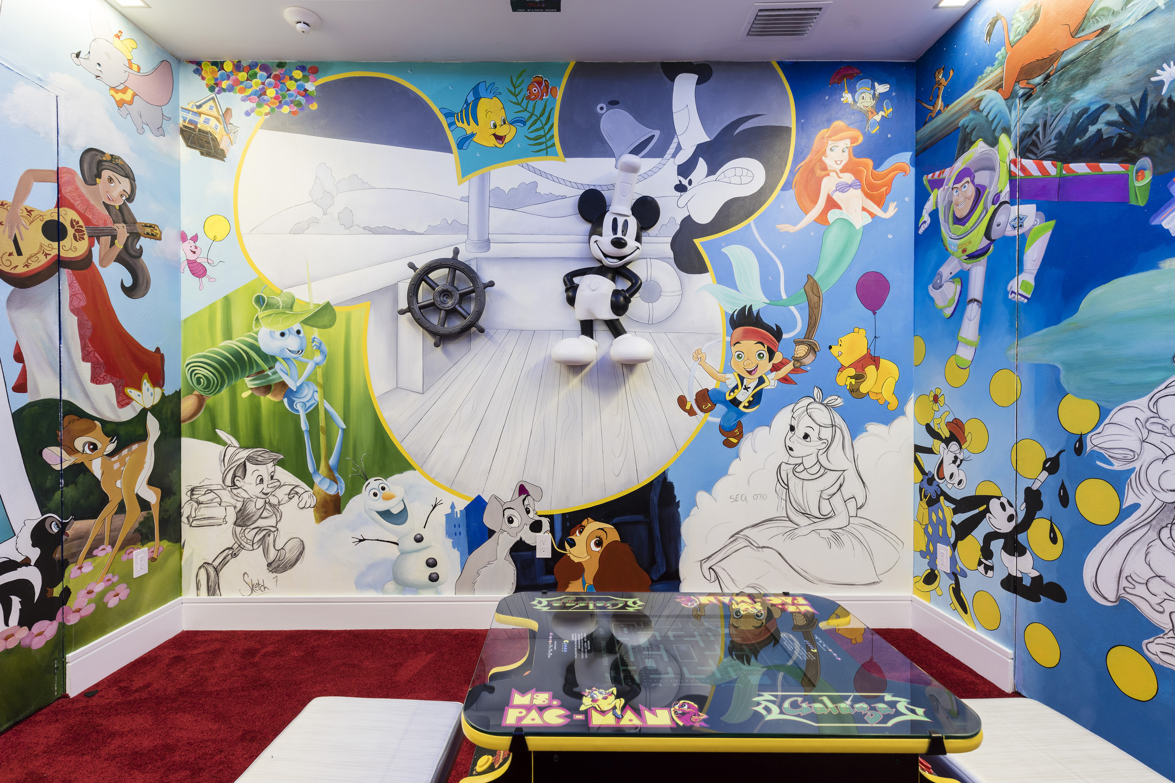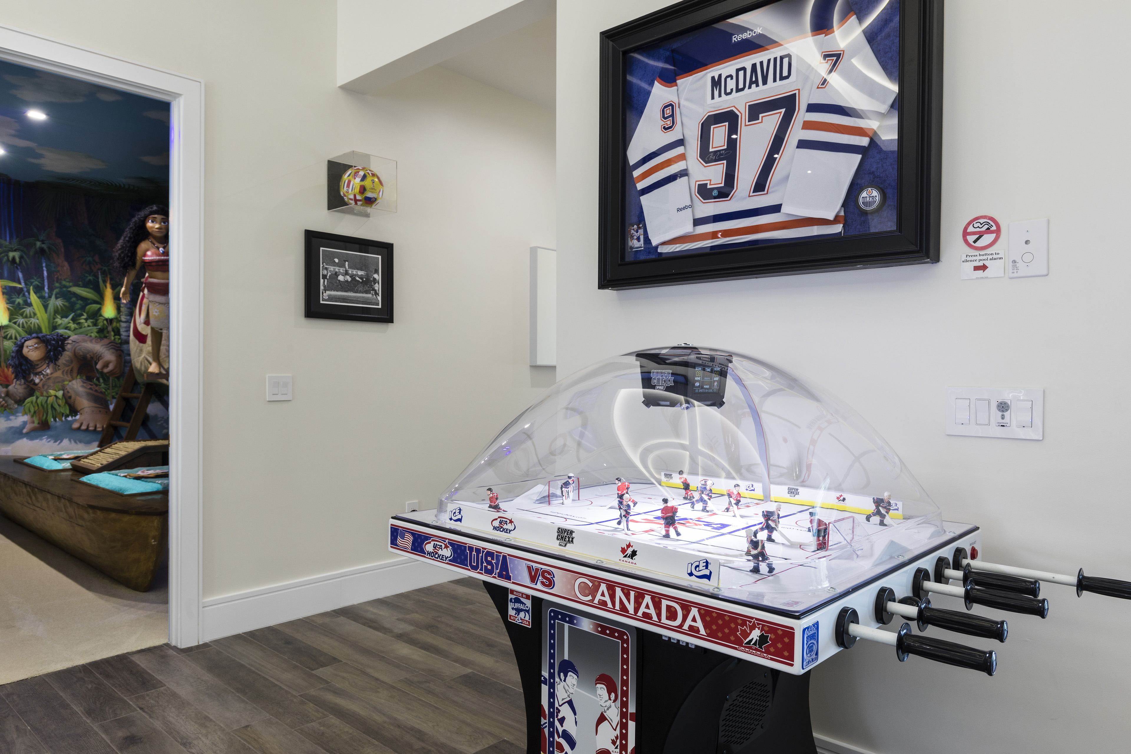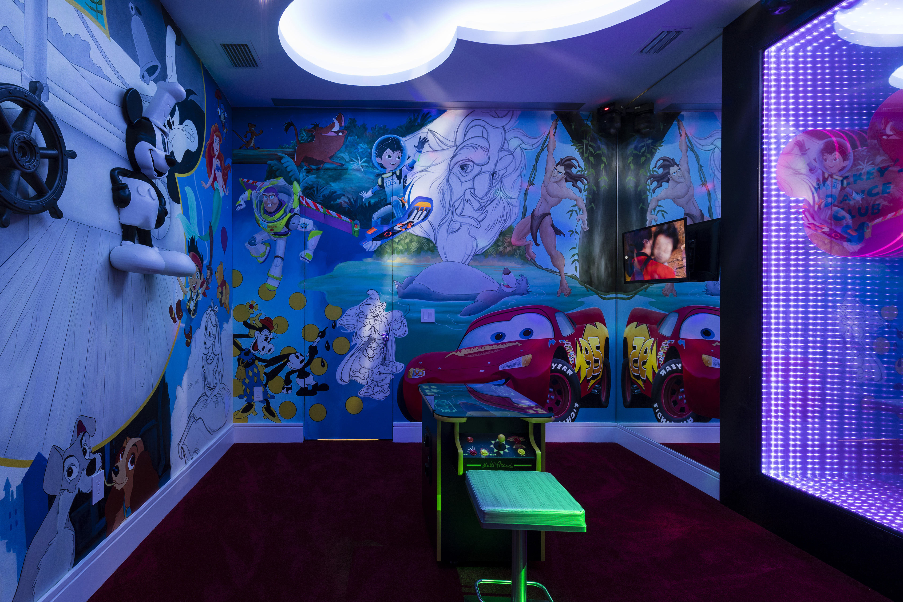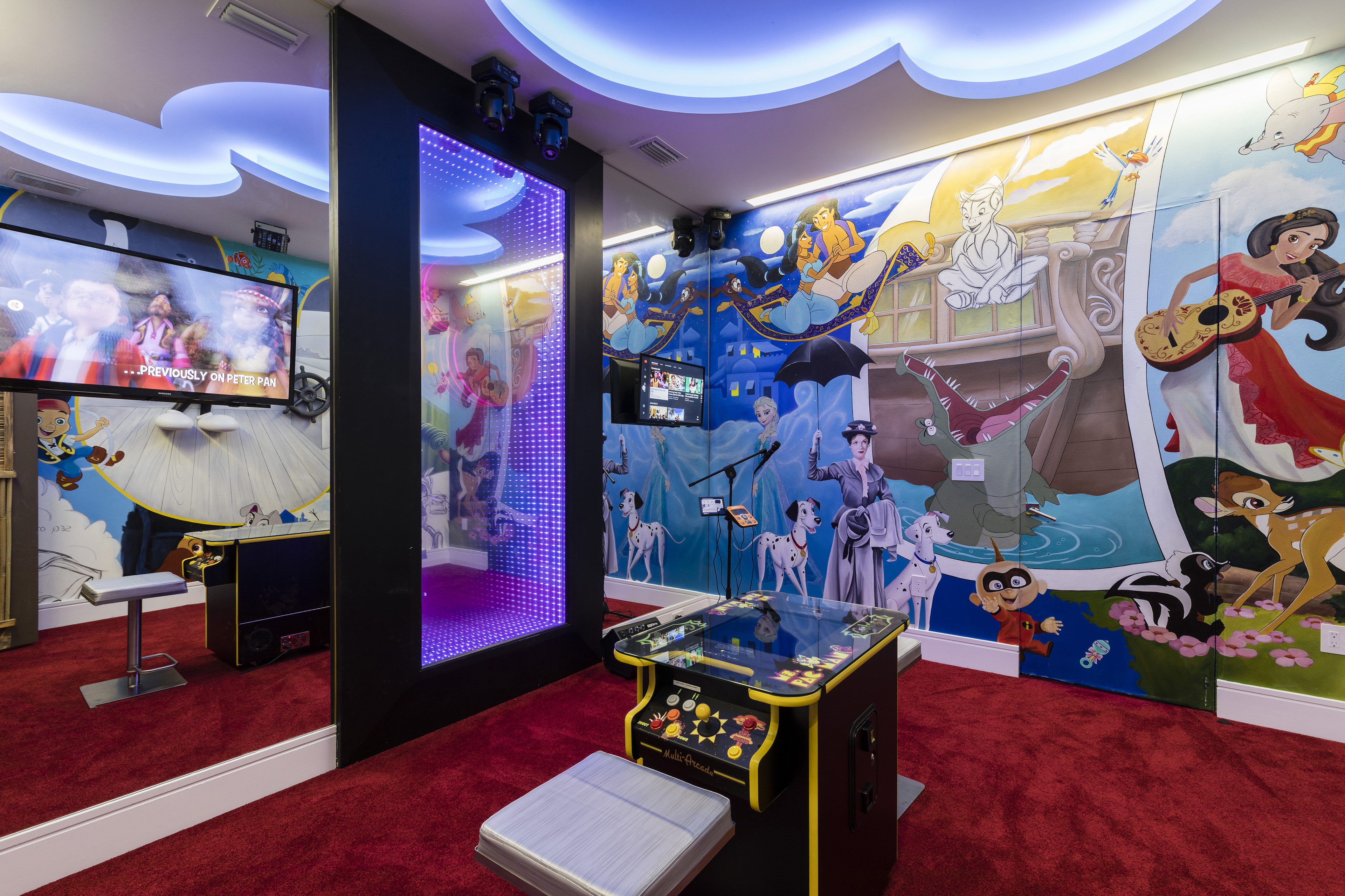 Secret themed kid's playroom has 2x flat screen TVs, multi-arcade video game, karaoke machine